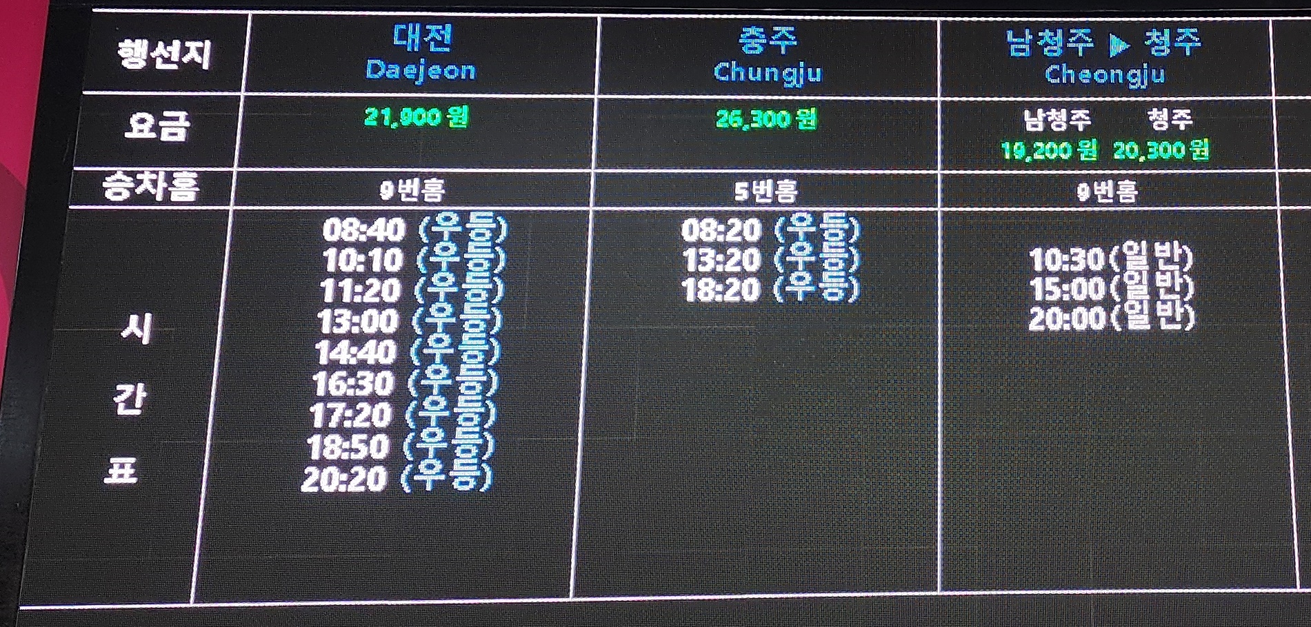 마산출발 대전, 충주, 남정추, 청주 방면.