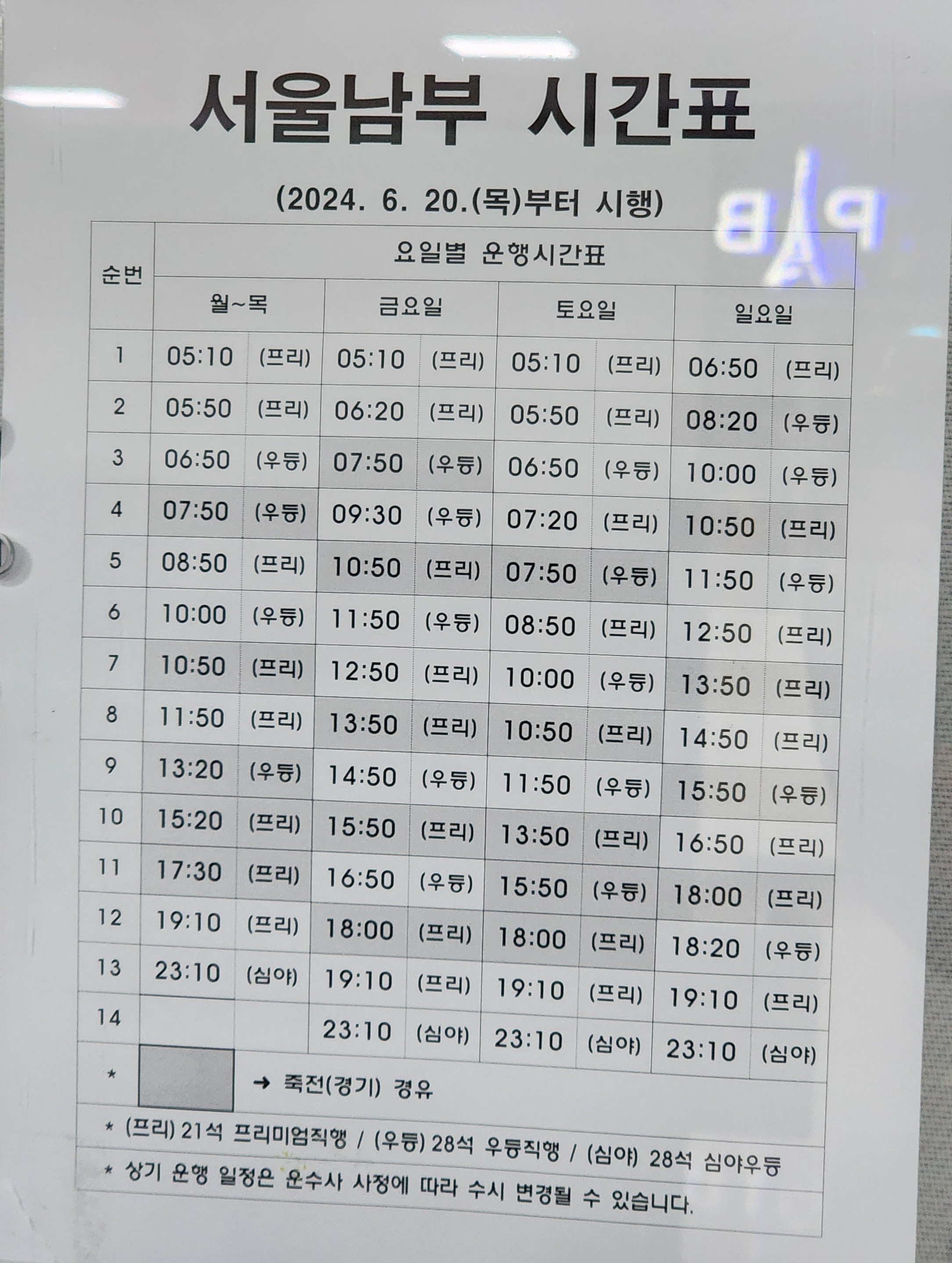 사천 출발 서울남부 시간표.