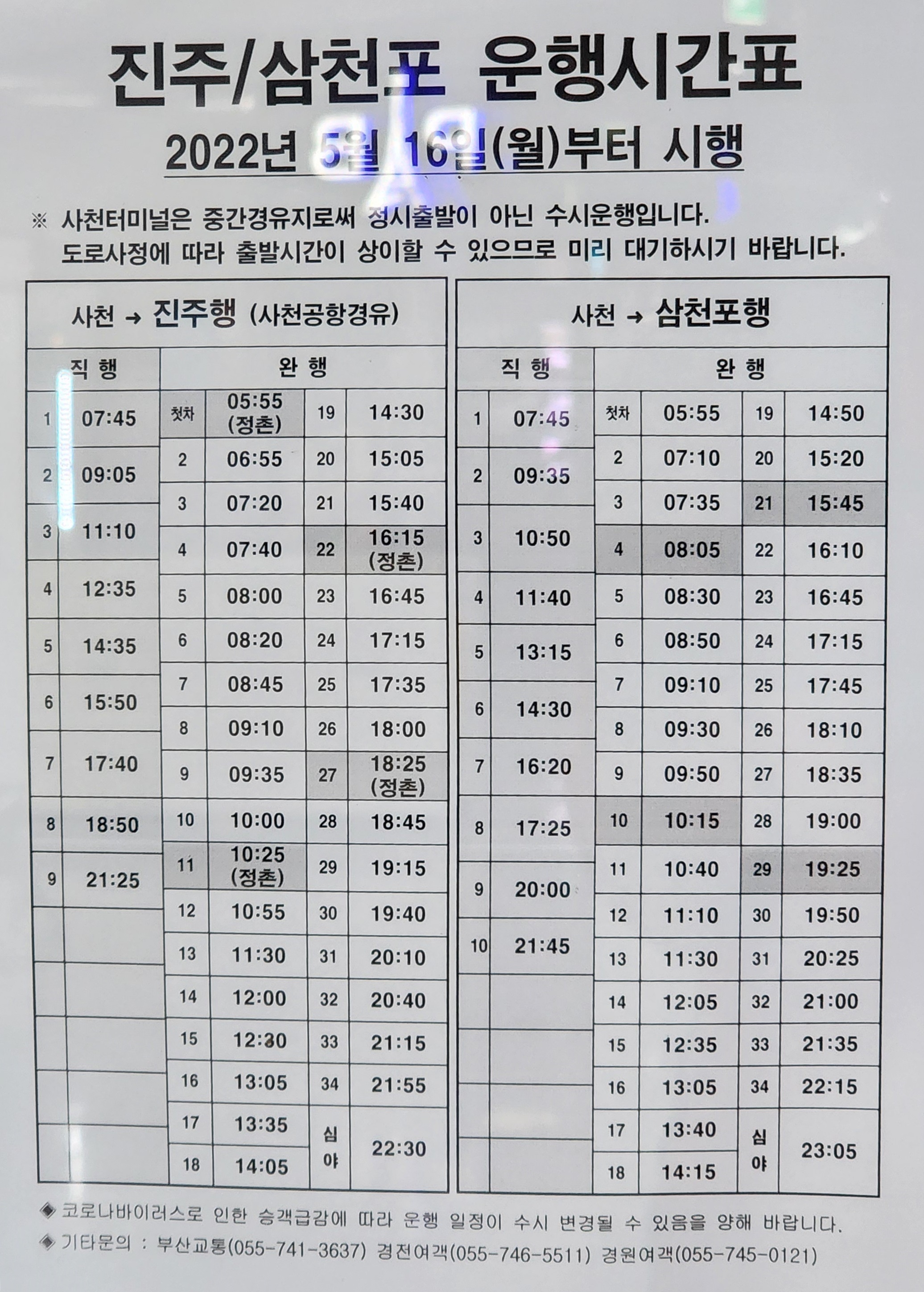 사천 출발 진주, 삼천포 운행시간표.