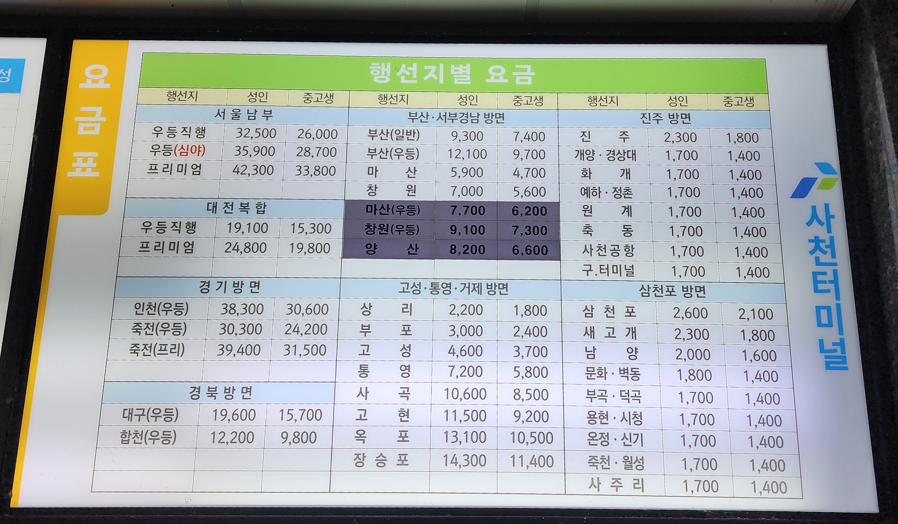 사천시외버스터미널 요금표