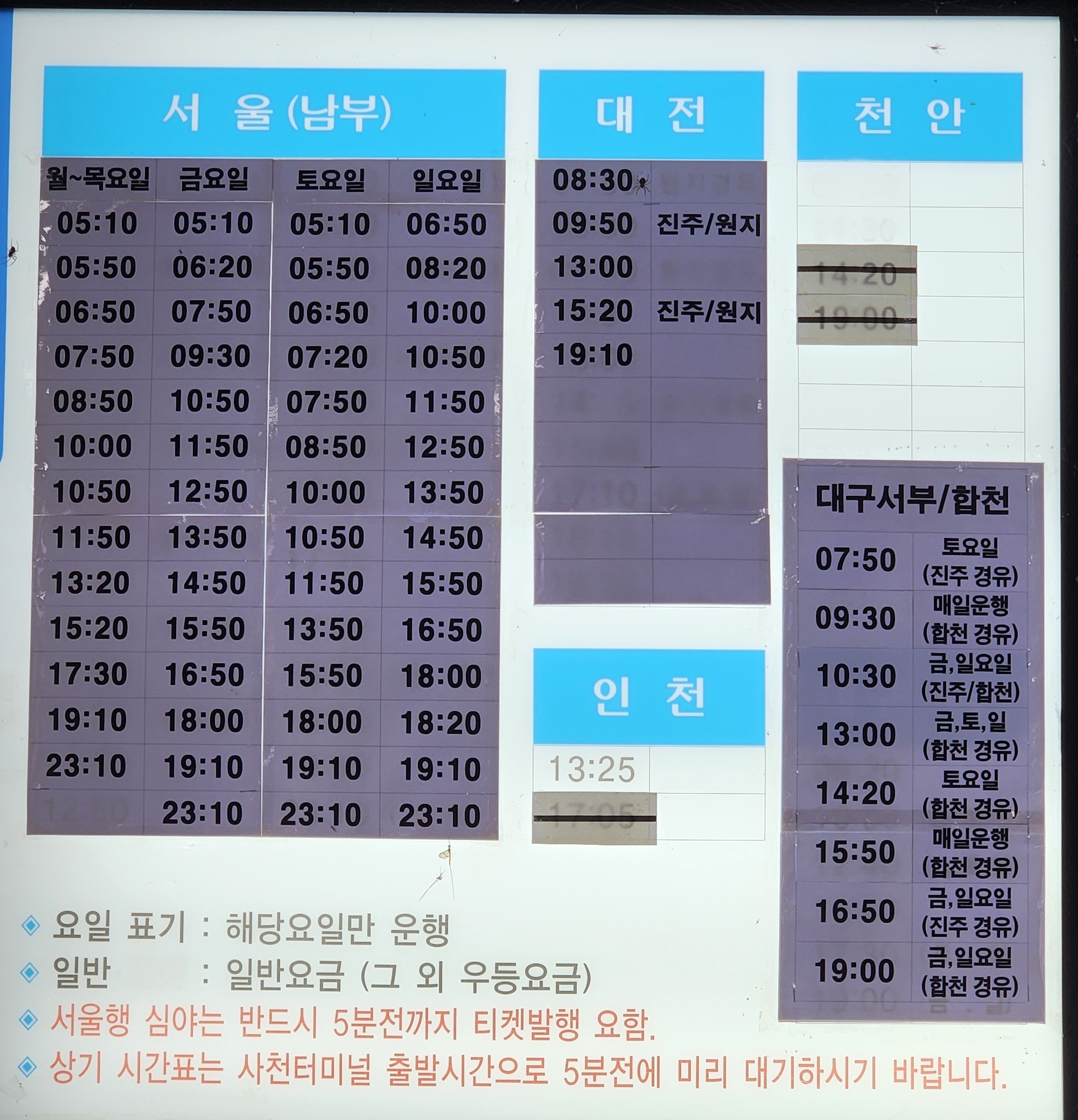 사천 출발 서울 남부, 인천, 대전, 대구 서부, 합천 방면.