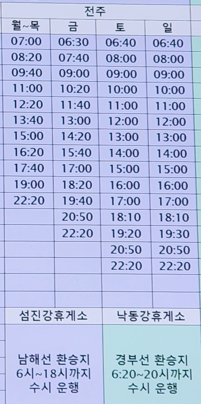 부산 출발 광주, 여수, 여천, 순천 방면.