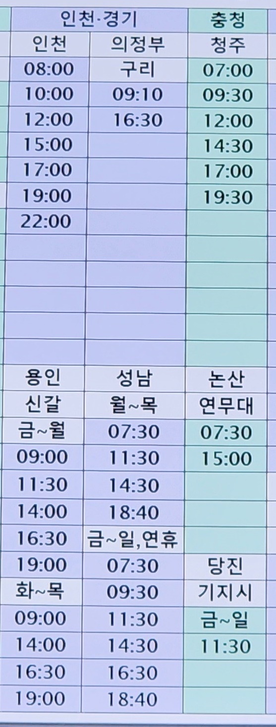 부산 출발 인천, 의정부, 구리, 청주, 용인, 신갈, 성남, 논산, 연무대, 당진, 기지시 방면.