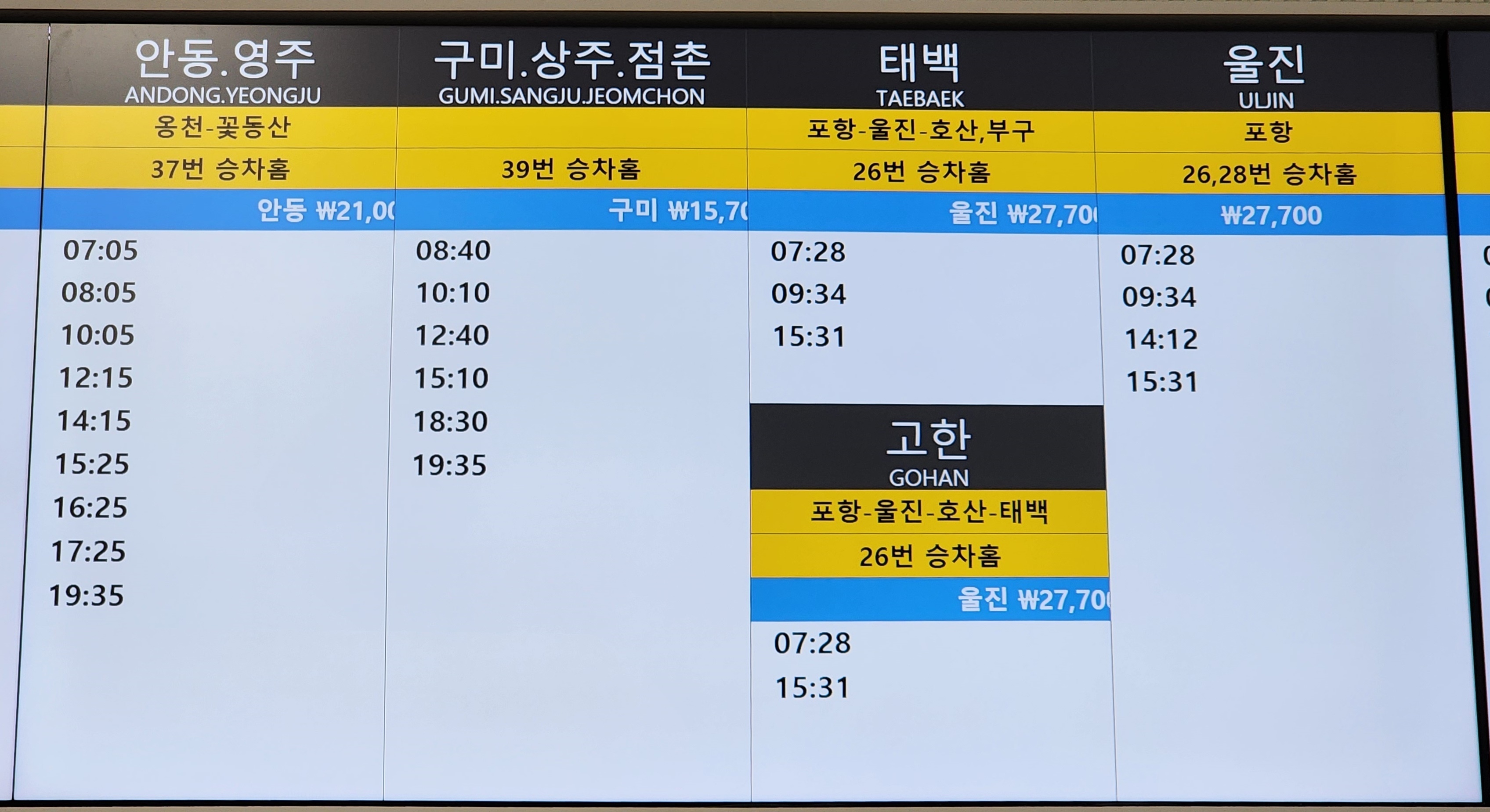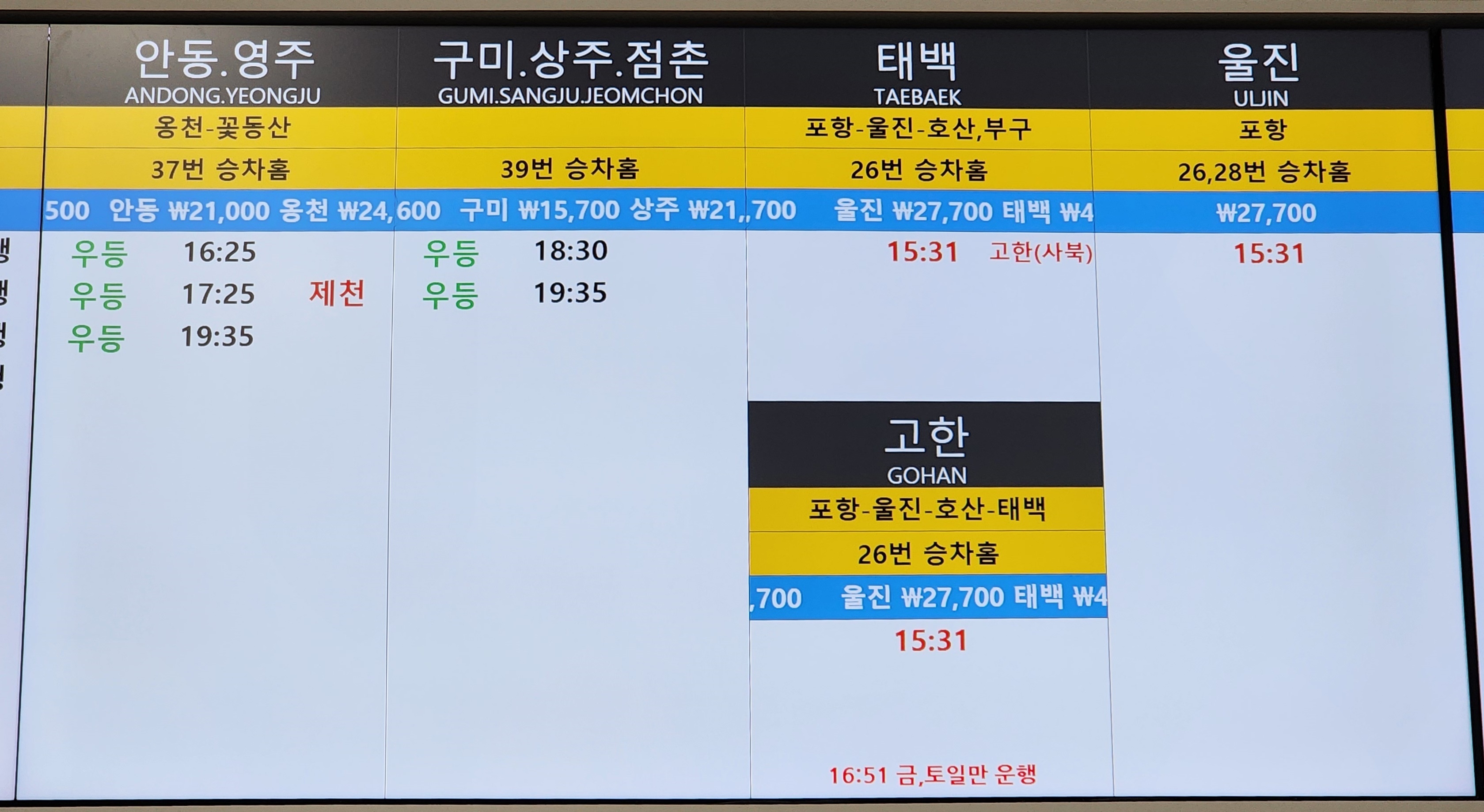 노포 출발 안동, 영주, 구미, 상주, 점촌, 태백, 고한, 울진 방면.