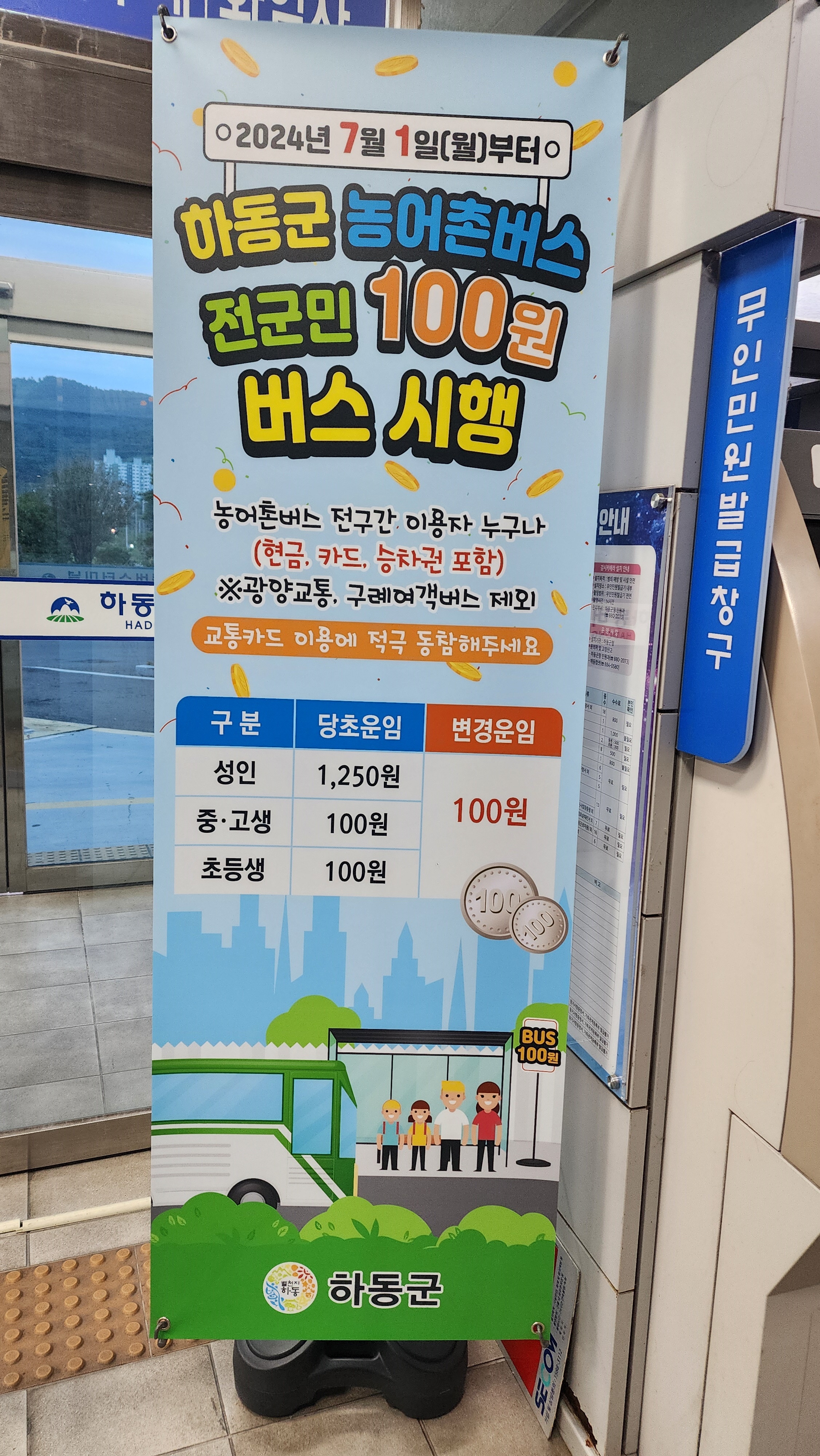 하동 관내 농어촌버스 요금 100원.