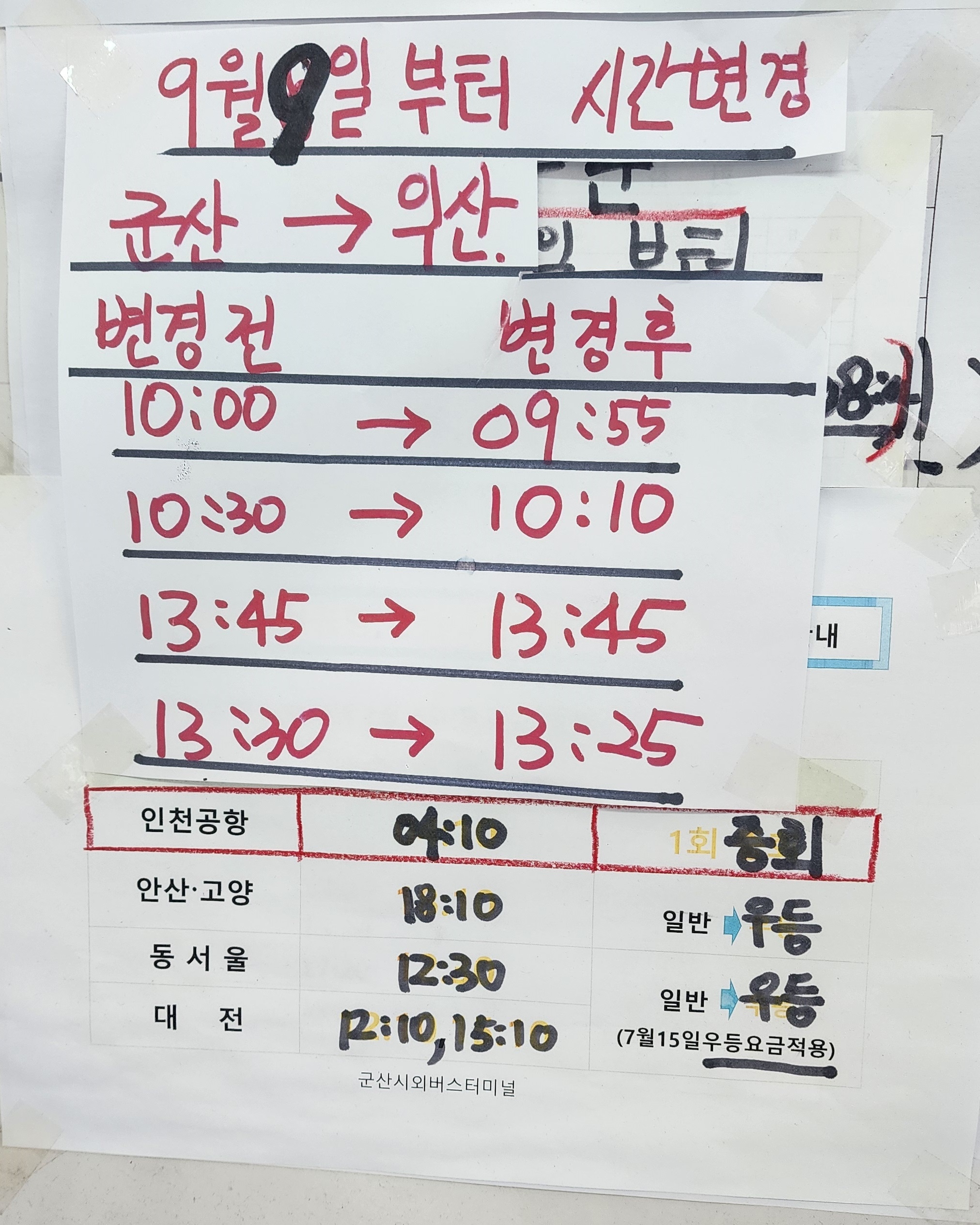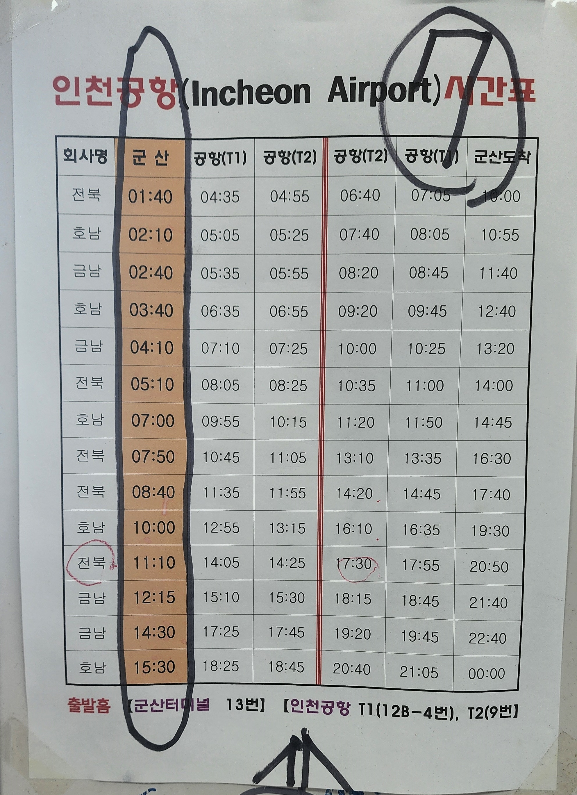 군산 출발 인천공항, 동서울, 인천, 오산, 수원, 성남, 안산, 고양 방면.
