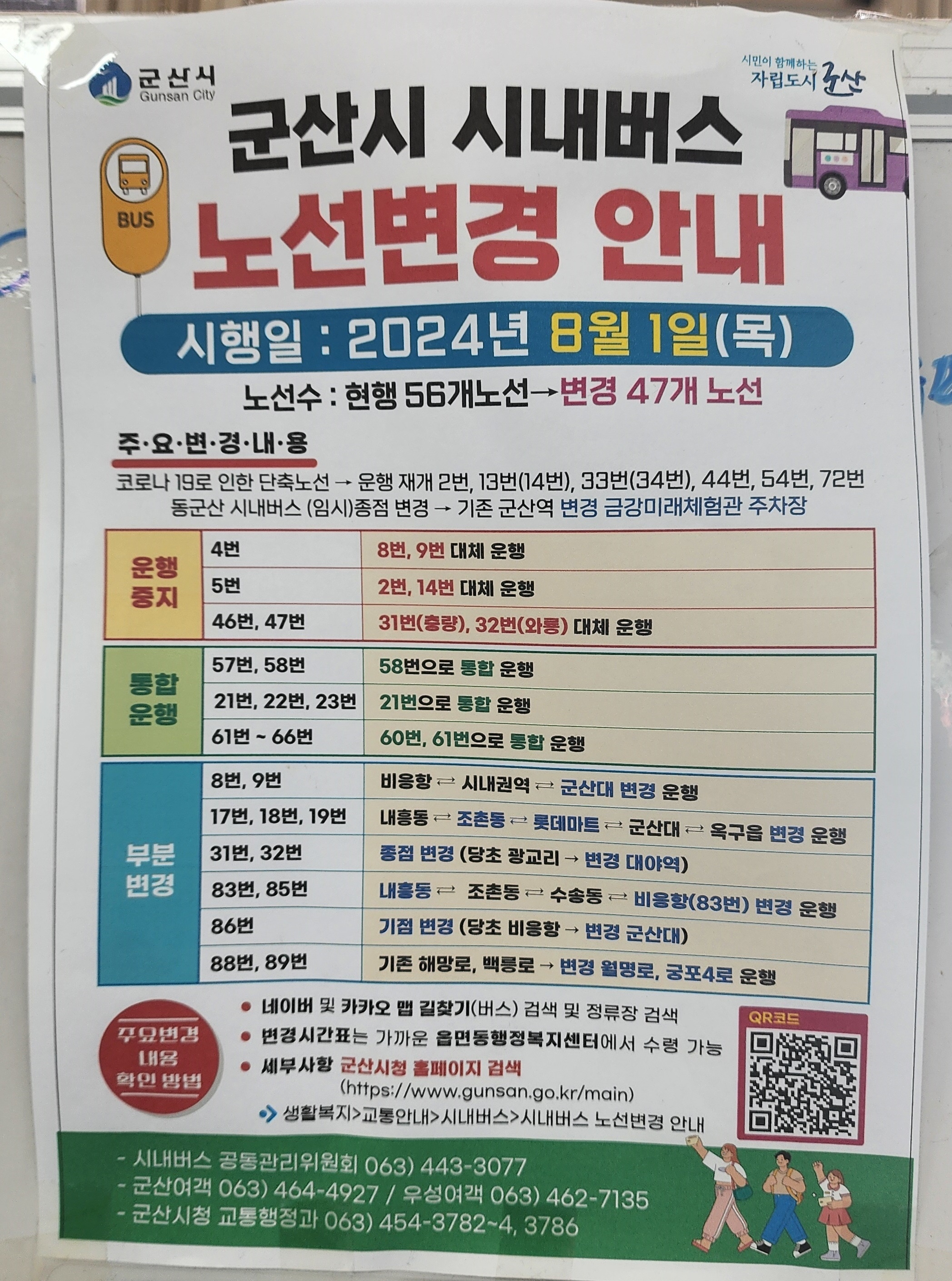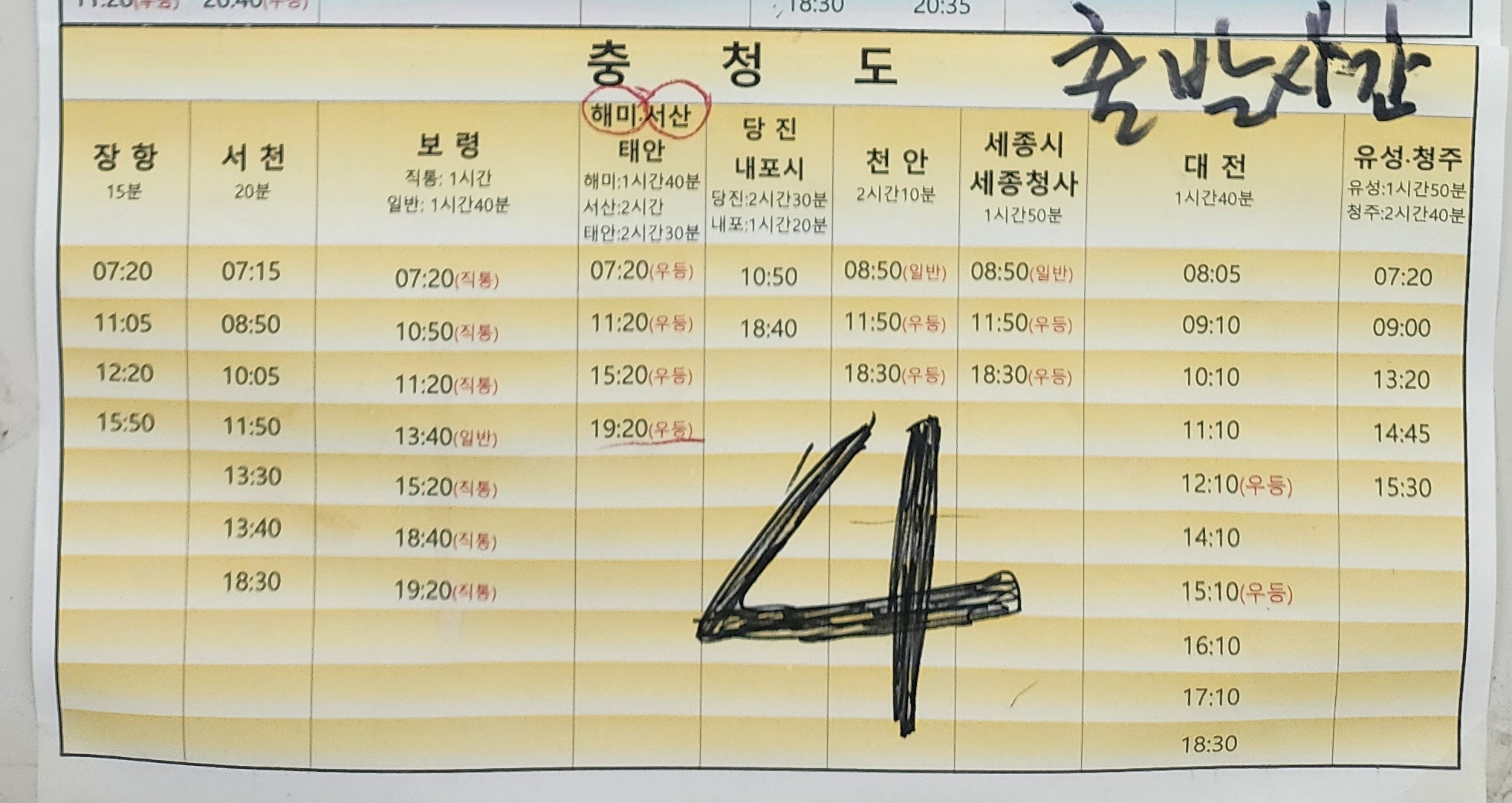 군산 출발 장항, 서천, 보령, 해미, 서산, 태안, 당진, 내포시, 천안, 세종시 세종청사, 대전, 유성, 청주 방면.