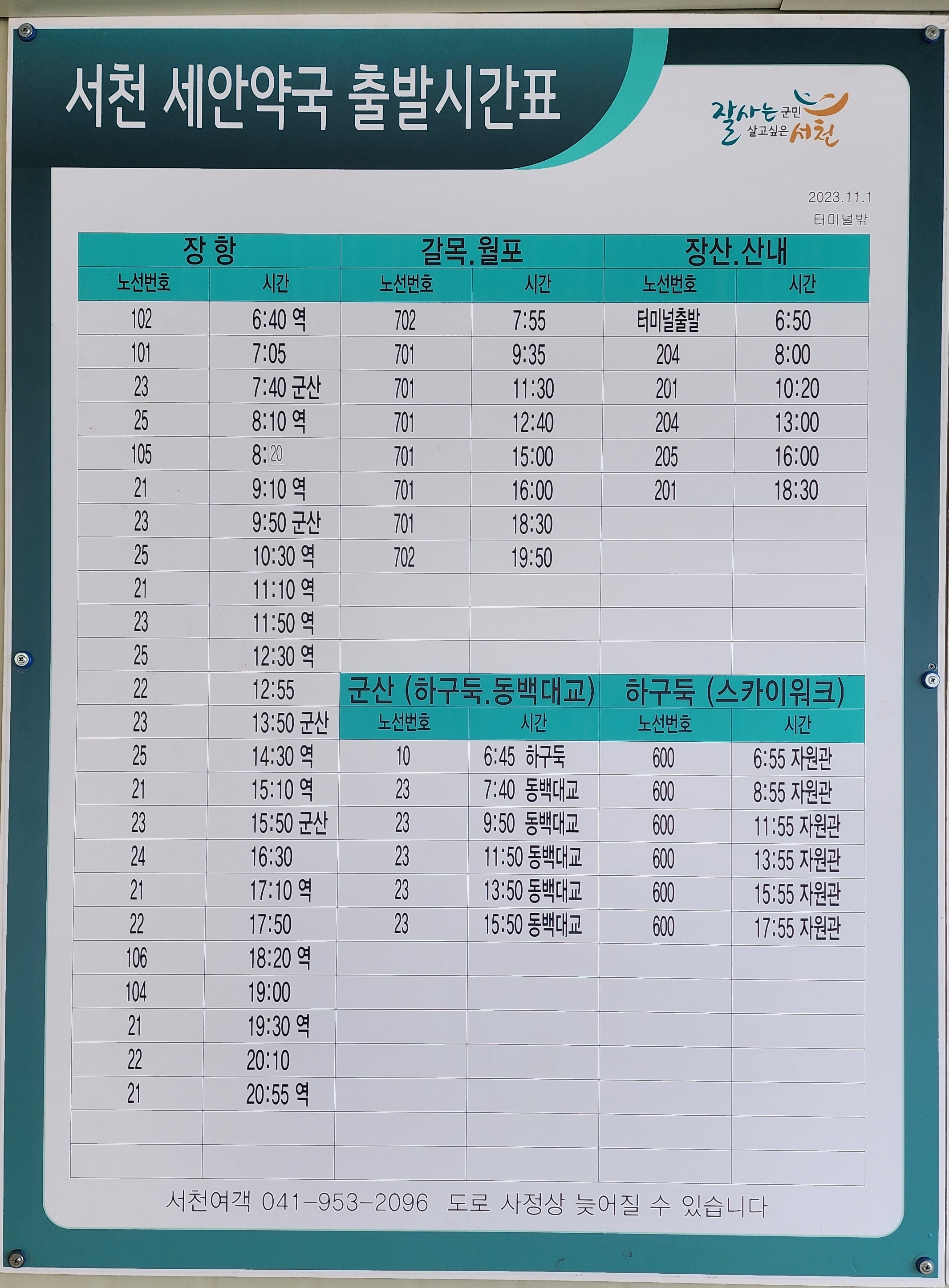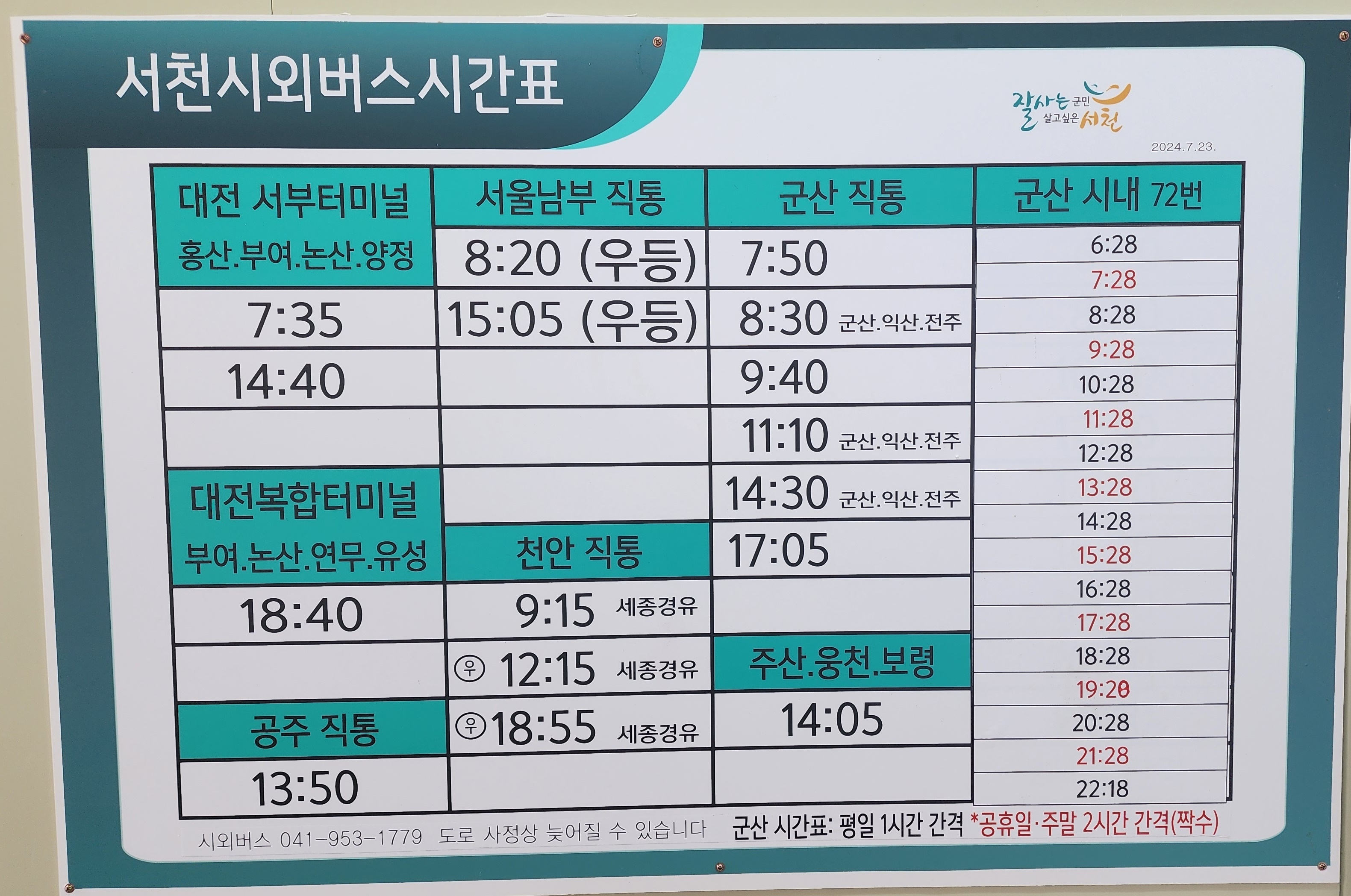 서천시외버스터미널 출발 대전 서부터미널, 흥산, 부여, 논산, 양정, 대전복합터미널 부여,논산, 연무, 유성,