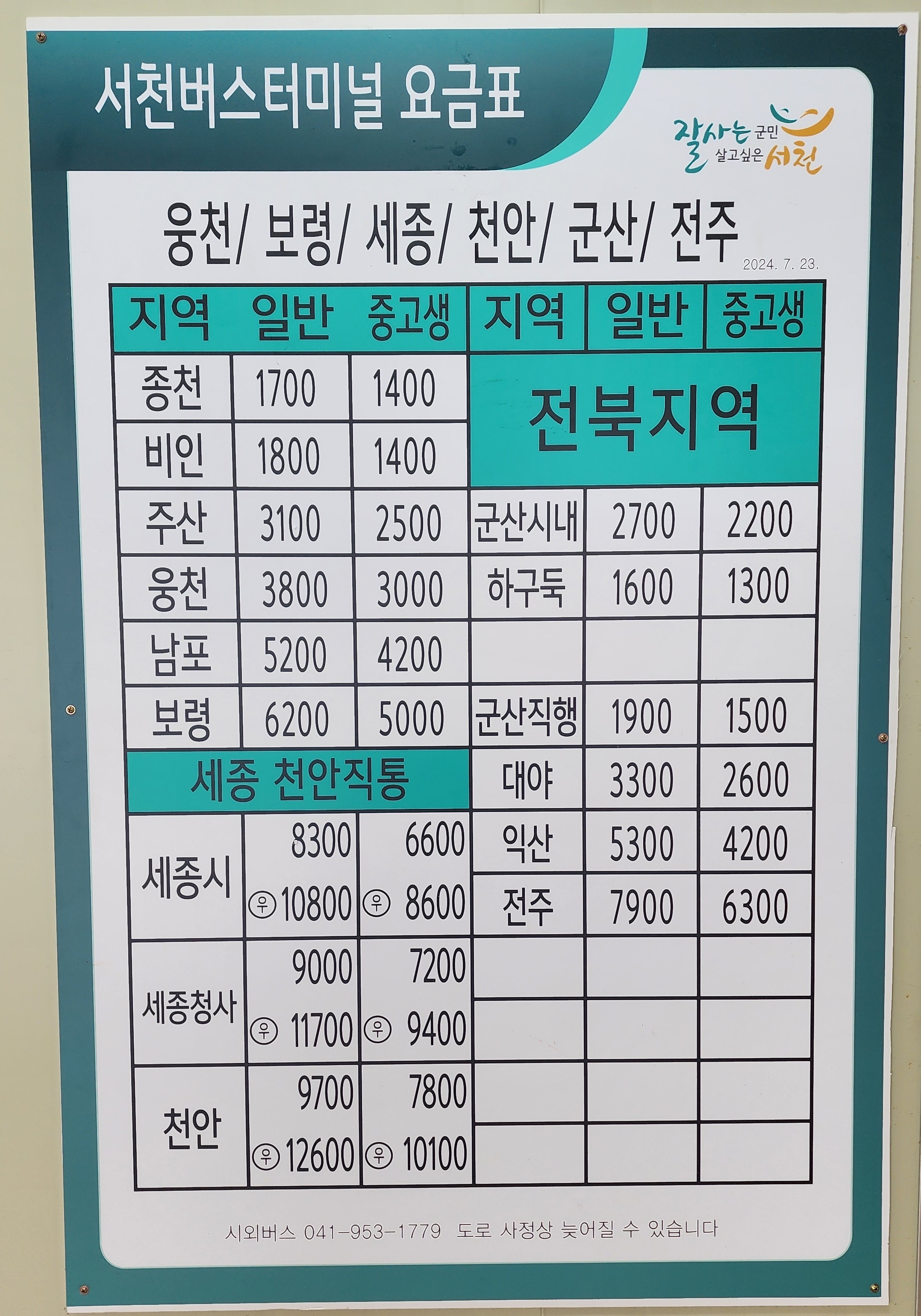 서천시외버스터미널 출발 대전 서부터미널, 흥산, 부여, 논산, 양정, 대전복합터미널 부여,논산, 연무, 유성,