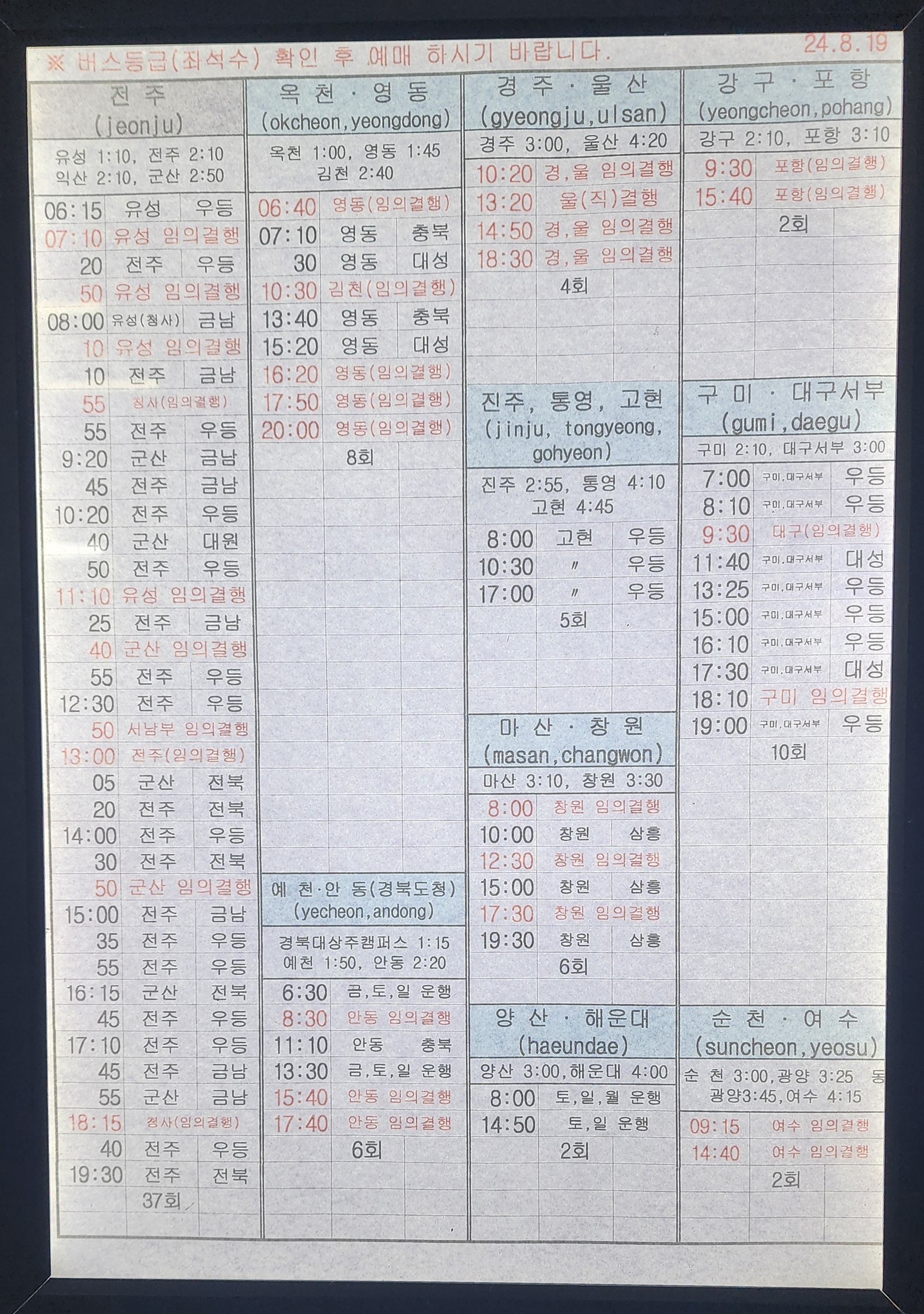 청주 출발 전주, 옥천, 영동, 예천, 안동, 경주, 울산, 진주, 통영, 고현, 마산, 창원, 양산, 해운대, 깅구, 포항, 구미, 대구서부,순천, 여수 방면.