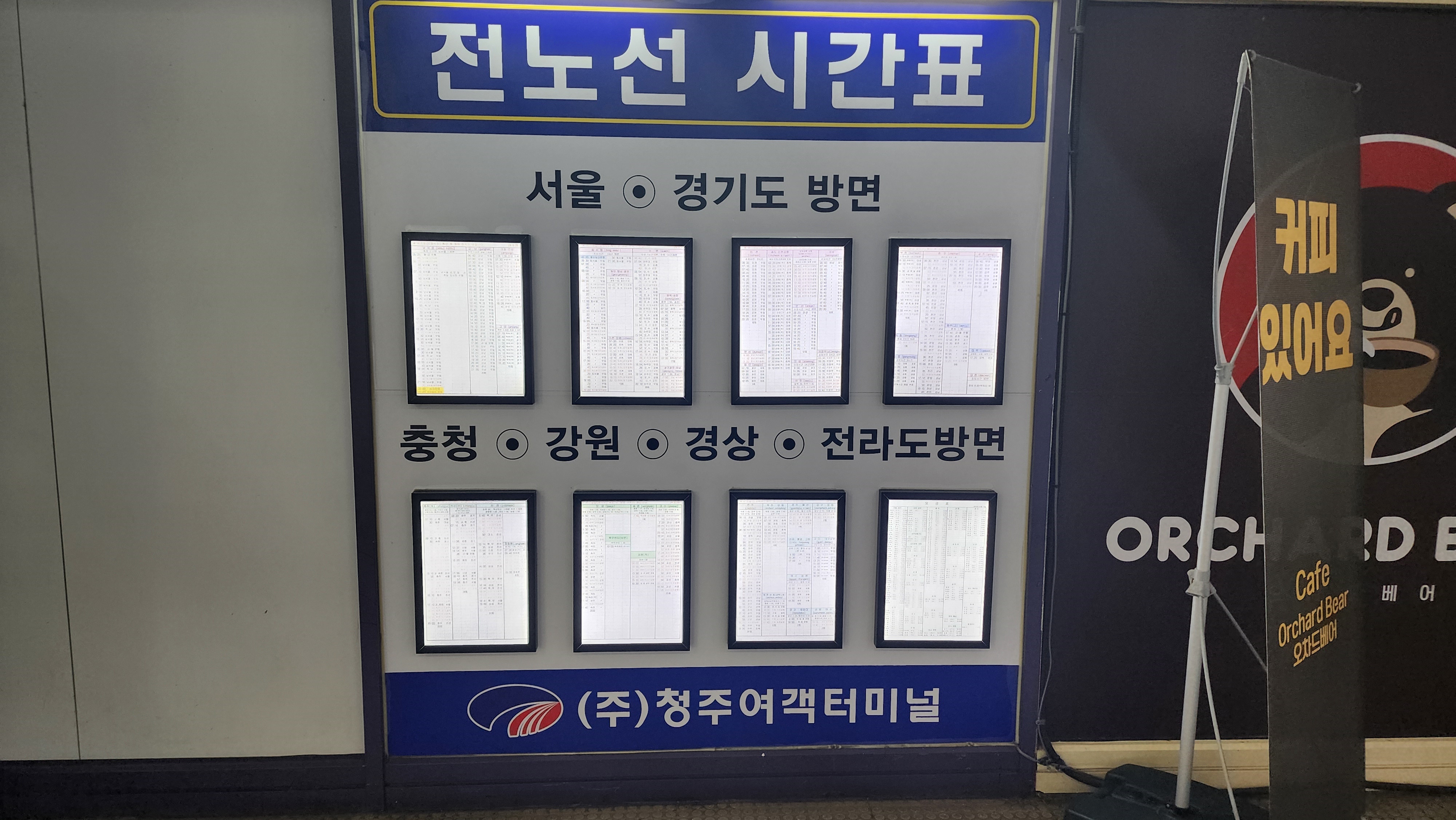 청주 출발 부천, 동송, 강릉, 천안, 원주, 공주, 태백, 대전 방면.