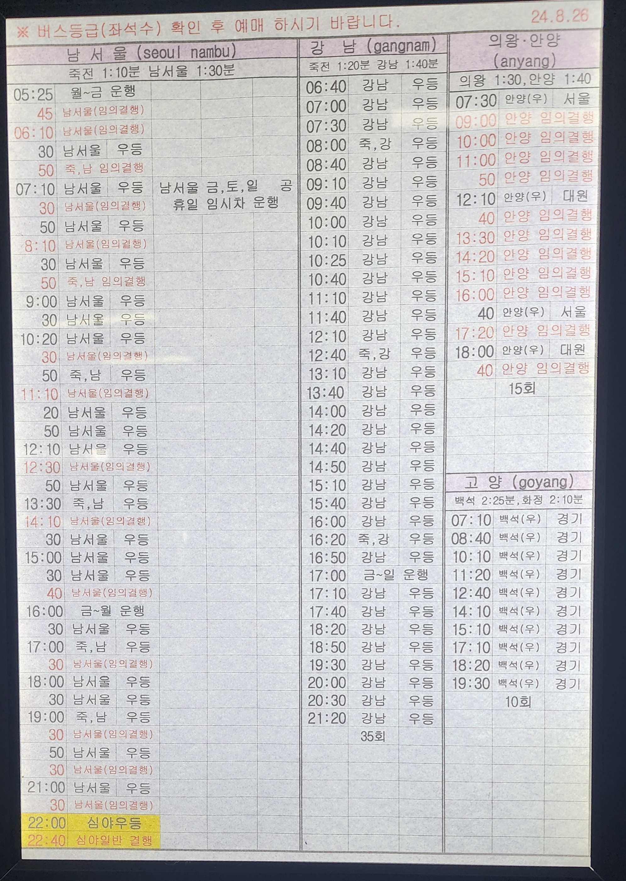 청주 출발 남서울, 강남, 의왕, 안양, 고양 방면.