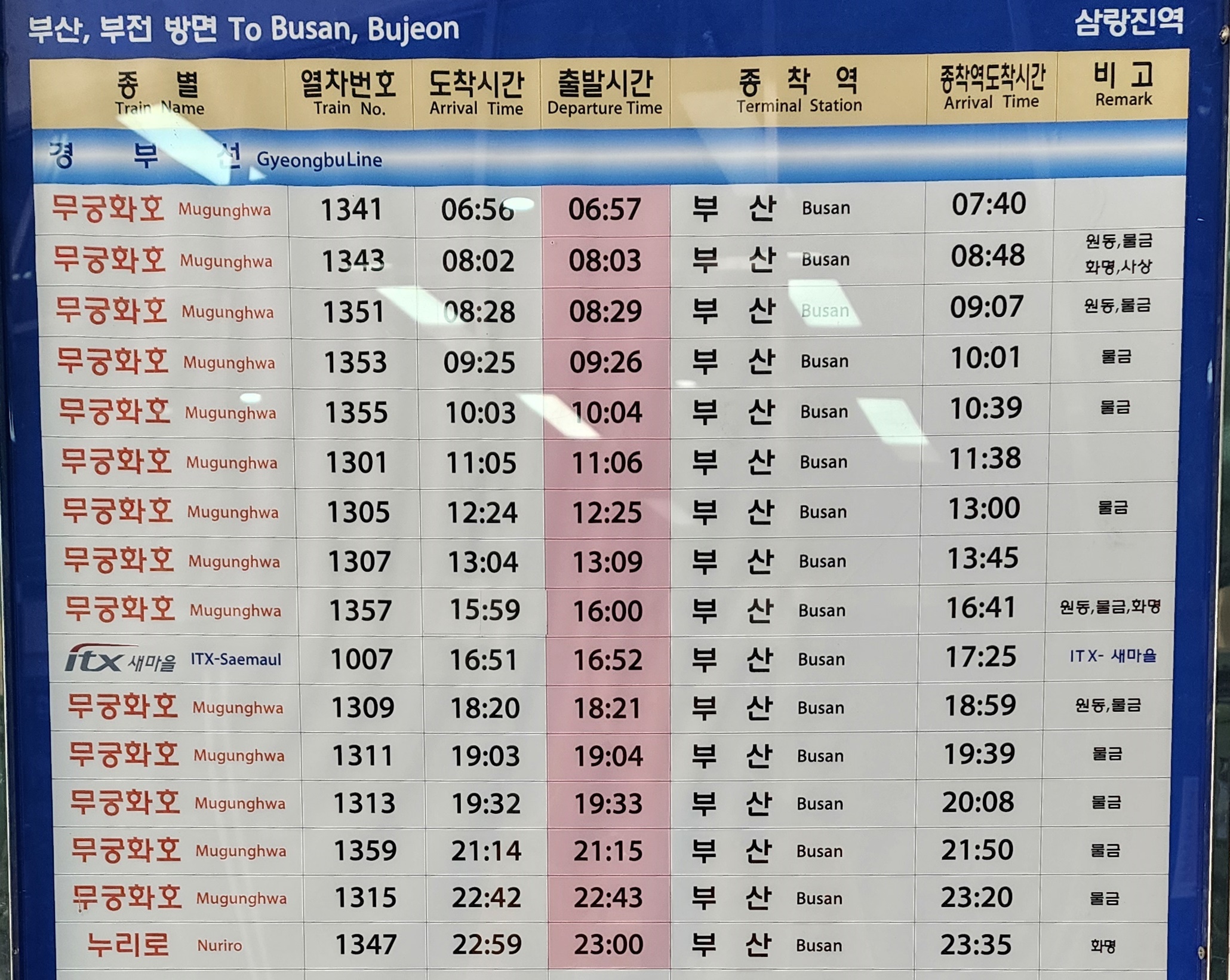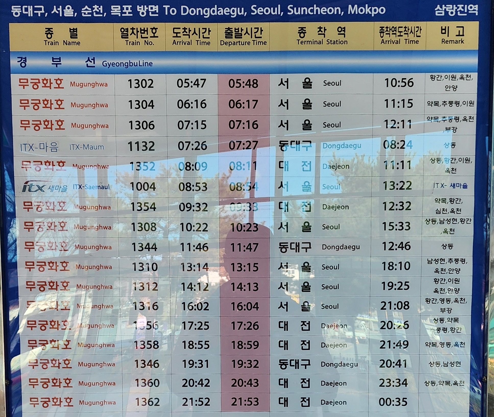 삼랑진역 출발 동대구, 대전, 서울 방면.