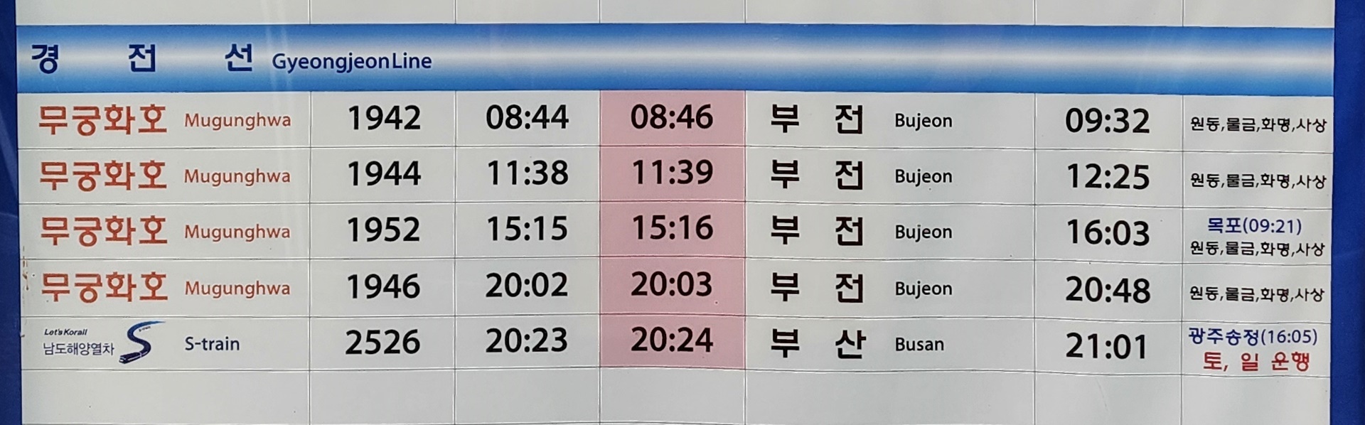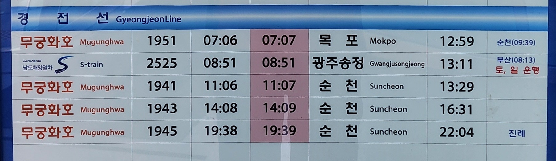 삼랑진역 출발 목포, 광주송정, 순천 방면.