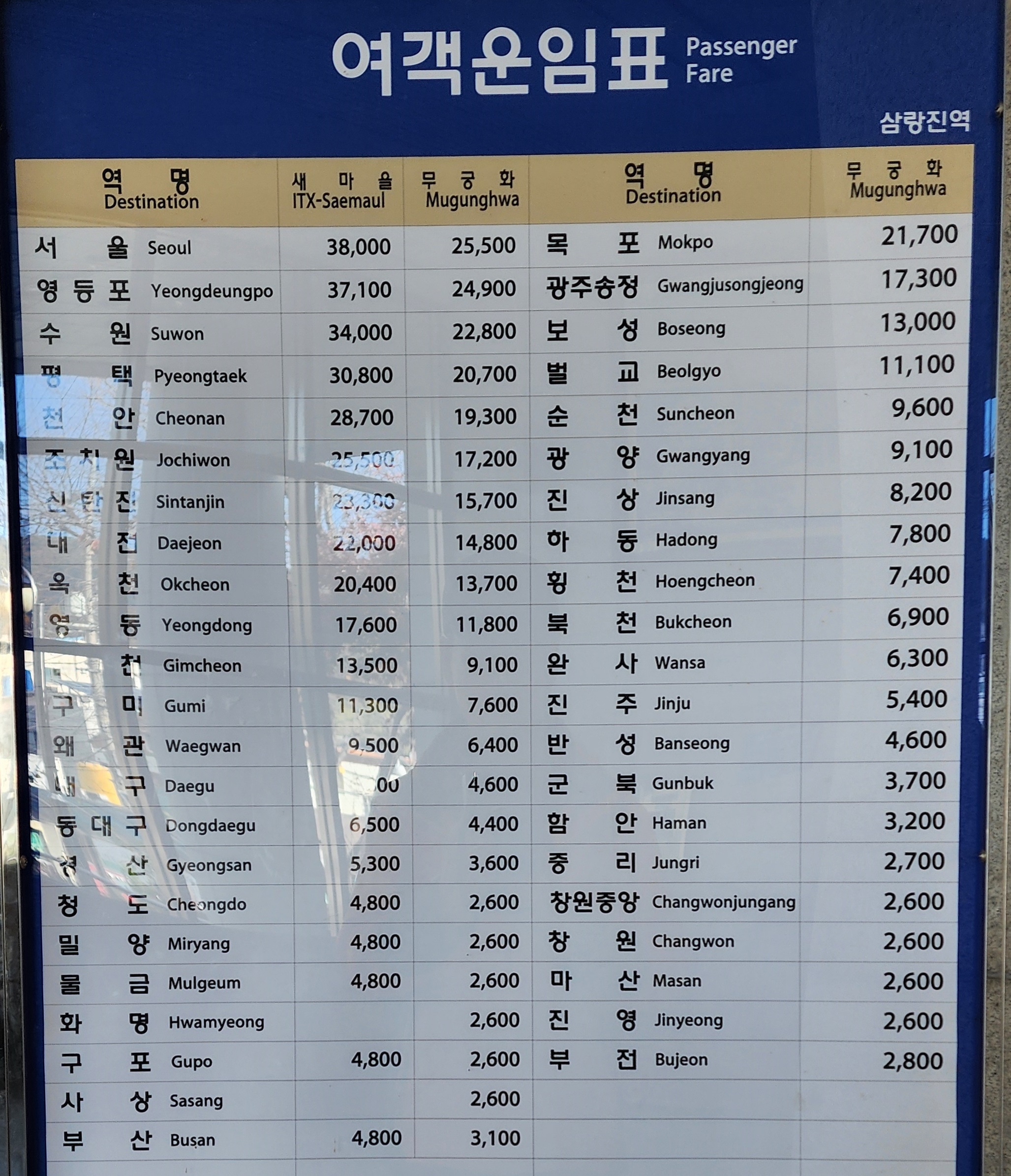삼랑진역 여객운임표