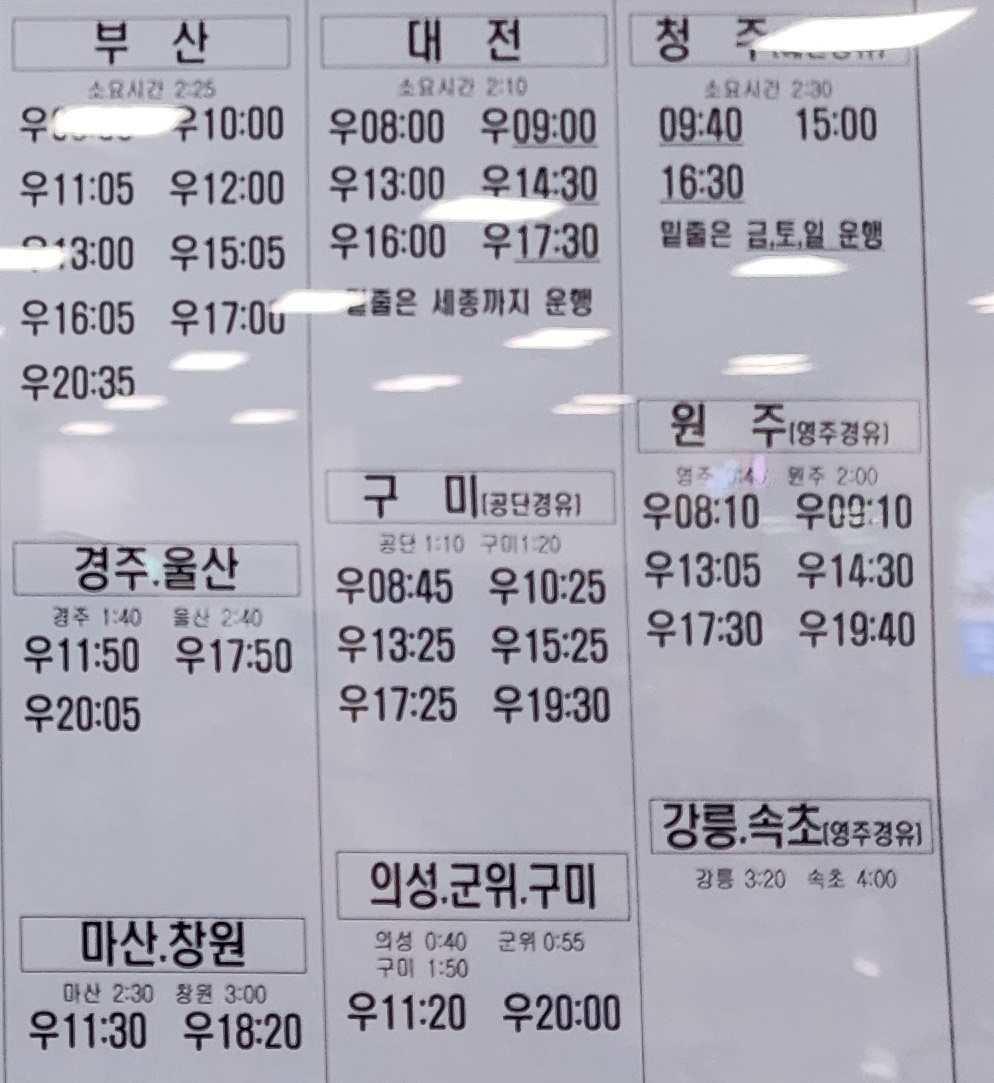 안동 출발 부산, 경주, 울산, 마산, 창원, 대전, 구미, 의성, 군위, 구미, 청주, 원주, 강릉, 속초 방면.