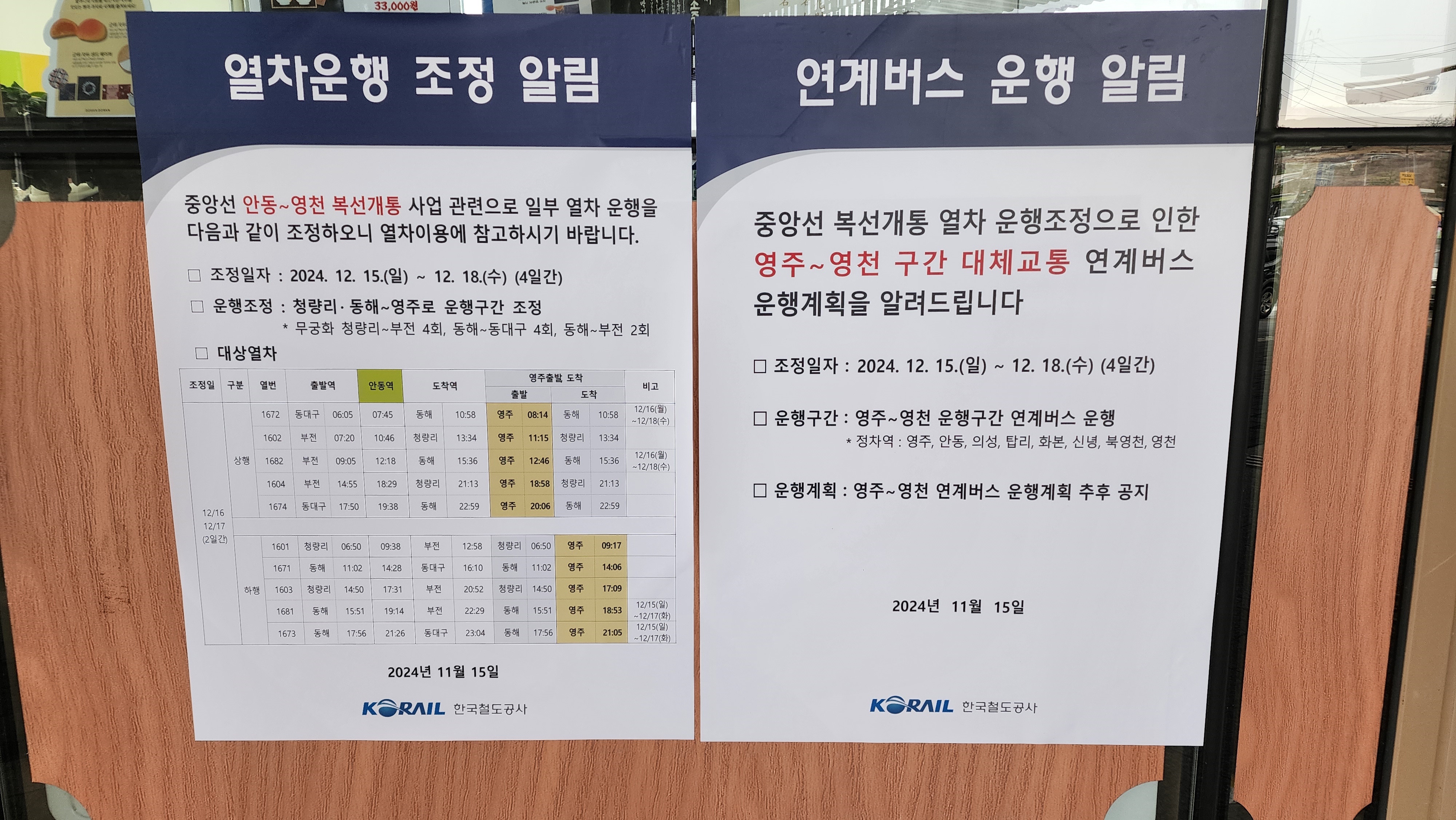 중앙선 복선개통 열차 운행조정으로 인한 열차운행구간 조정