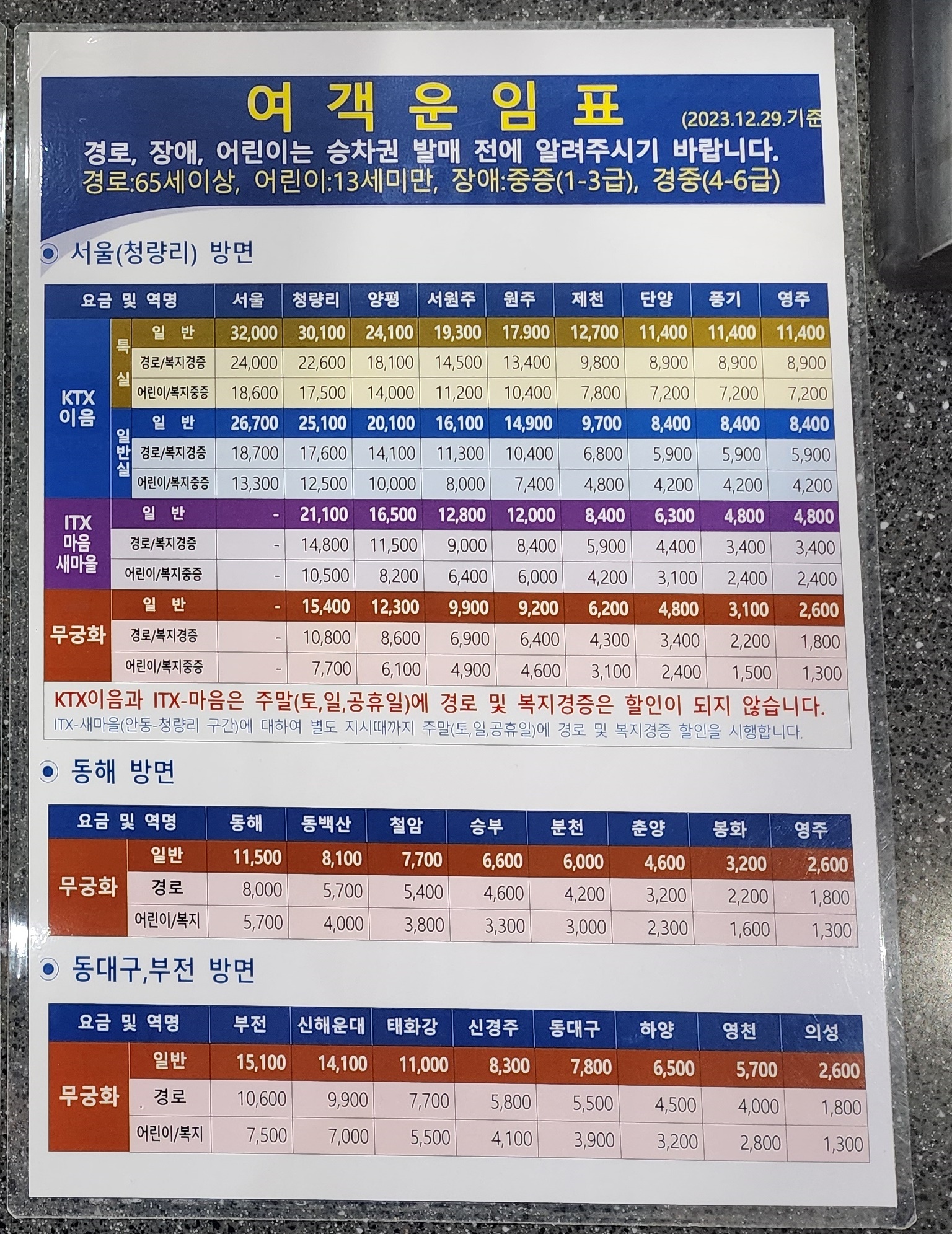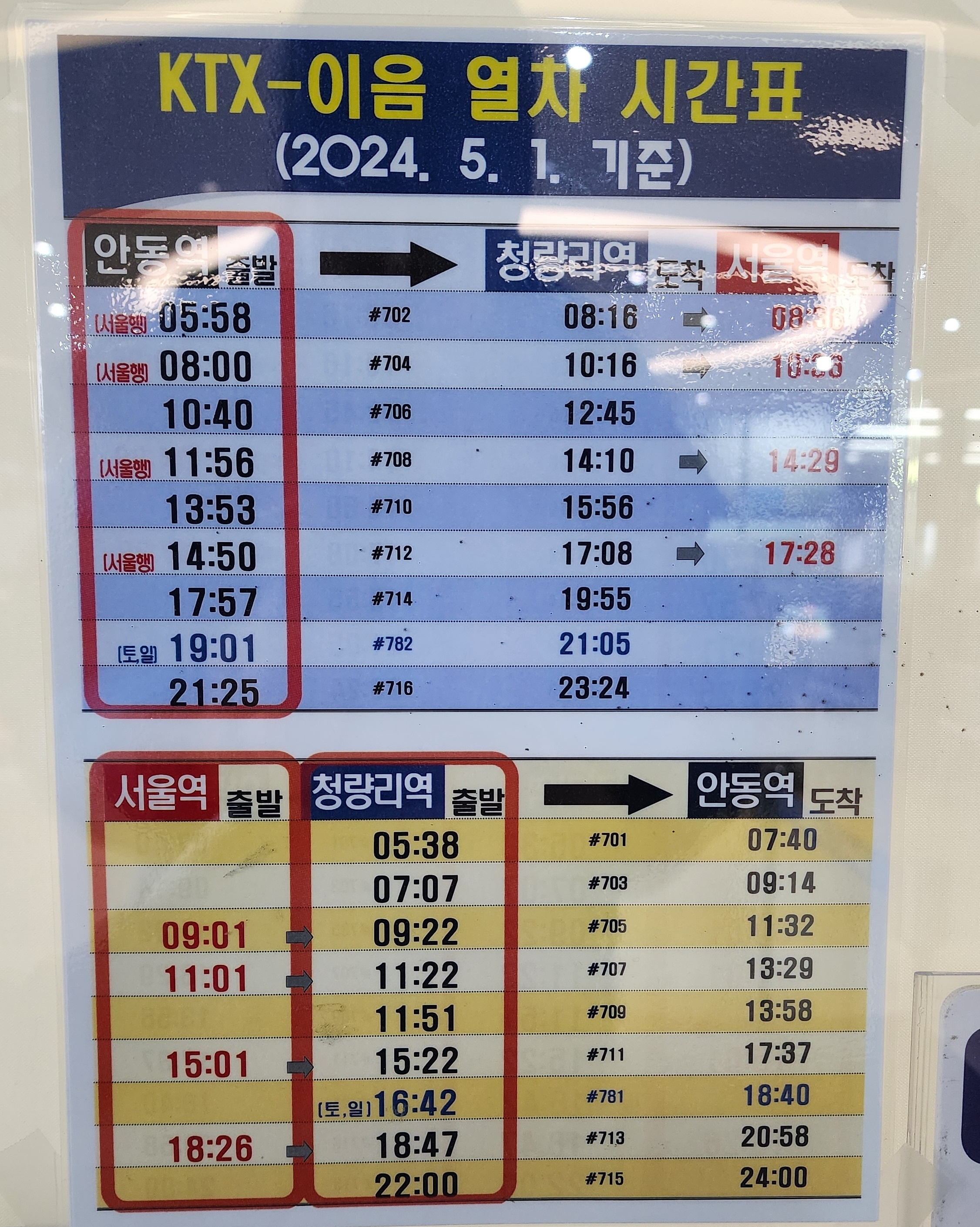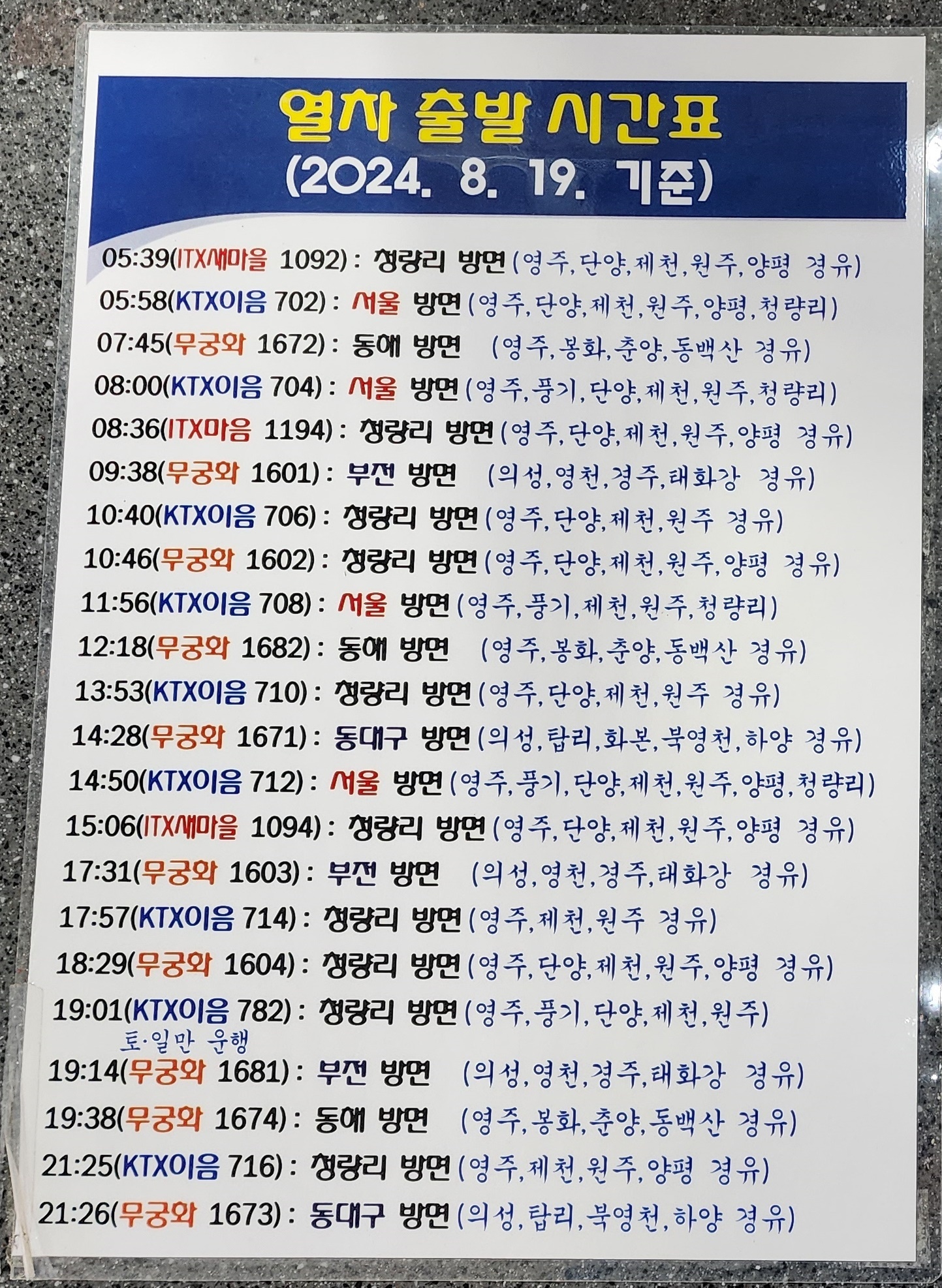 안동역 출발 청량리, 서울, 동해, 부전, 동대구 방면