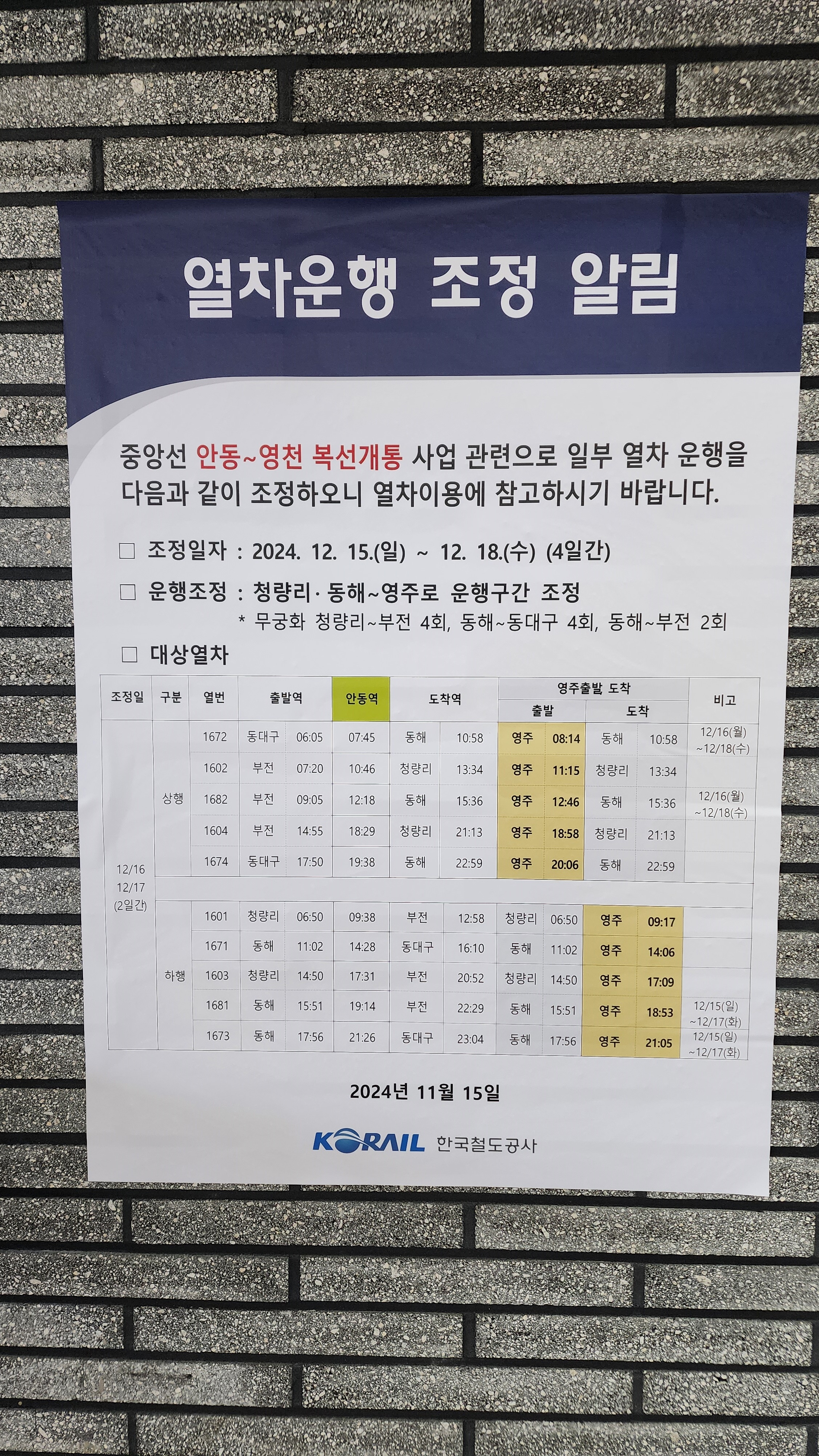 중앙선 복선개통 열차 운행조정으로 인한 열차운행구간 조정