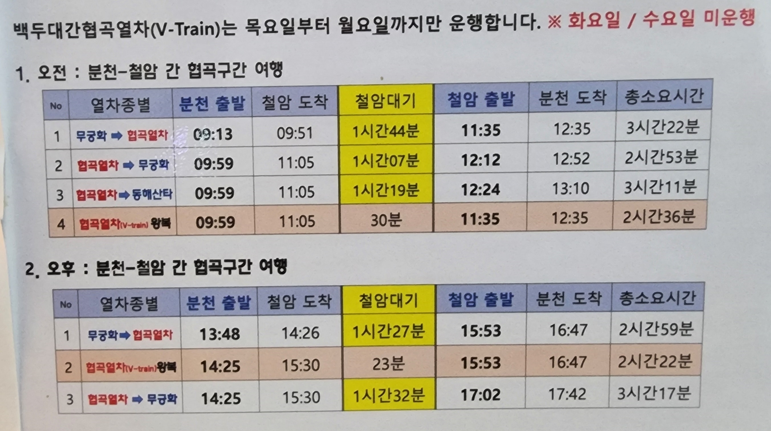 백두대간 협곡열차는 목요일부터 월요일까지만 운행합니다.