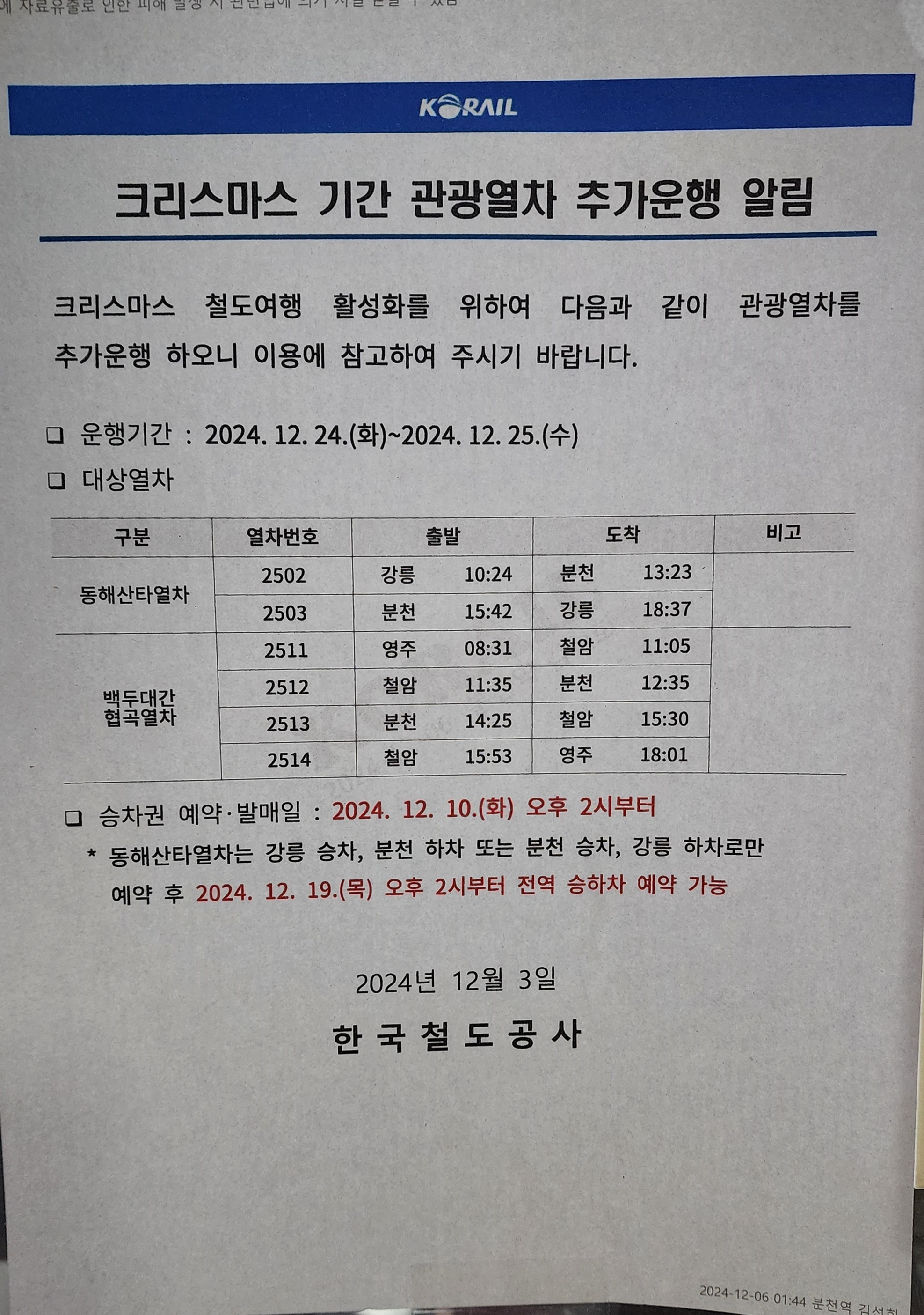 분천역 크리스마스 기간 관광열차 추가운행 알림