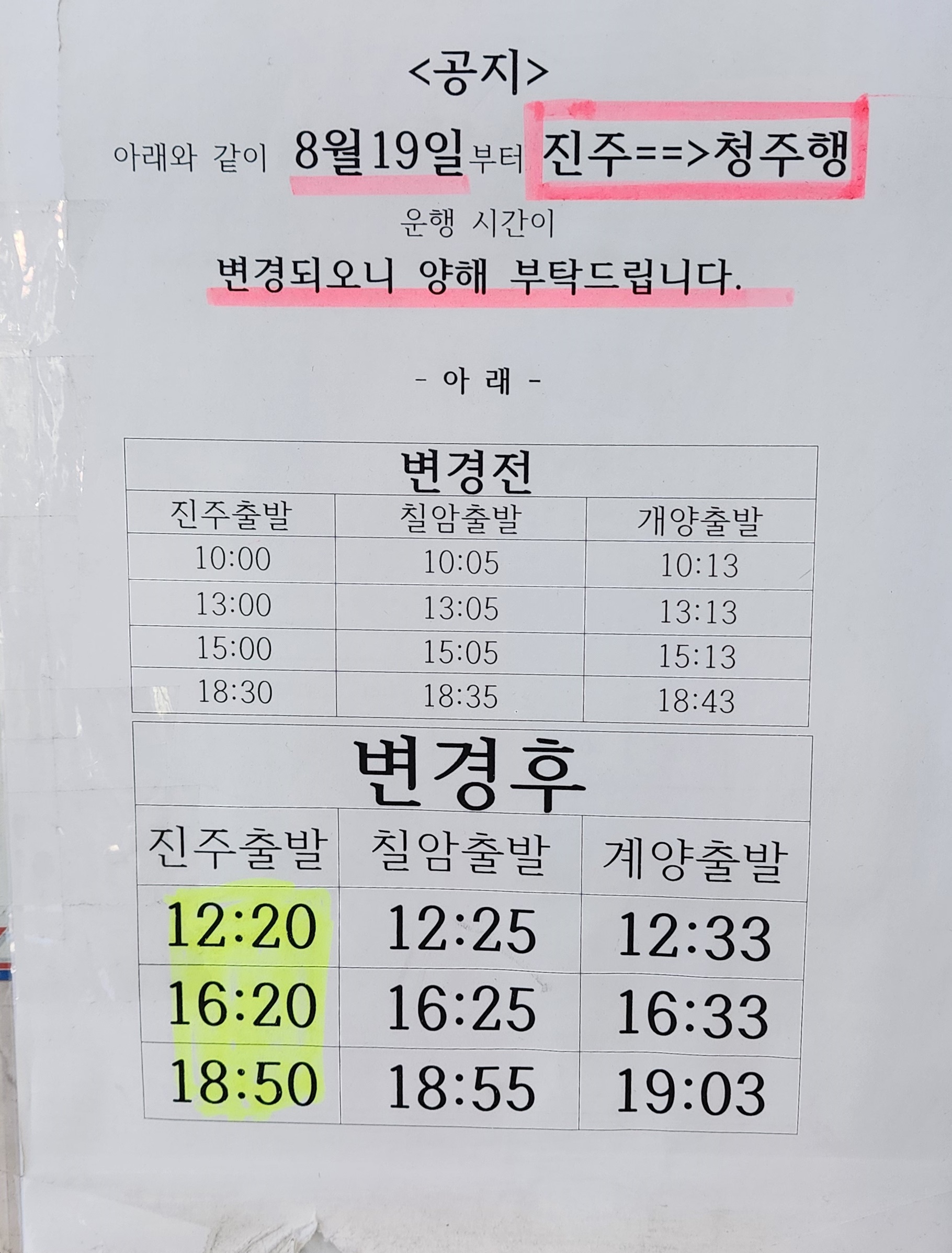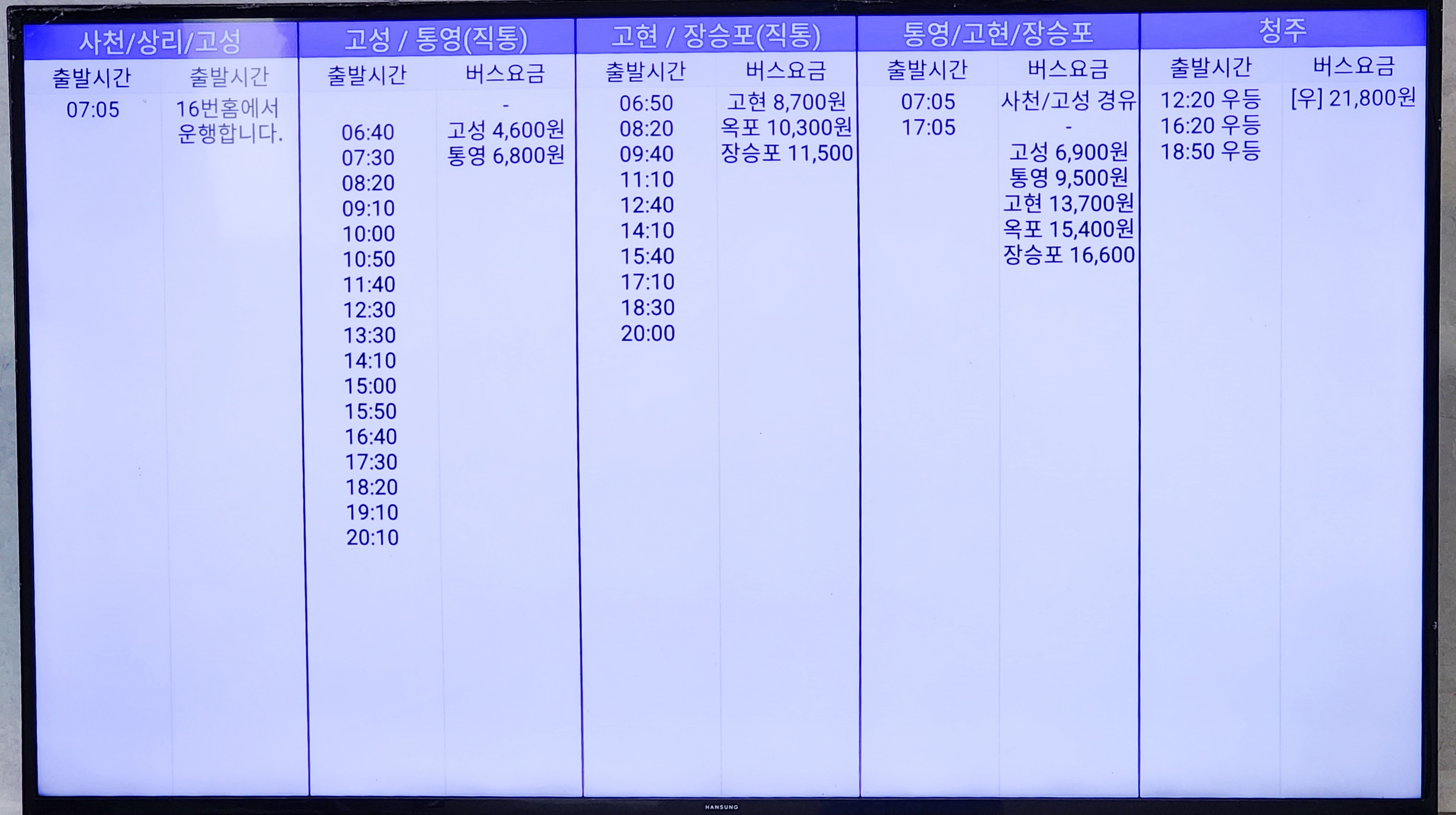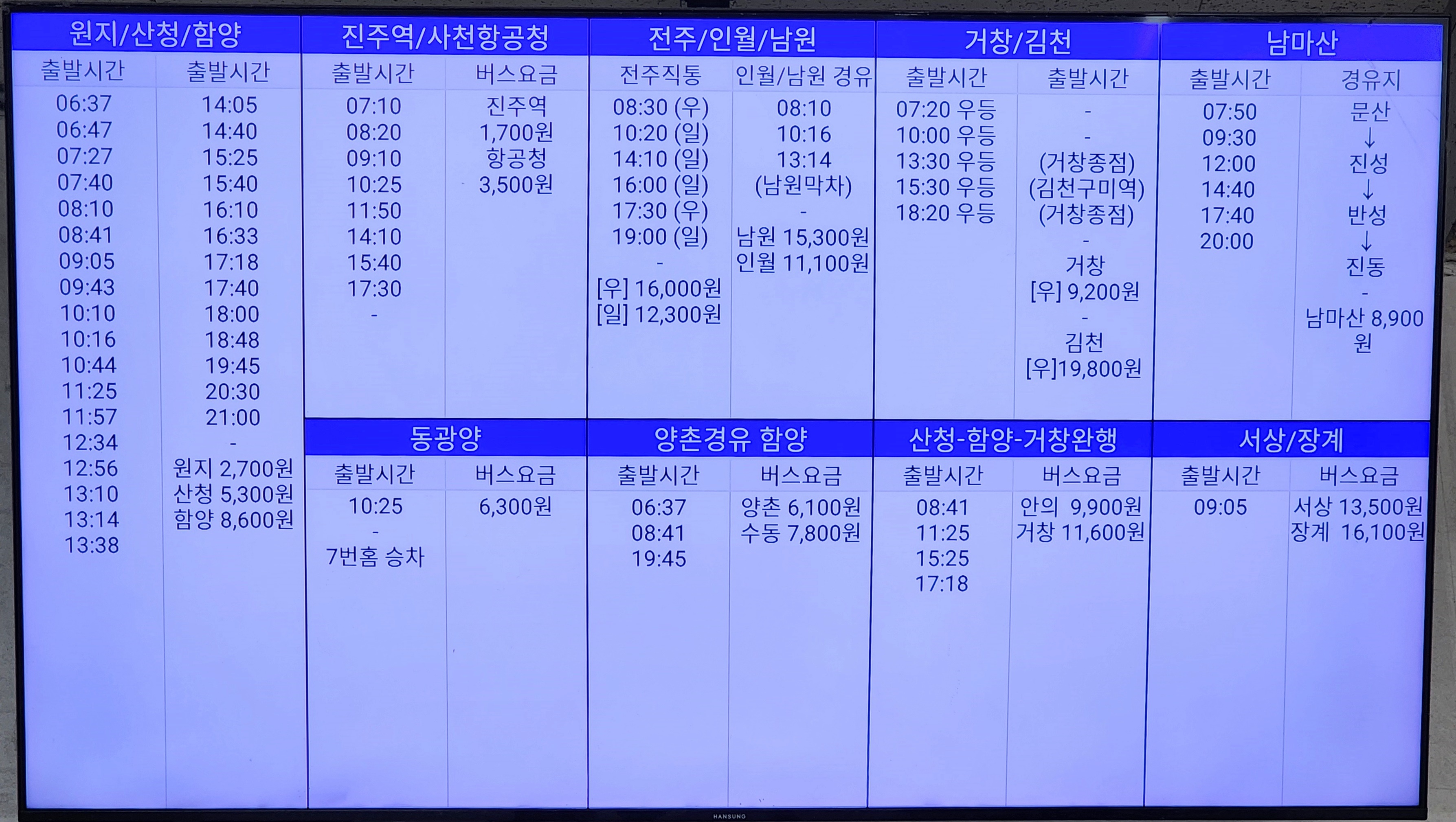 진주 출발 순천, 여수, 광양, 삼가, 대의, 의령, 함안, 군북, 경주, 포항, 대구 서부, 합천, 대전 복합터미널, 삼천포 방면.