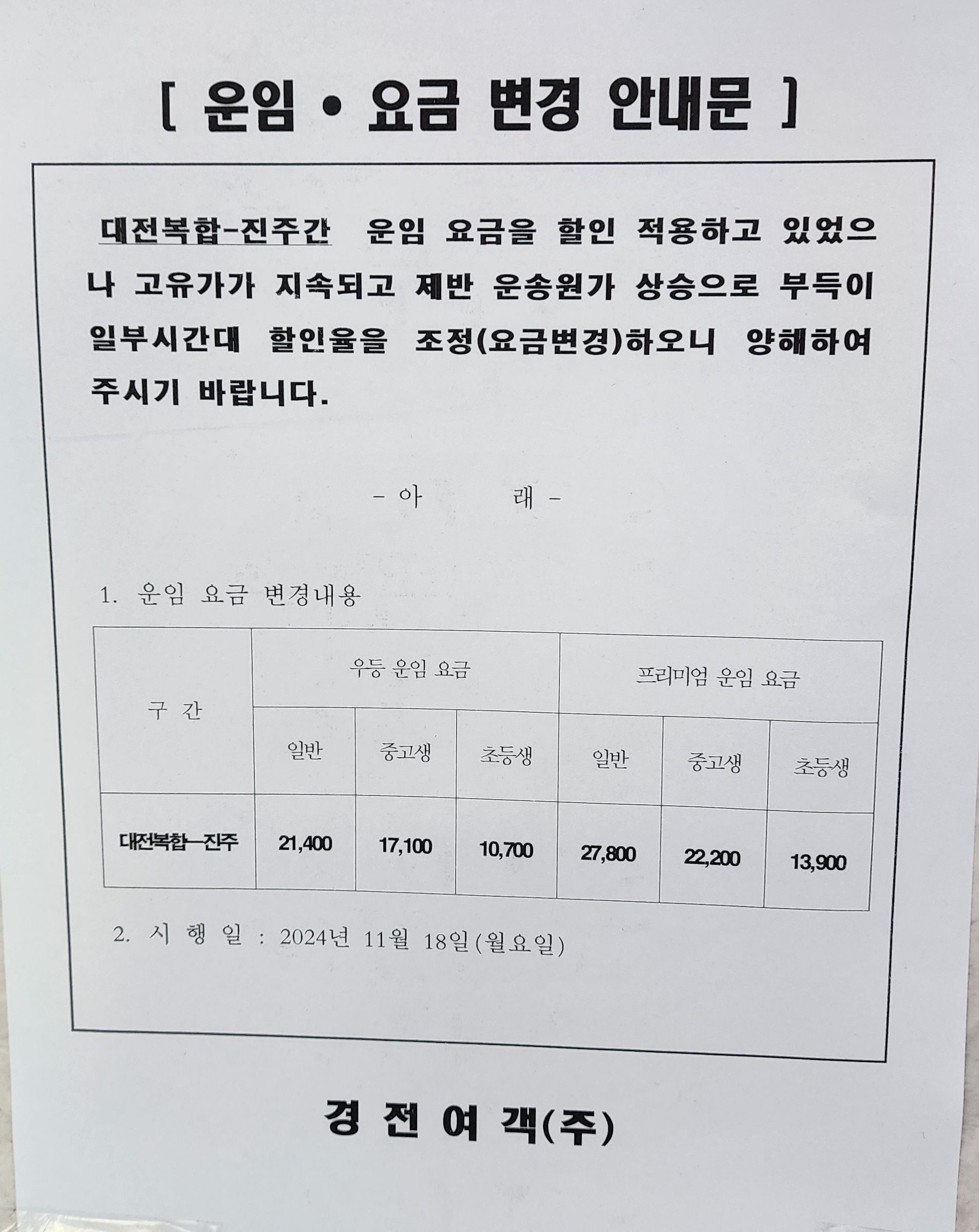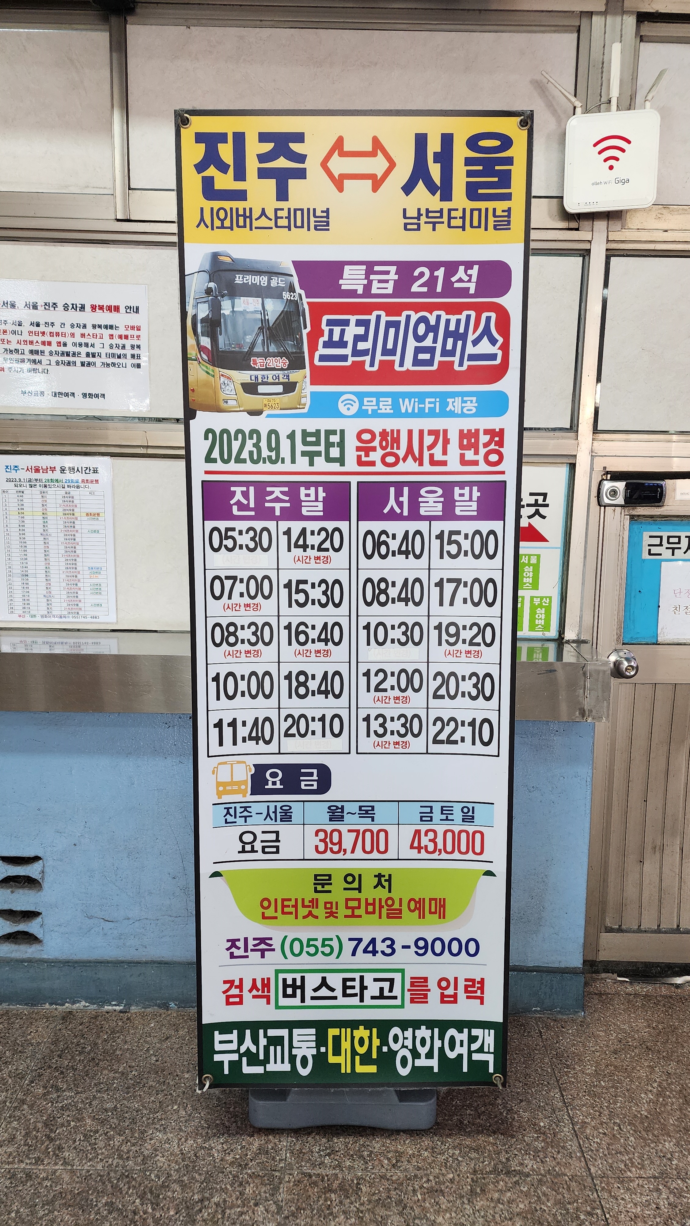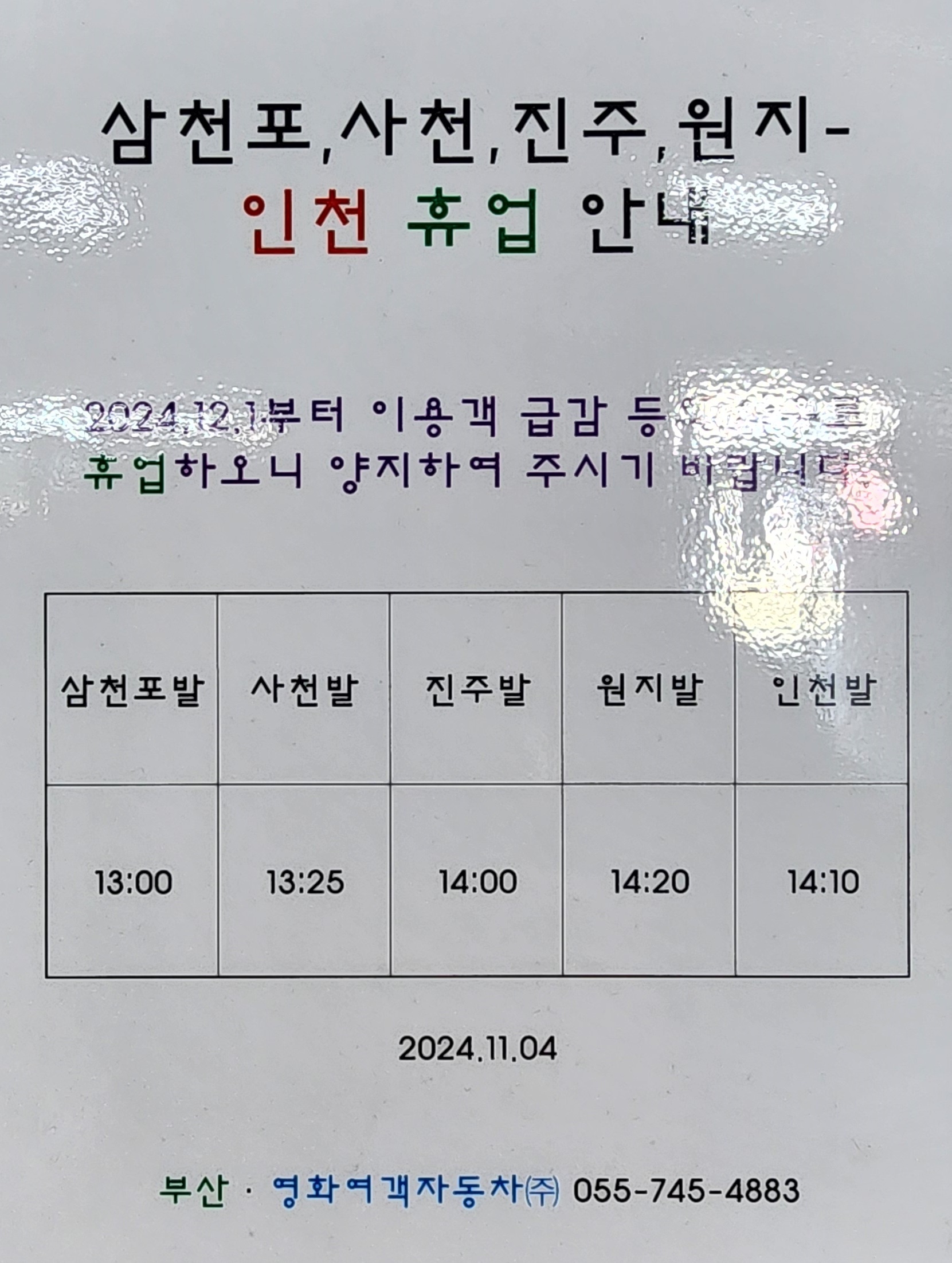 진주 출발 순천, 여수, 광양, 삼가, 대의, 의령, 함안, 군북, 경주, 포항, 대구 서부, 합천, 대전 복합터미널, 삼천포 방면.