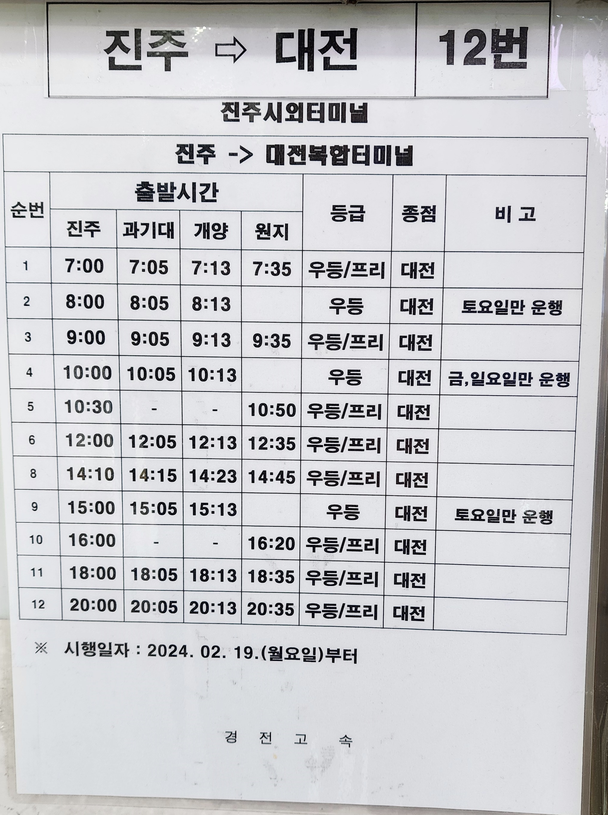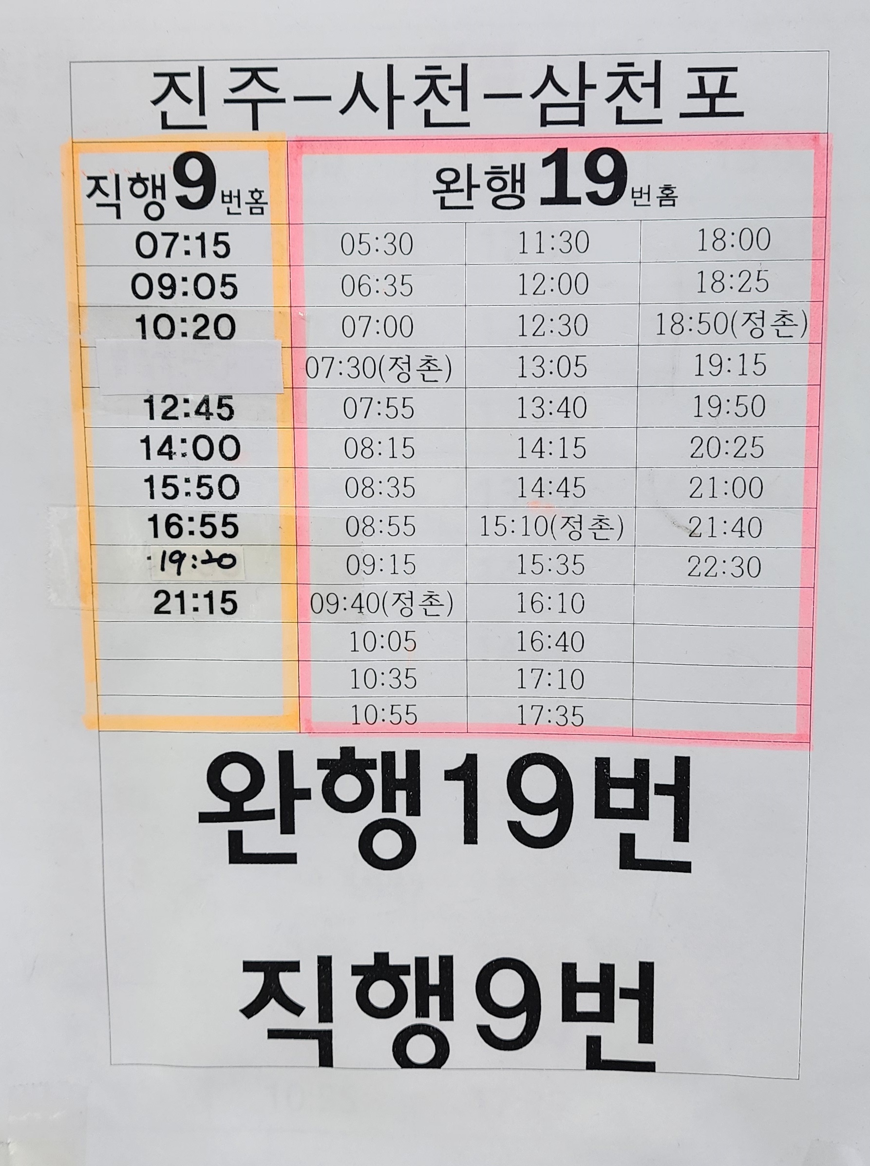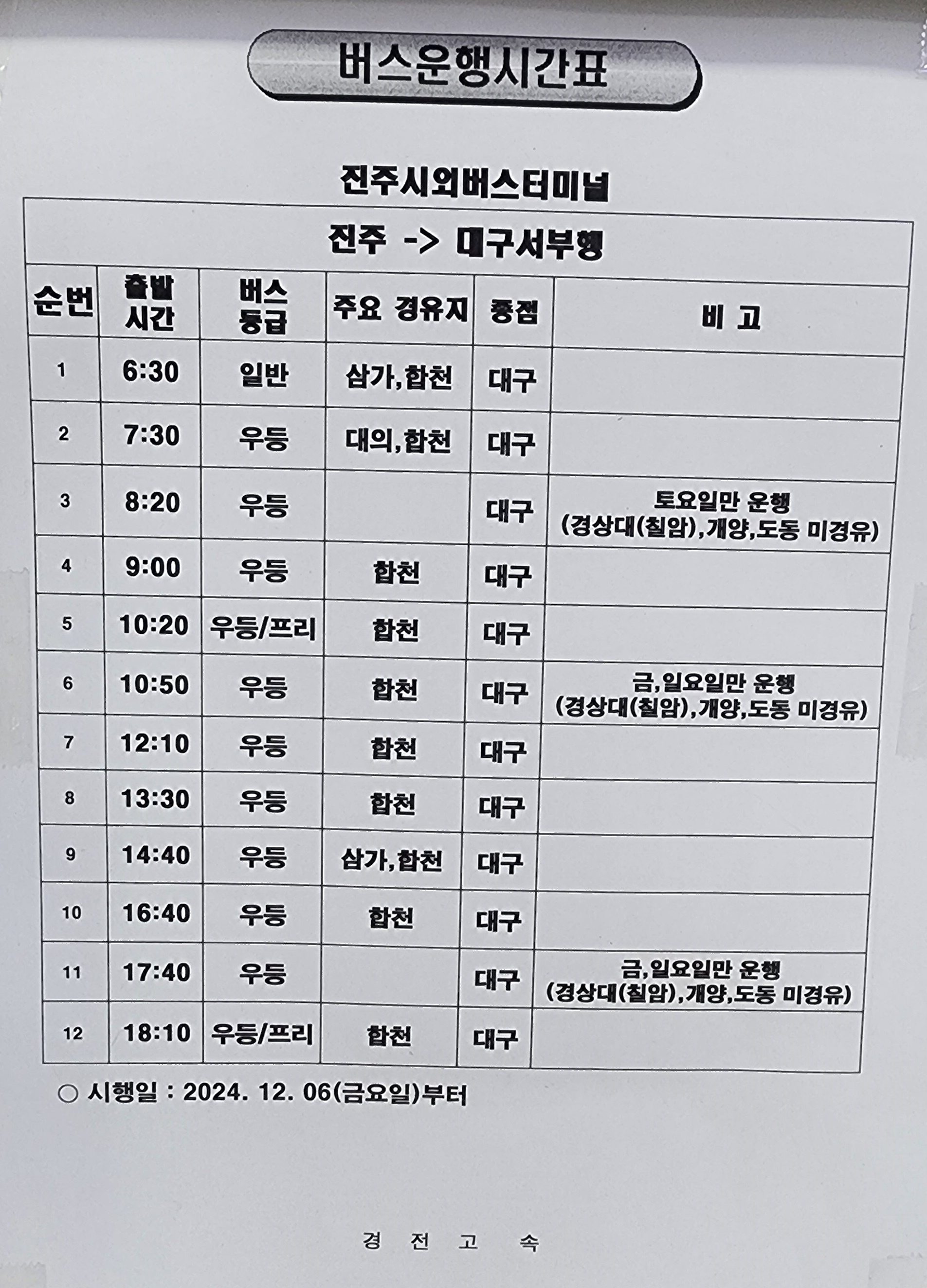 진주 출발 순천, 여수, 광양, 삼가, 대의, 의령, 함안, 군북, 경주, 포항, 대구 서부, 합천, 대전 복합터미널, 삼천포 방면.