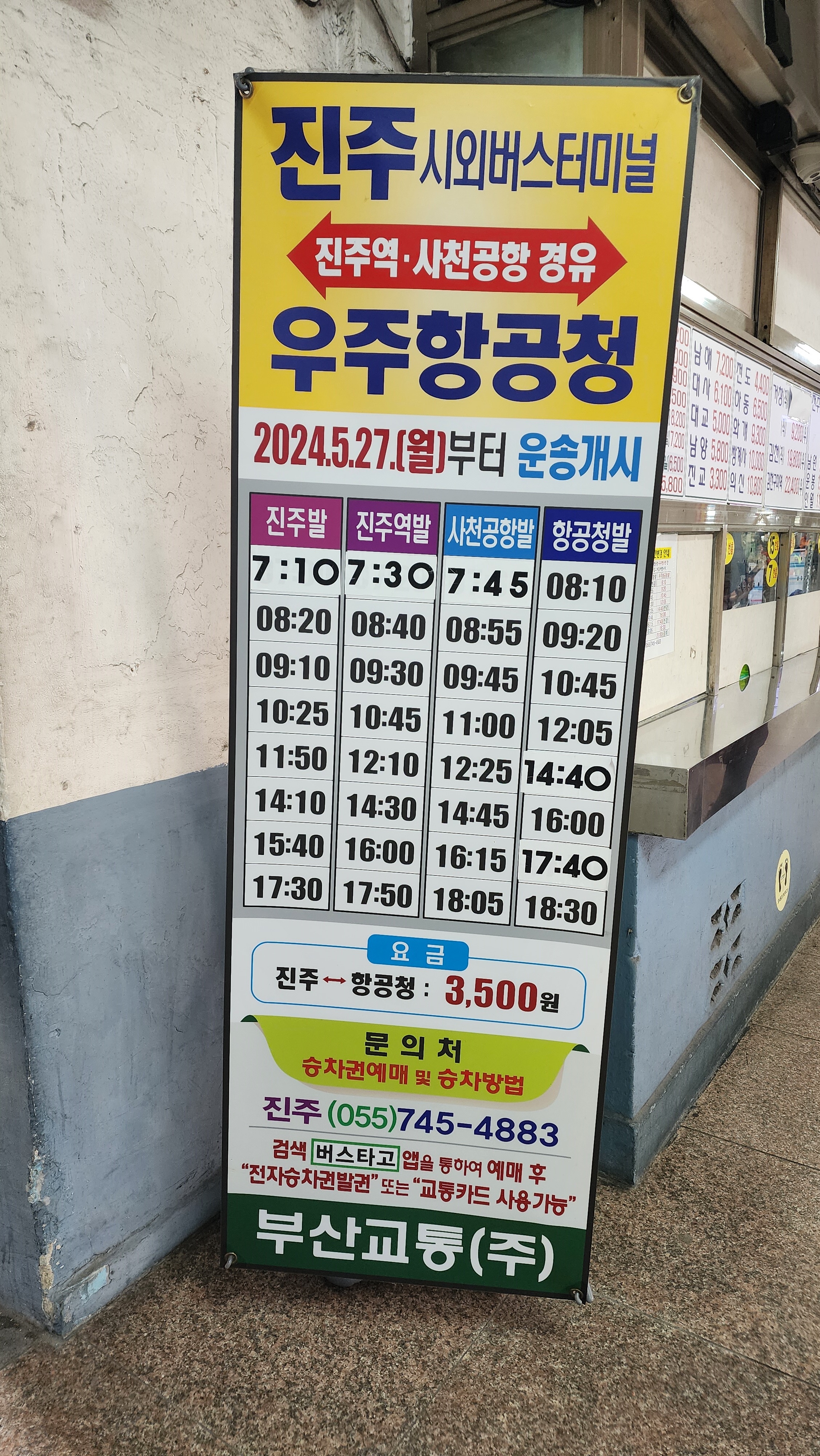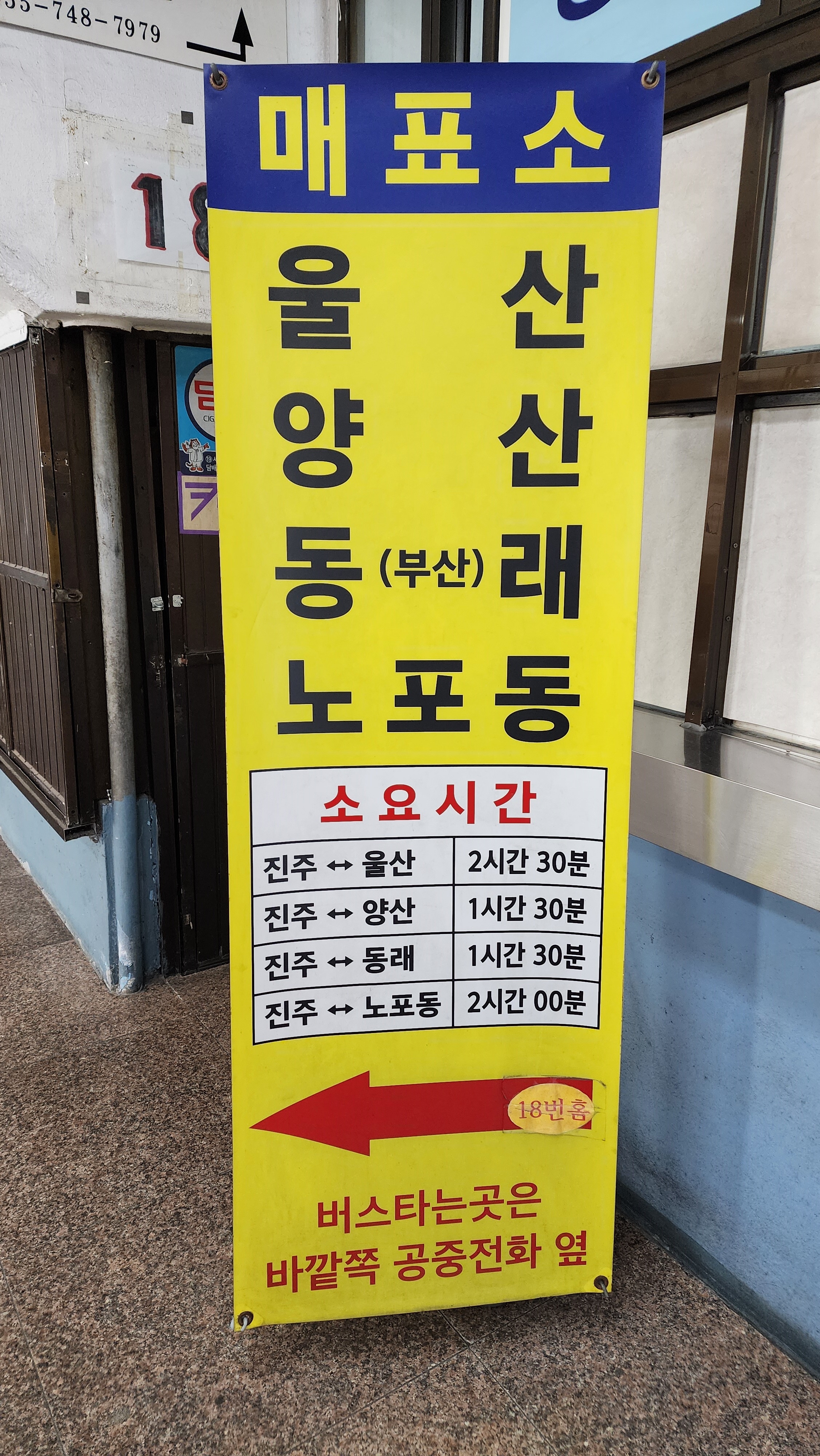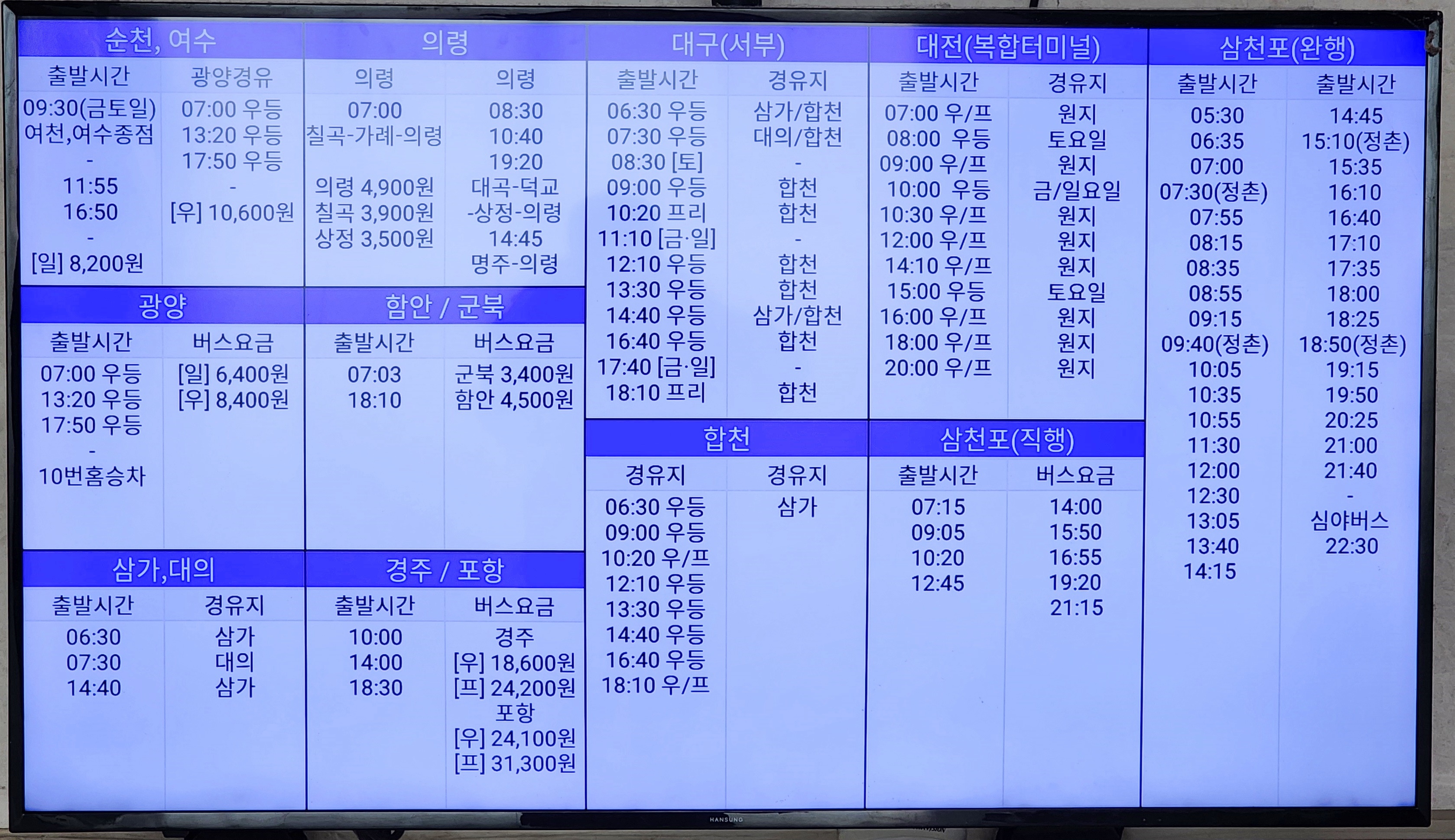 진주 출발 순천, 여수, 광양, 삼가, 대의, 의령, 함안, 군북, 경주, 포항, 대구 서부, 합천, 대전 복합터미널, 삼천포 방면.