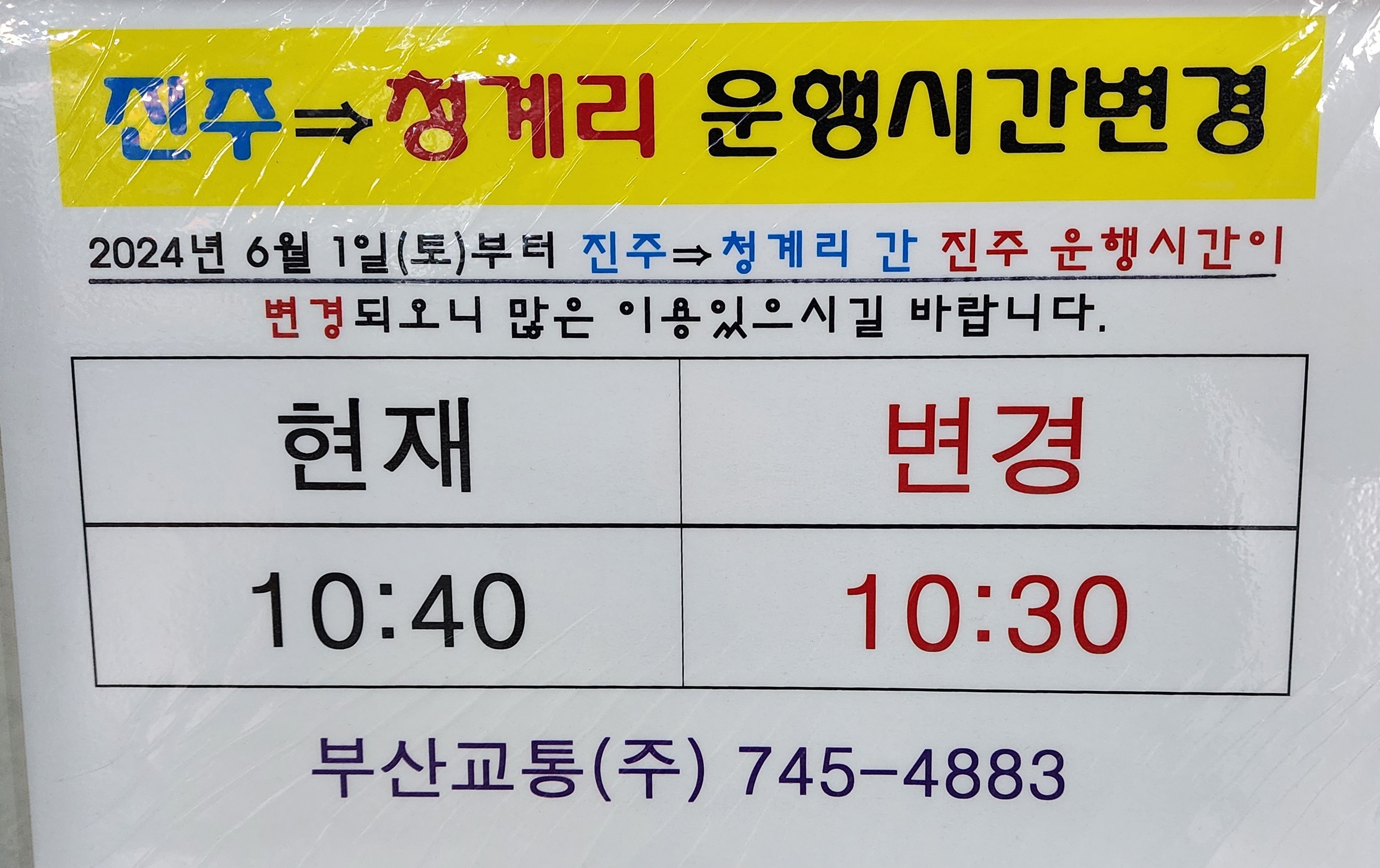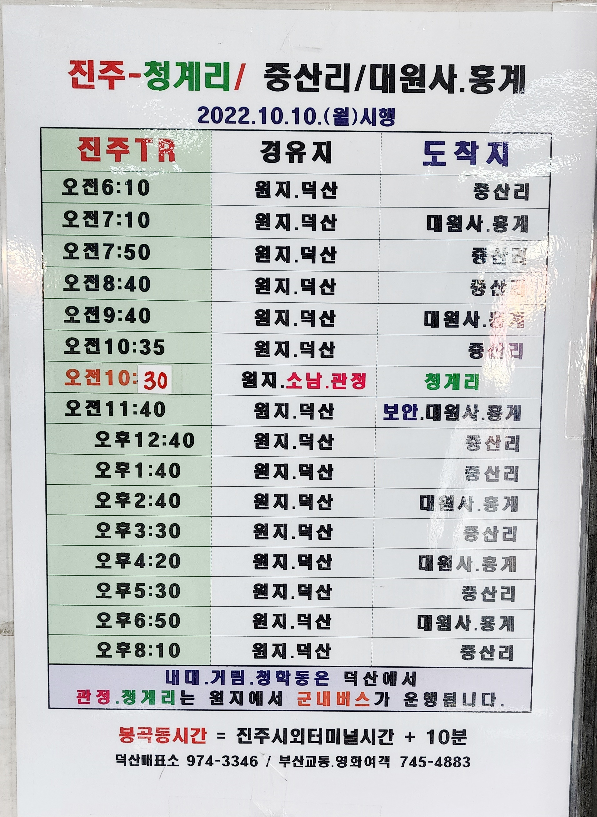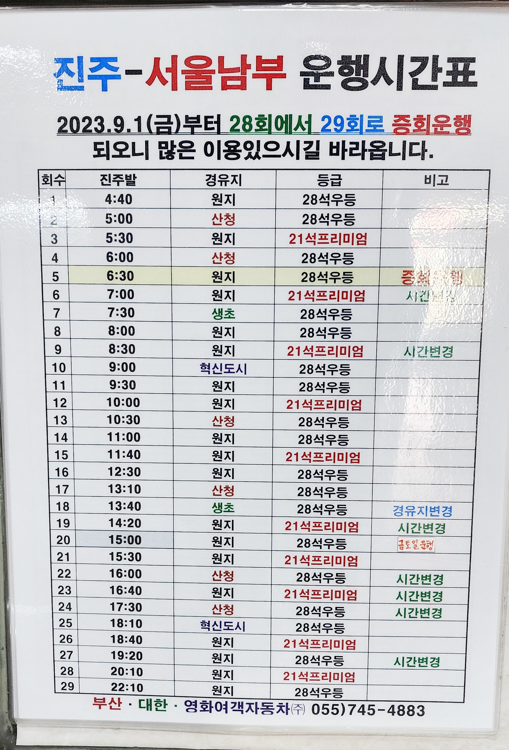 진주 출발 중산리, 청계리, 대원사, 홍계, 기회, 대병, 완사, 곤양, 옥종, 북천, 서포, 서울 남부터미널 방면.