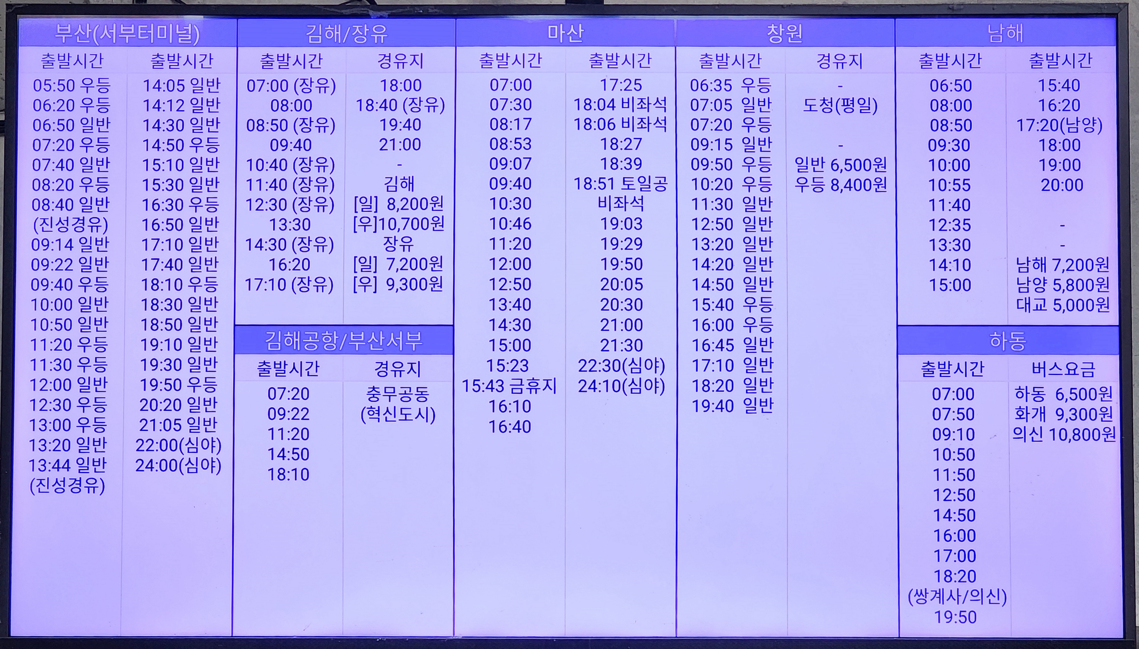 진주 출발 부산 서부터미널, 김해, 장유, 김해공항, 부산 서부, 마산, 창원, 남해, 하동 방면.