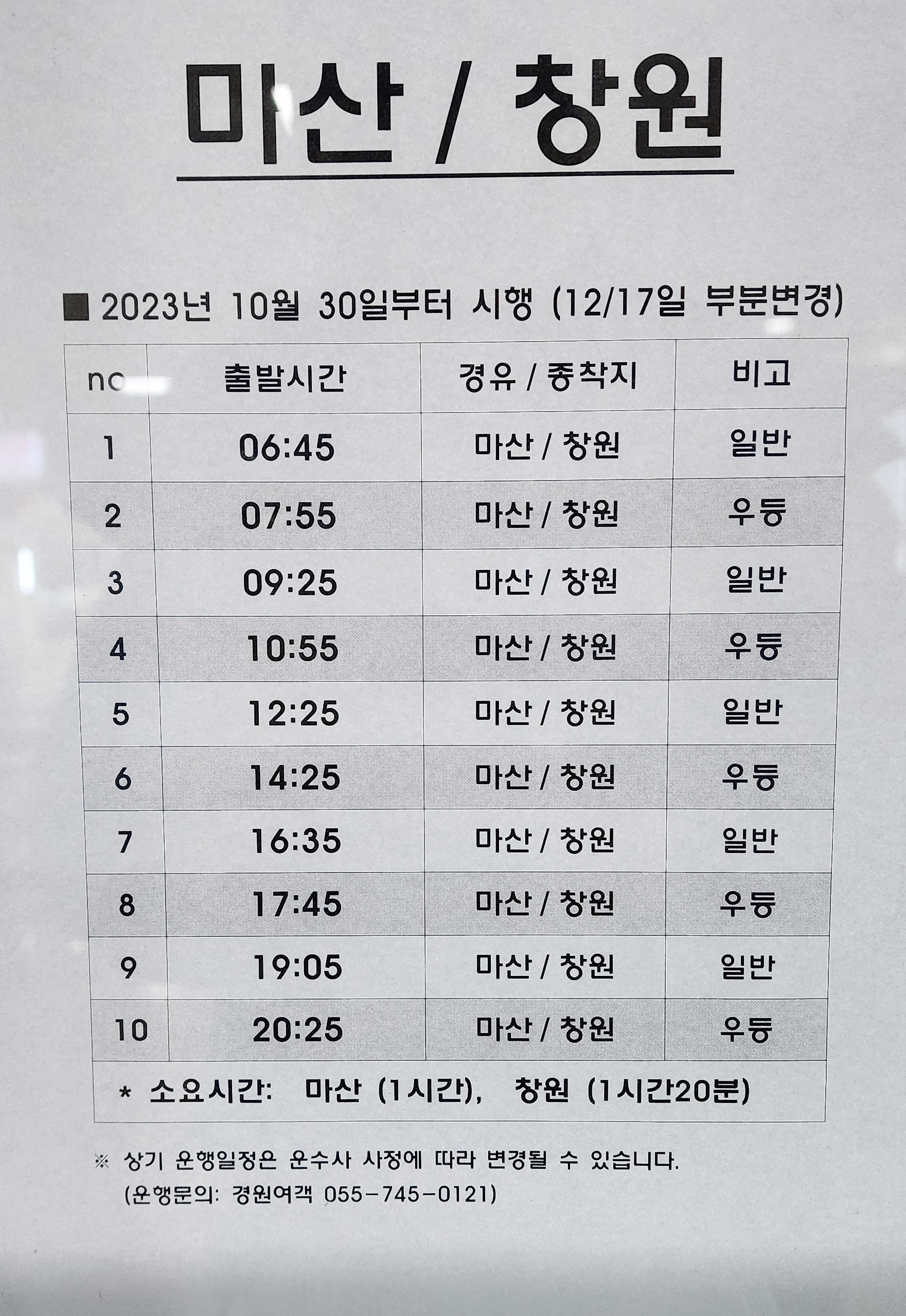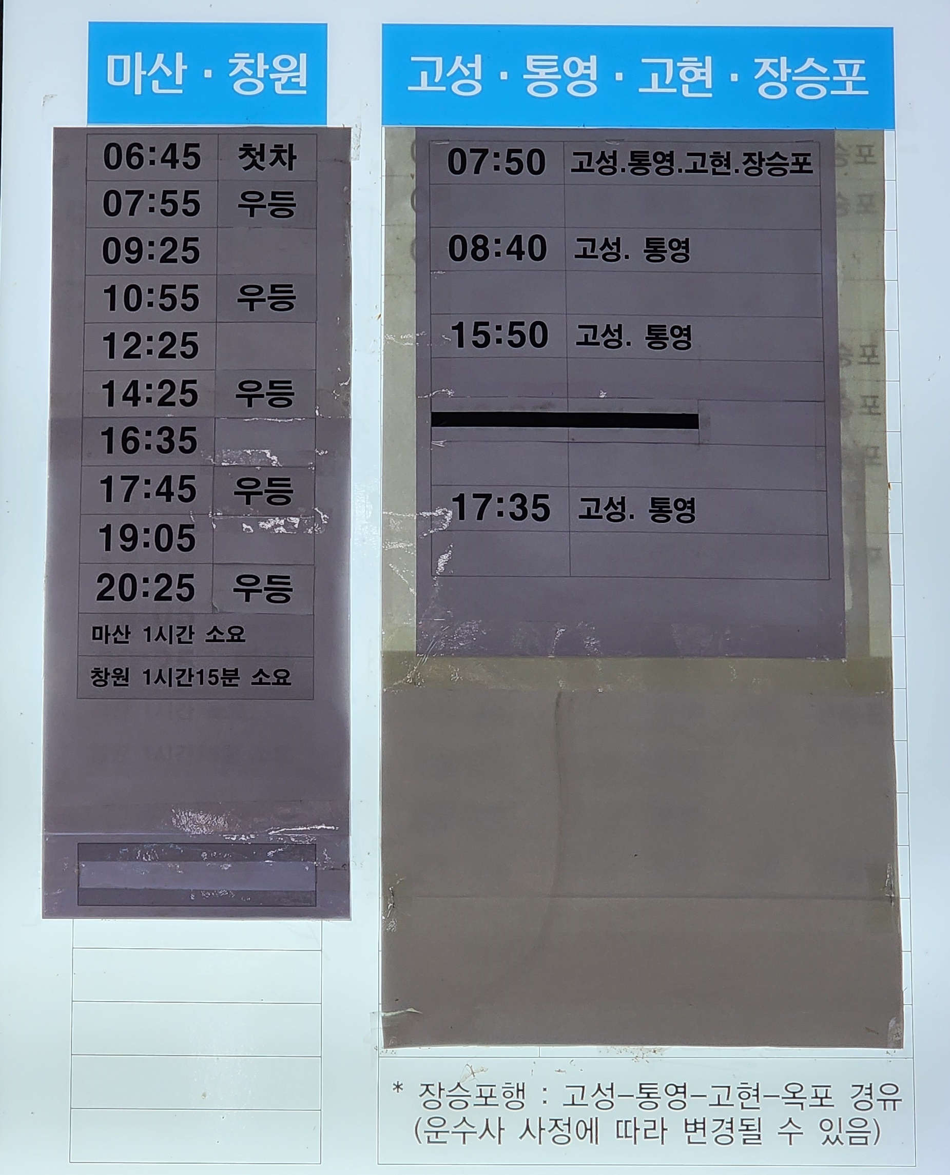 사천 출발 마산, 창원, 고성, 통영, 고현, 장승포 방면.