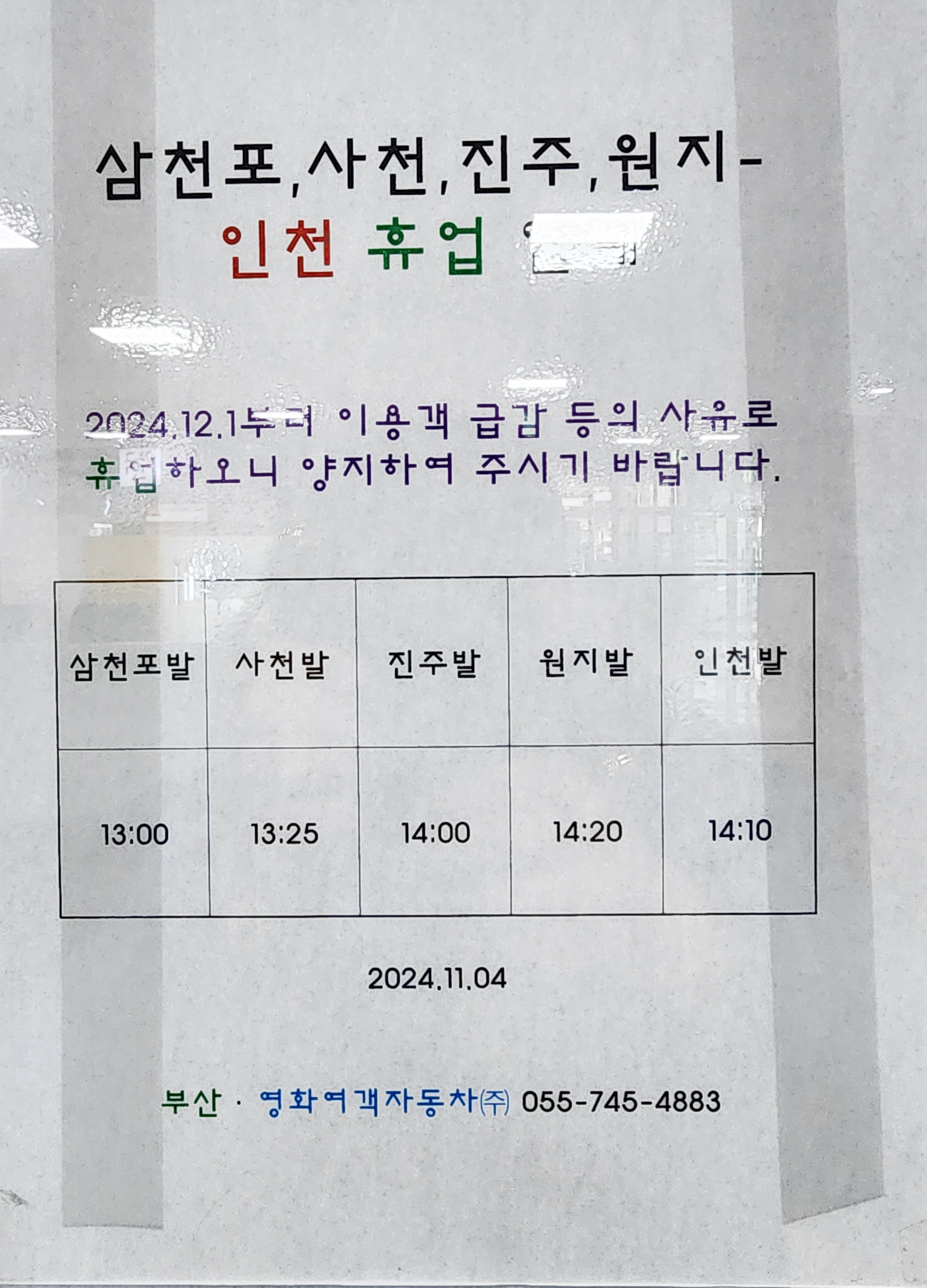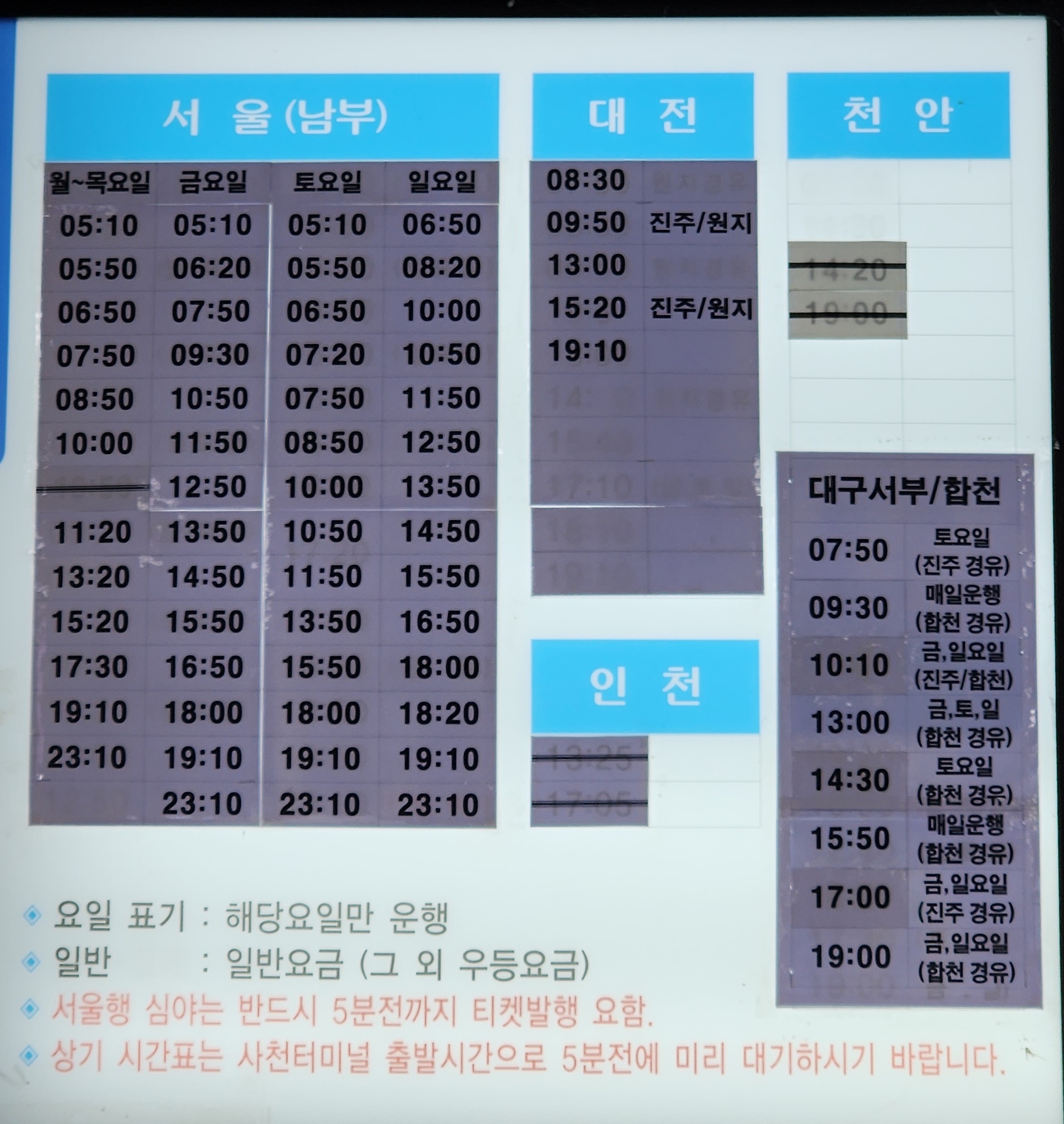사천 출발 서울 남부, 대전, 천안, 대구 서부, 합천 방면.