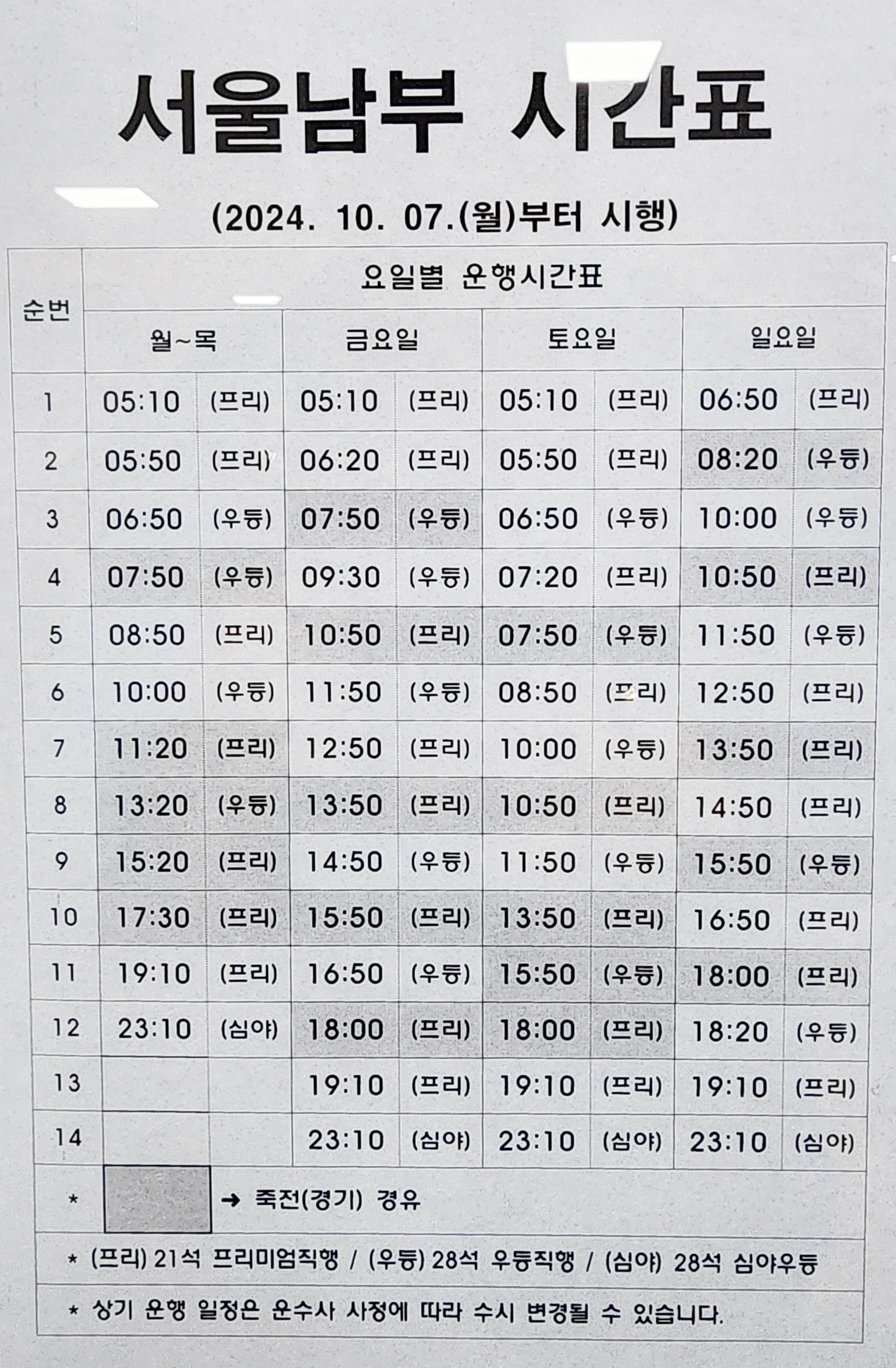 사천 출발 서울 남부 방면.