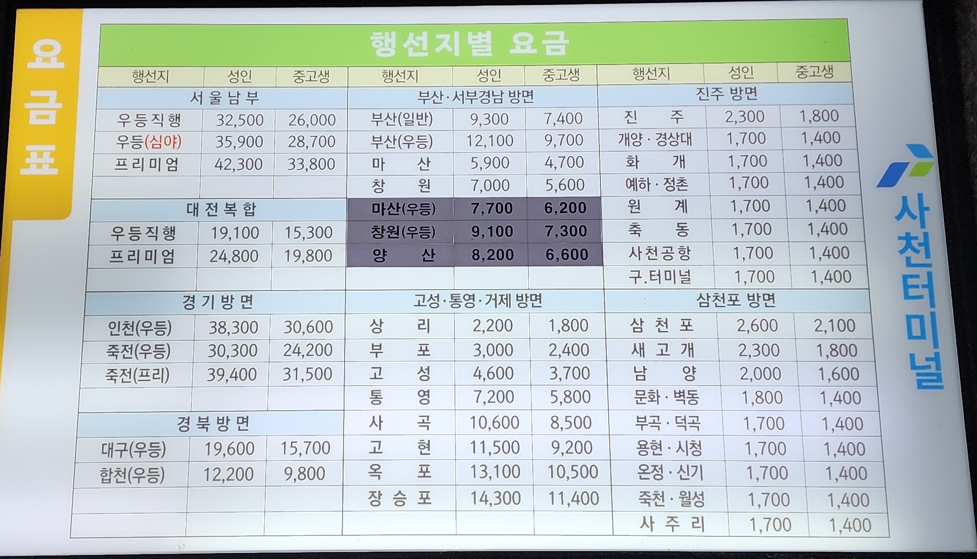사천시외버스터미널 요금표
