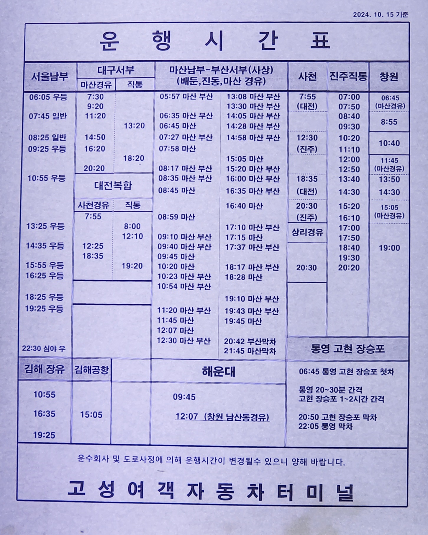 고성 출발 서울, 대전, 대구, 마산, 창원, 진주, 사천, 해운대, 장유, 김해, 김해공항 방면.