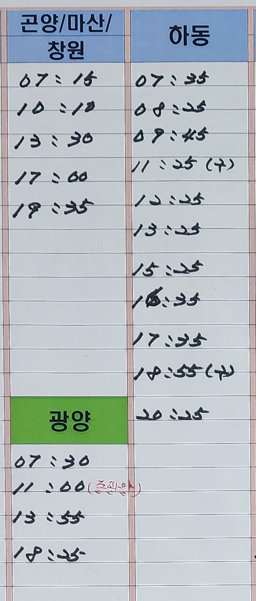 진교 출발 광양, 곤양, 마산, 창원, 하동 방면.