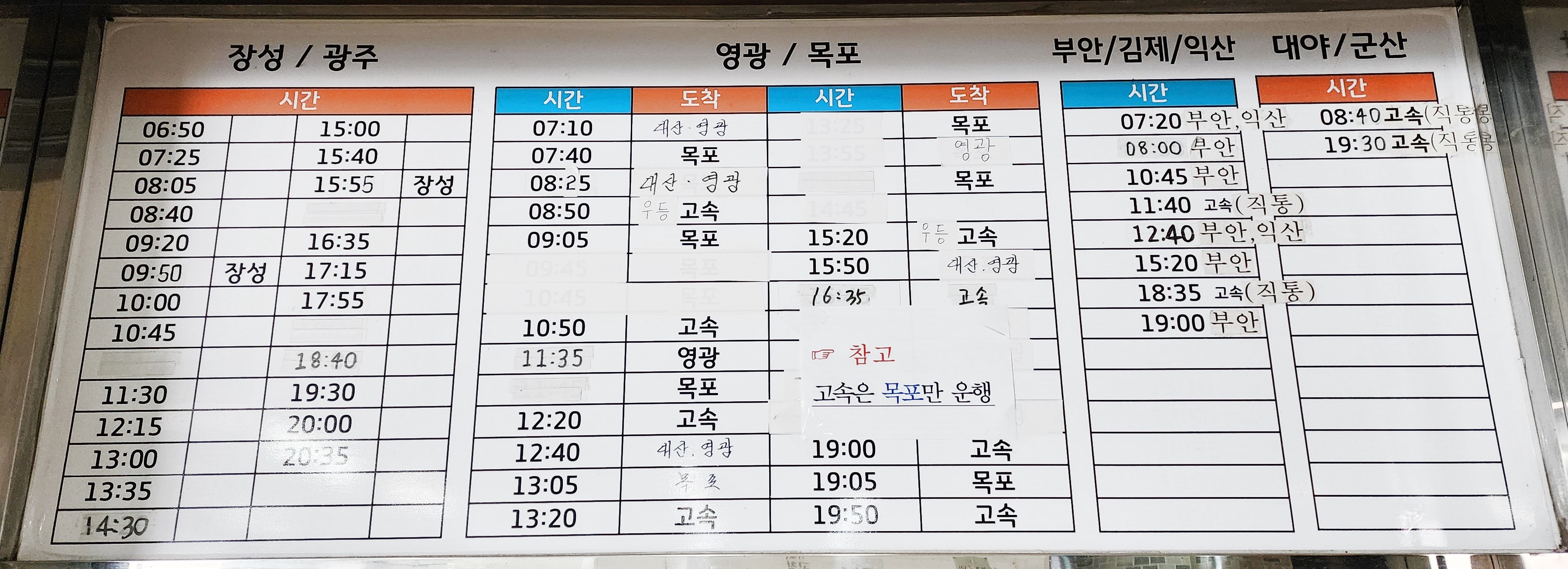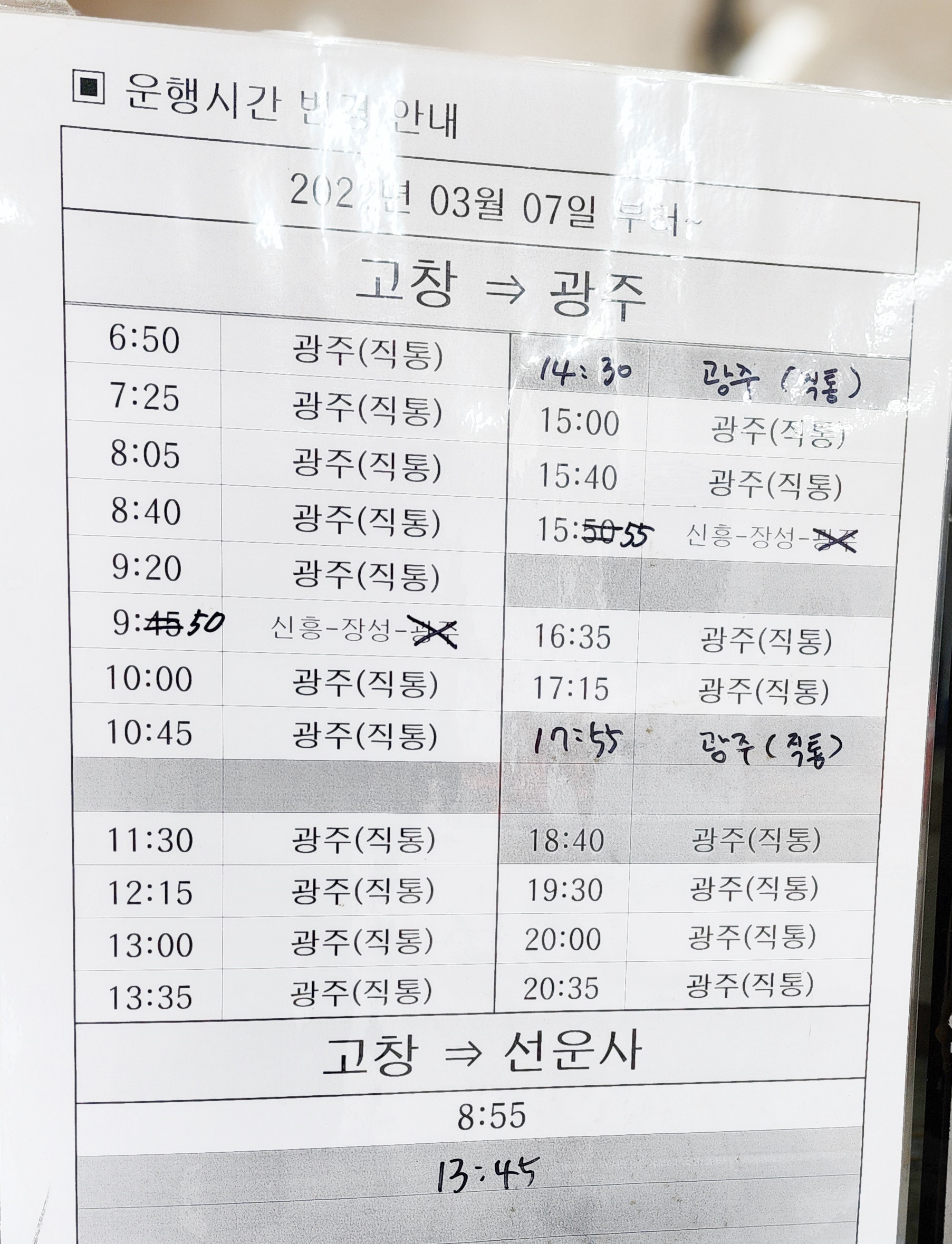 고창 출발 장성, 광주, 영과으 목포, 부안, 김제, 익산, 대야, 군산 방면.