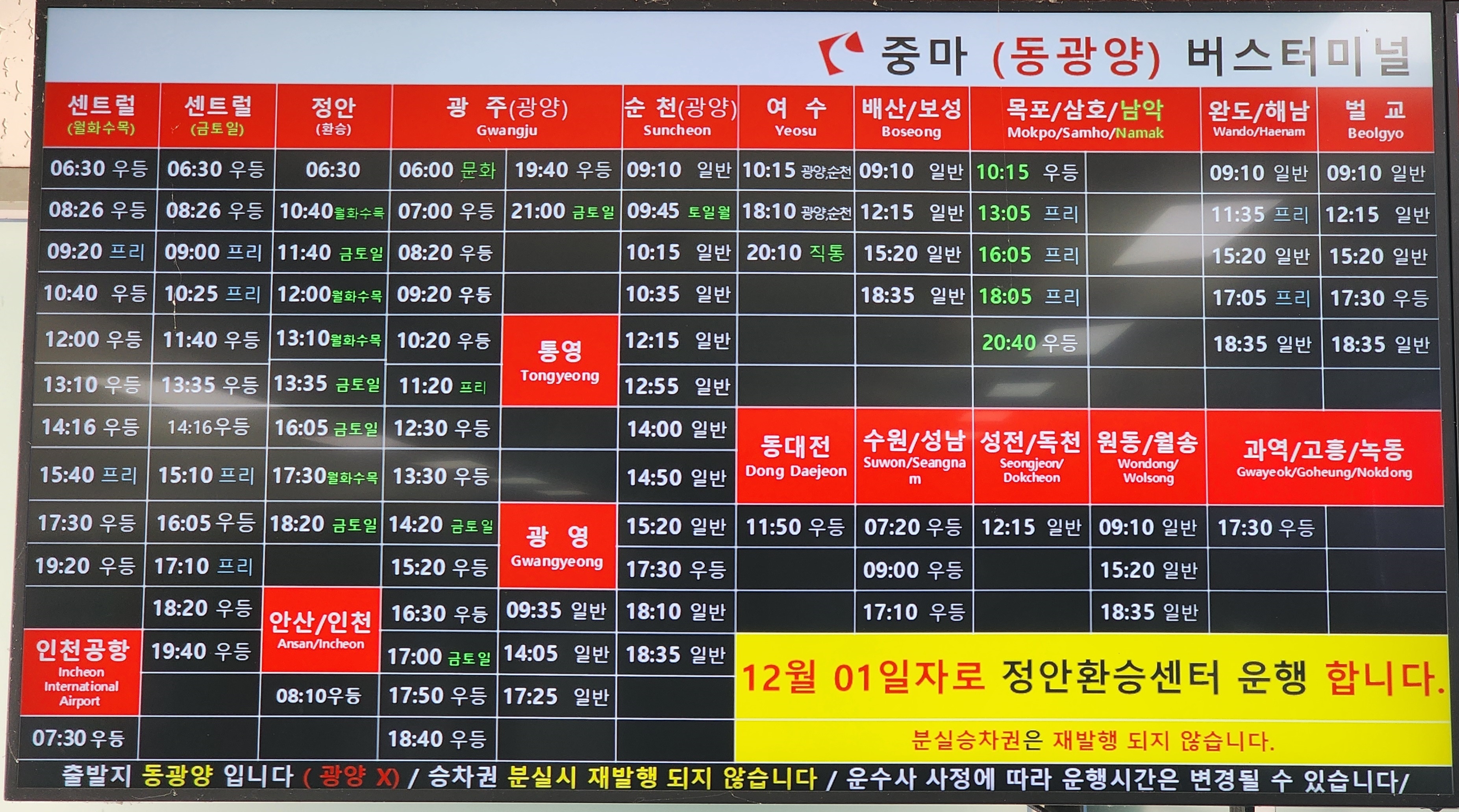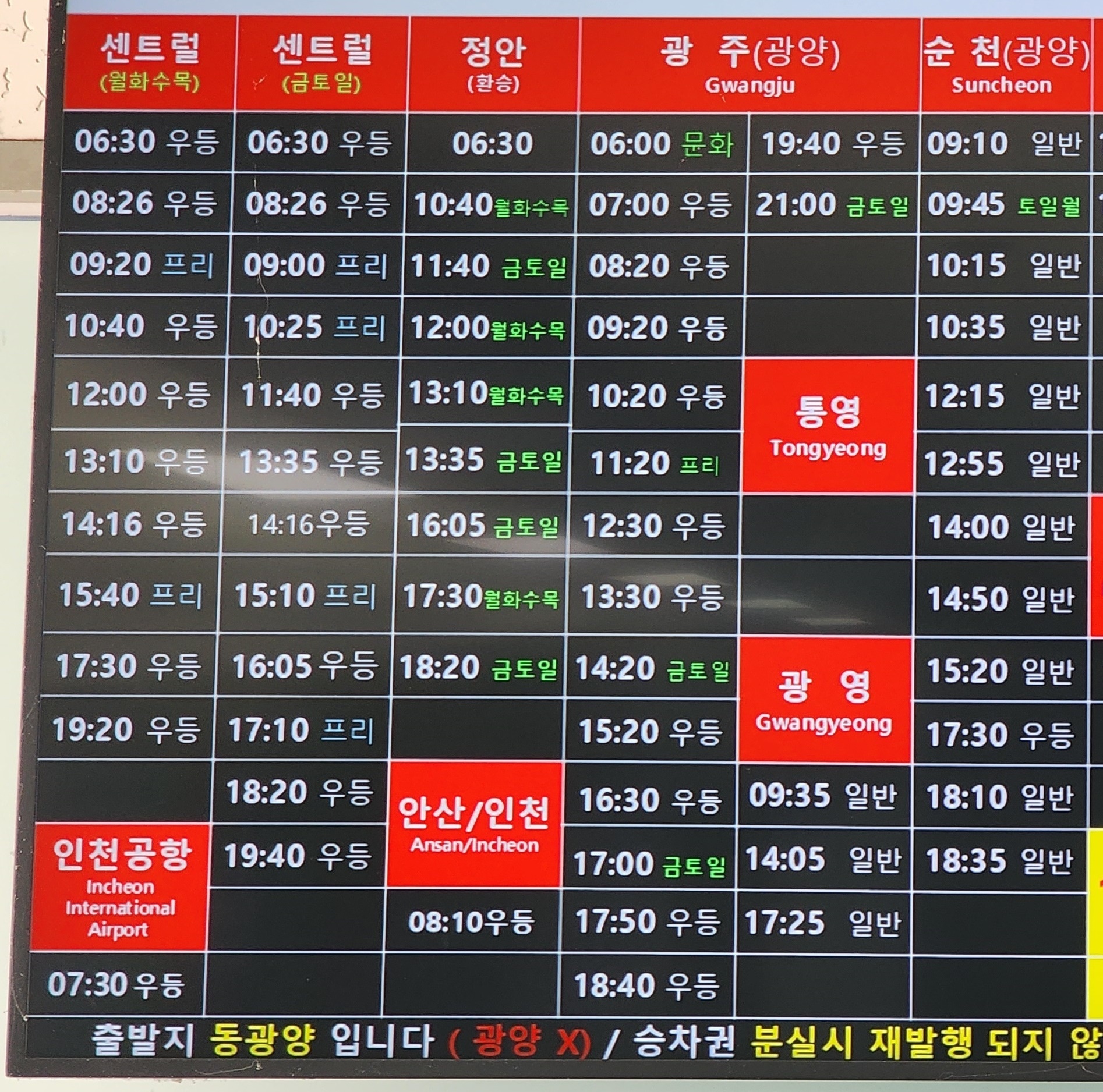 동광양 출발 서울 센트럴, 정안, 인천공항, 안산, 인천, 광주, 순천, 통영, 광영 방면.