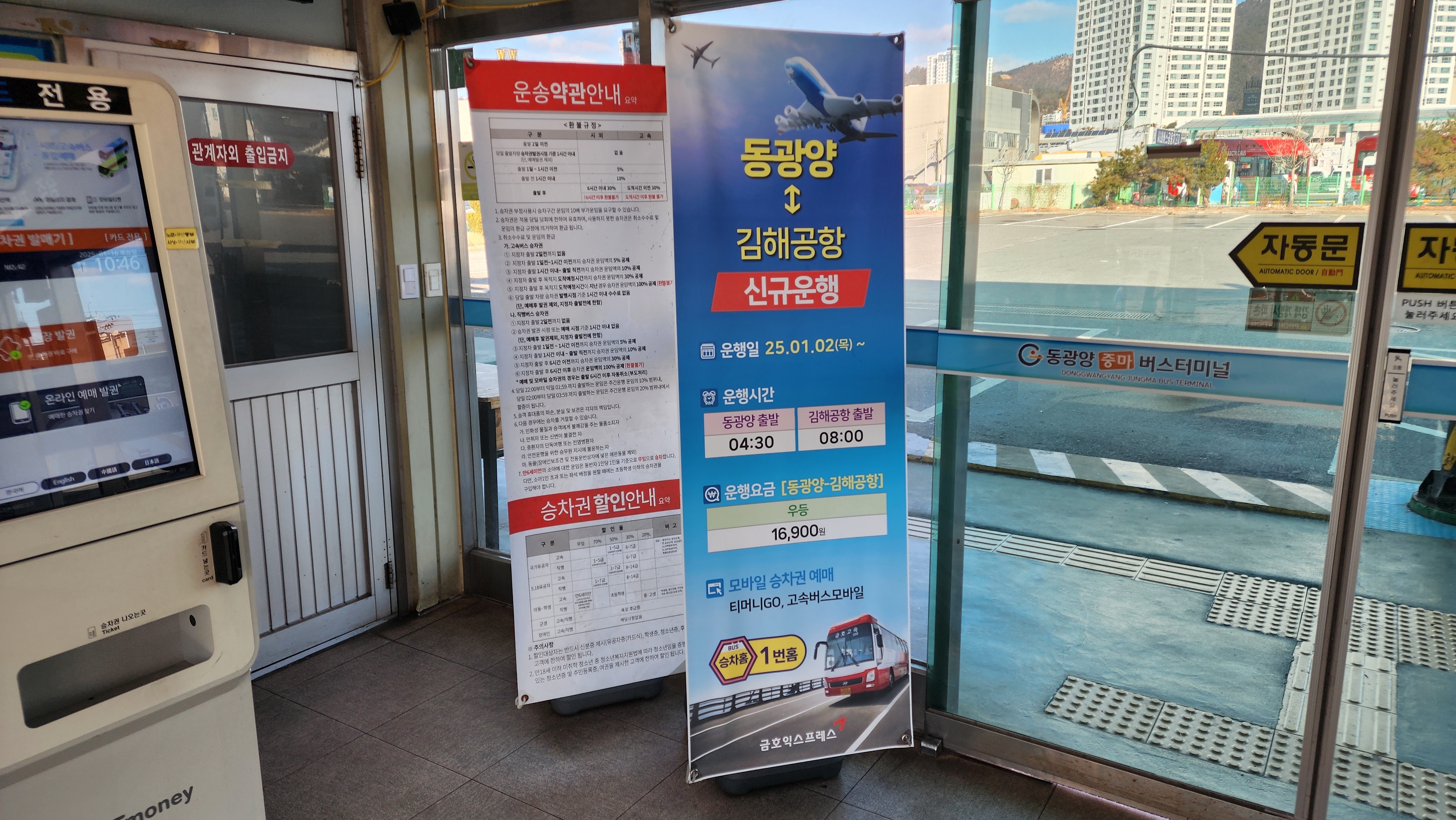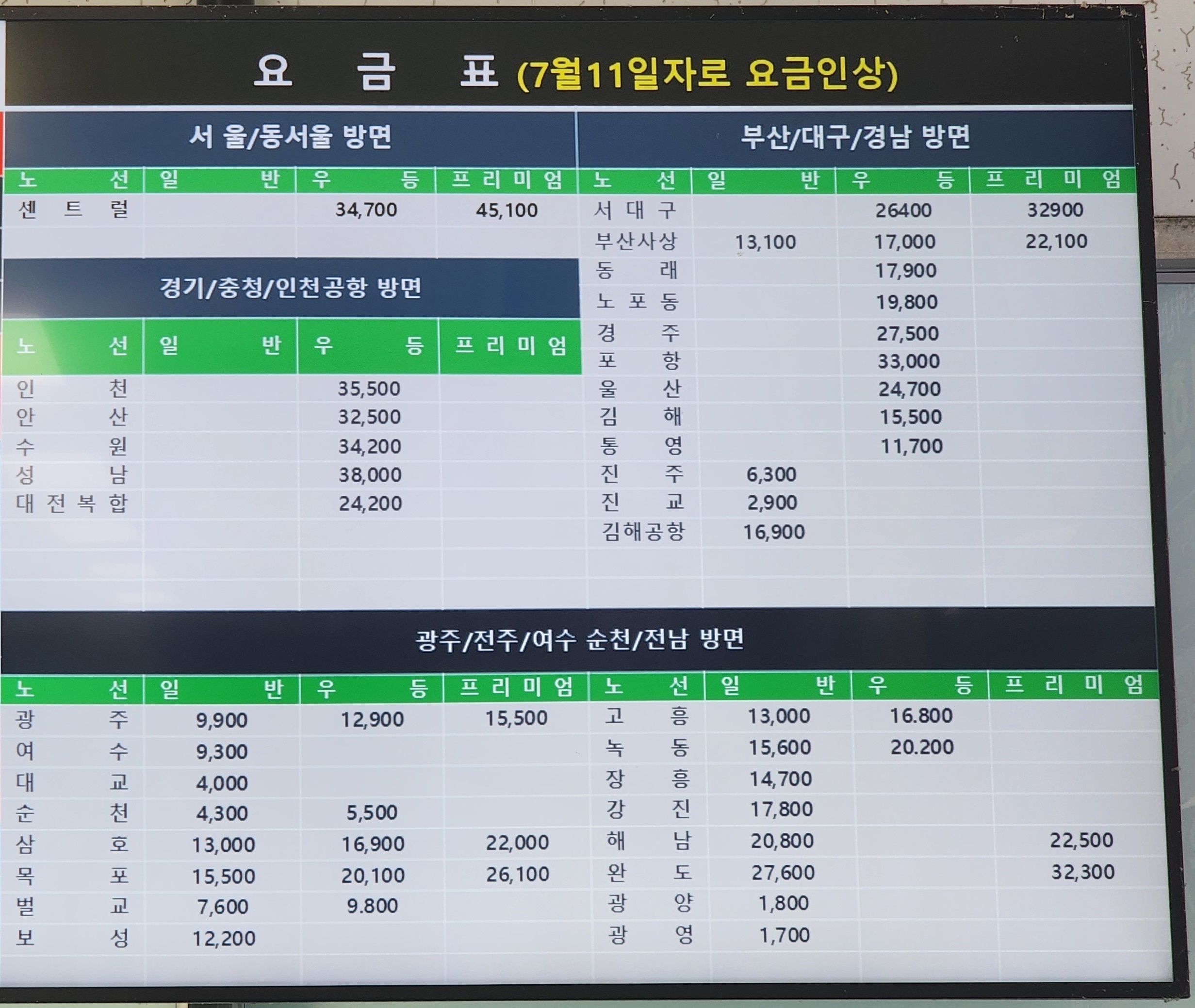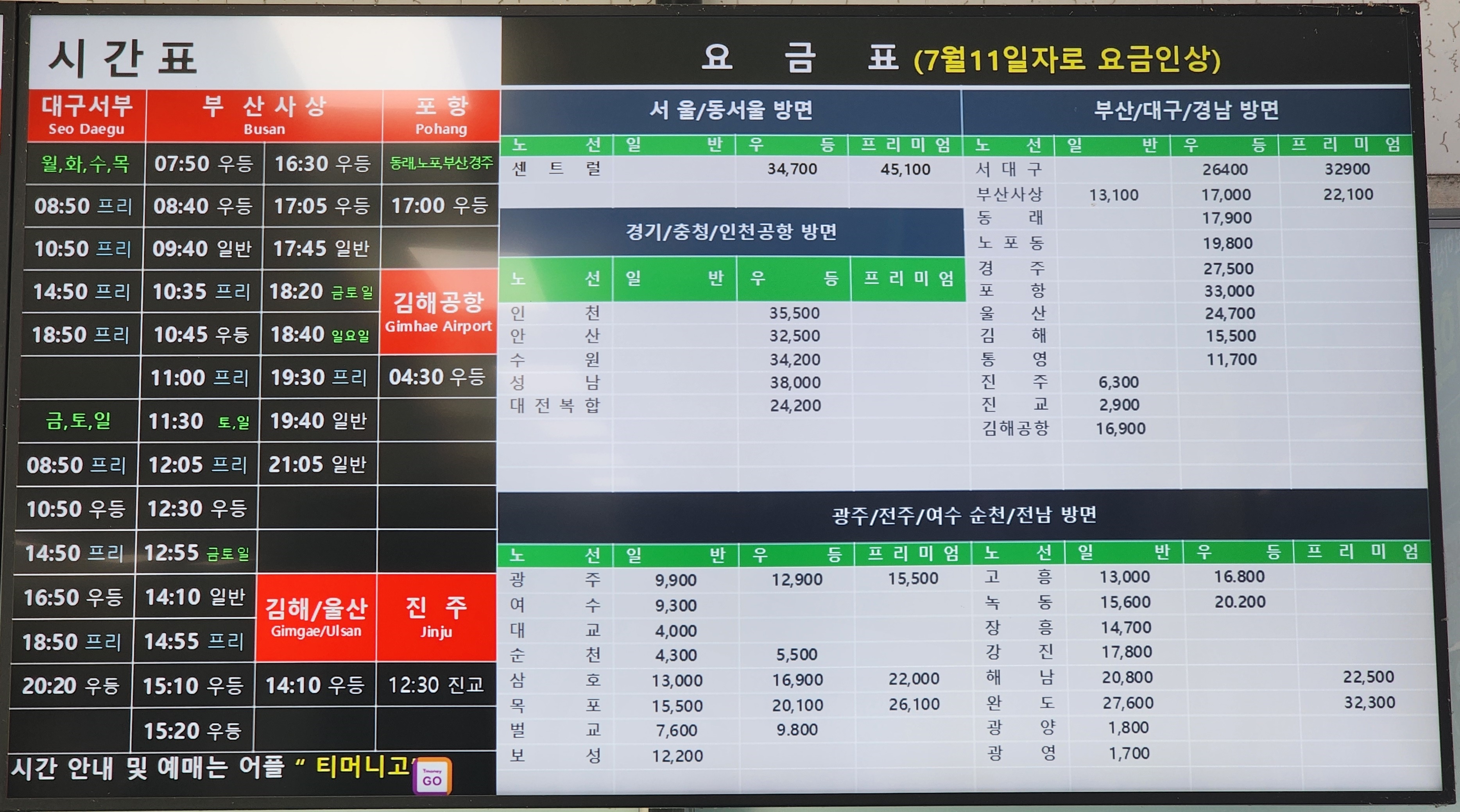동광양시외버스터미널 요금표.