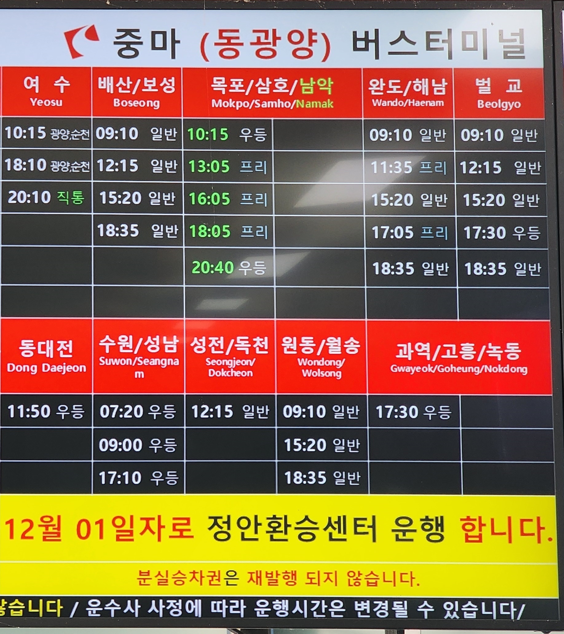 동광양 출발 여수, 배산, 보성, 목포, 삼호, 남악, 완도, 해남, 벌교, 동대전, 수원, 성남, 성전, 독천, 원동, 월송, 과여가 고흥, 녹동 방면.