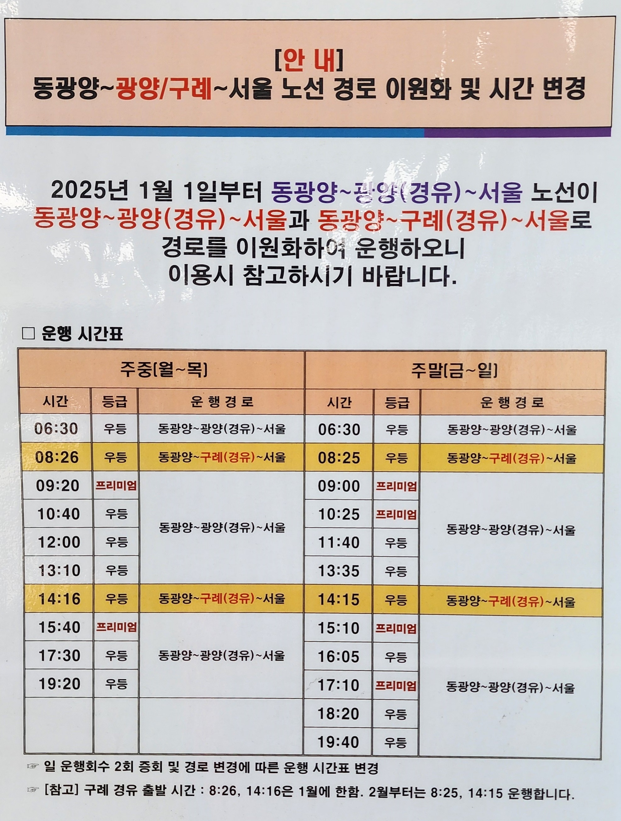 동광양~광양/구례~서울 노선 경로 이원화 및 시간 변경