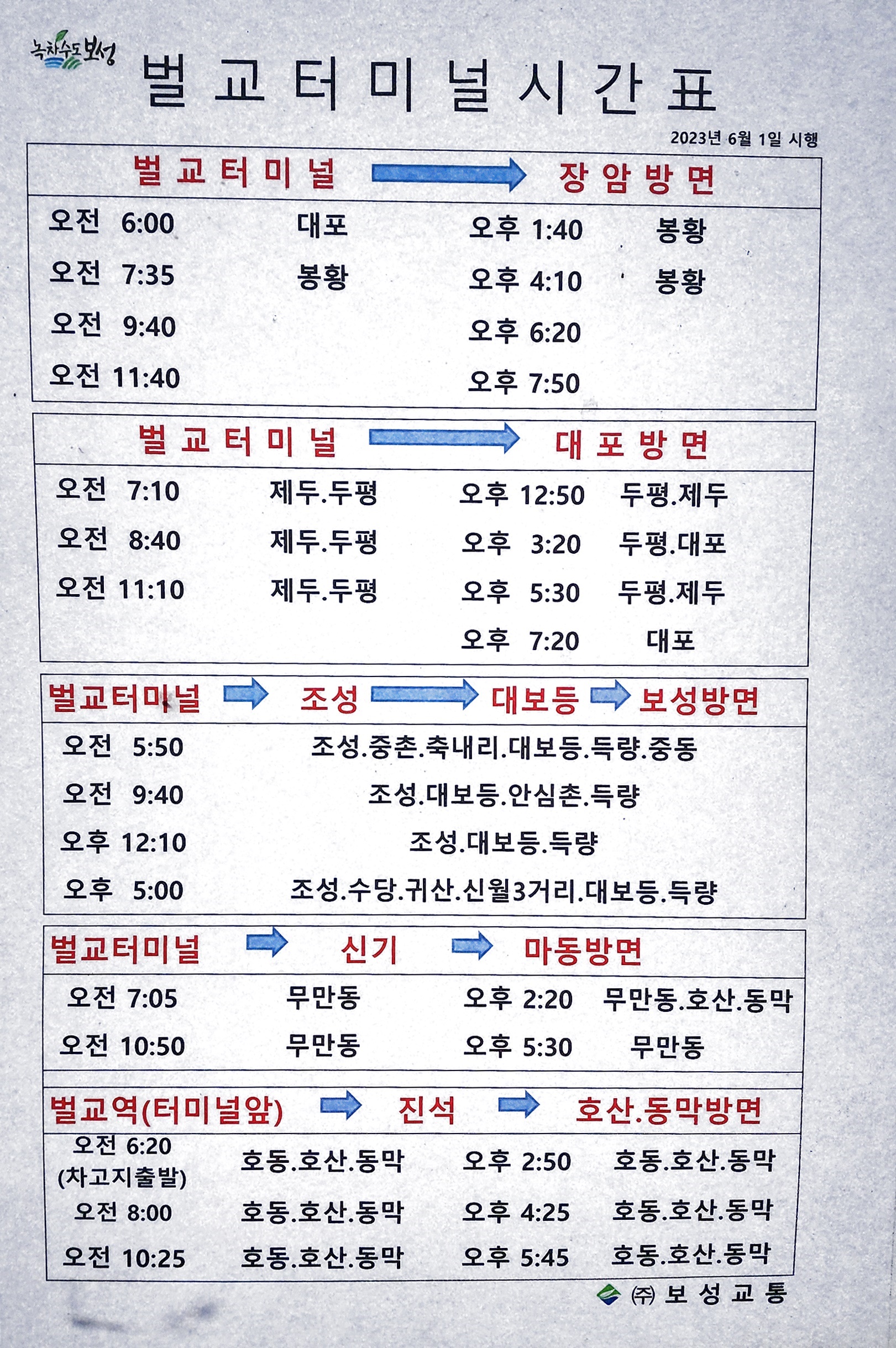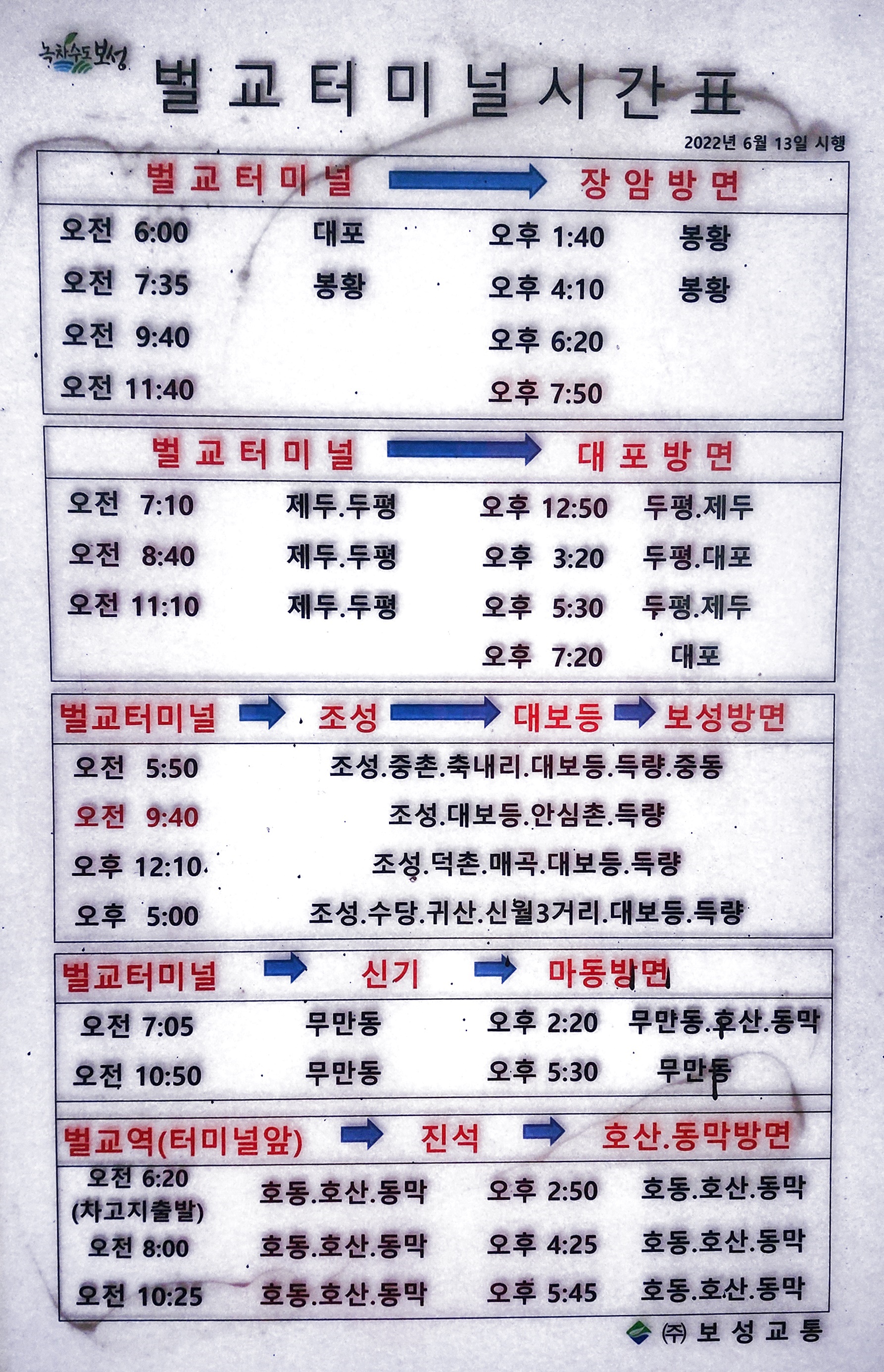 벌교 출발 장안, 대포, 조성, 대보동, 보성, 신기, 마동, 진석, 호산, 동막 방면.