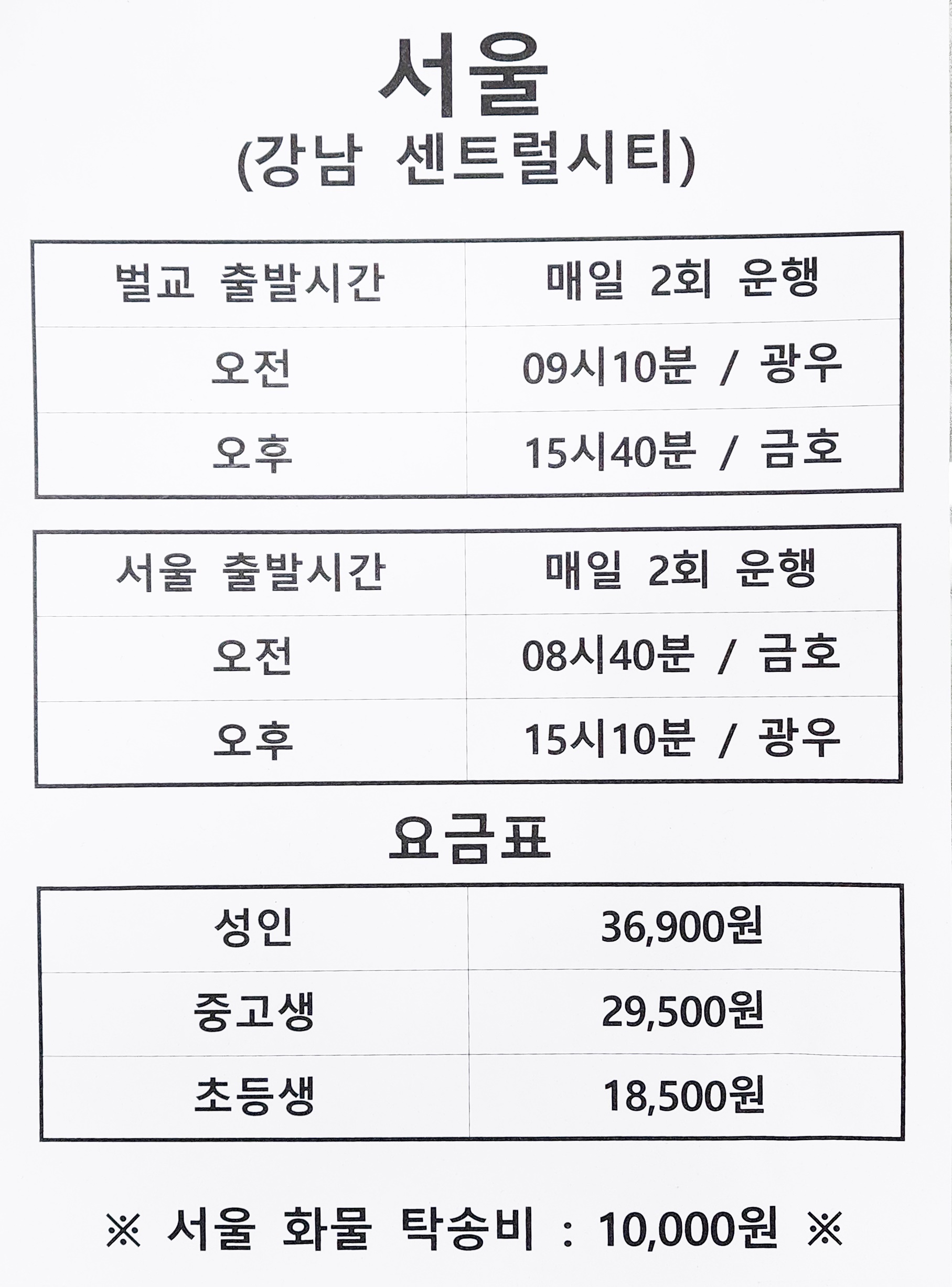 벌교 출발 서울 강남 센트럴시티 방면.
