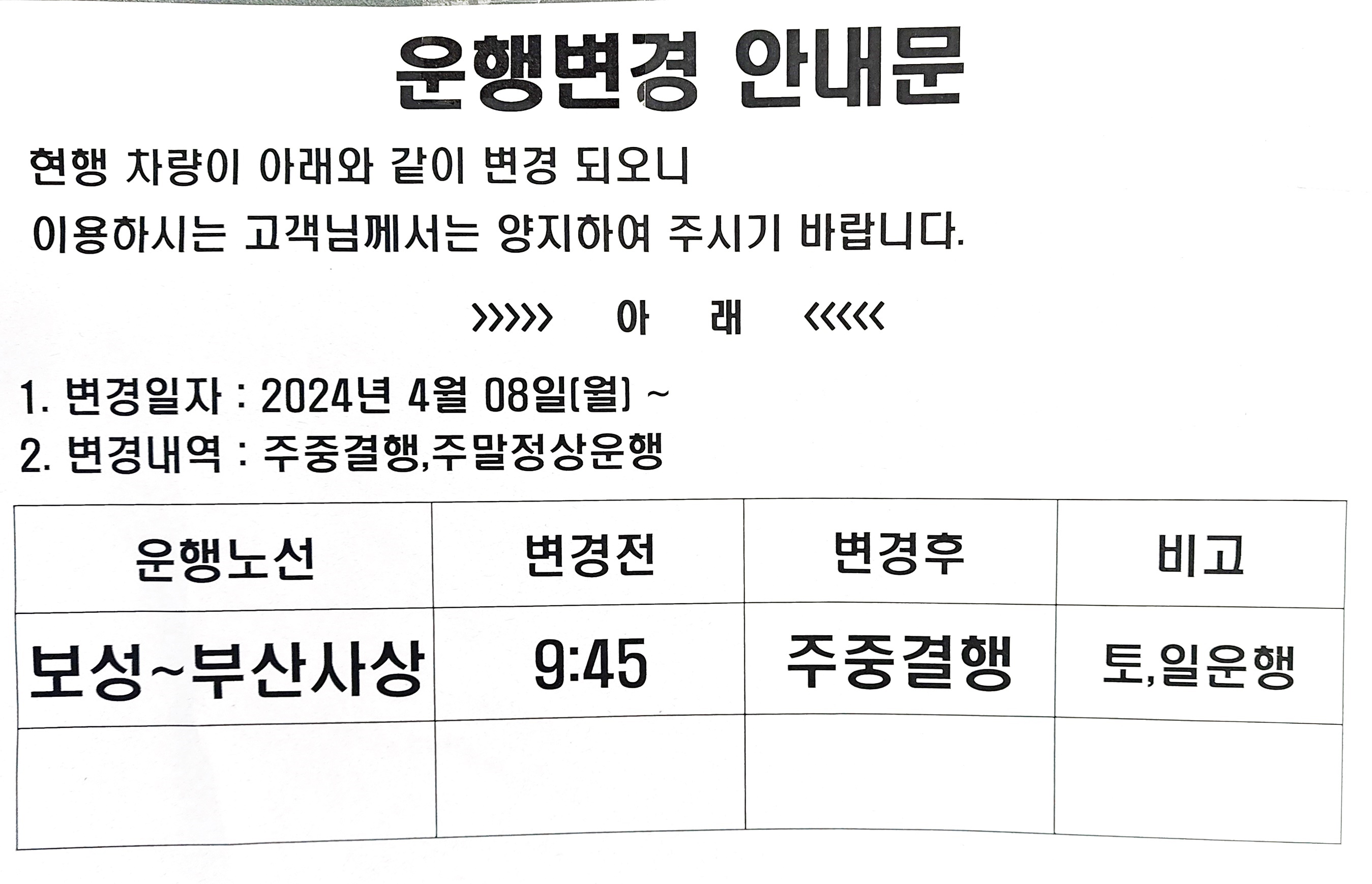 보성 출발 부산 사상 운행 변경