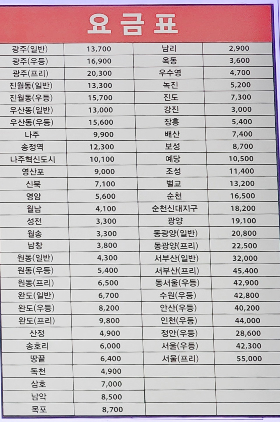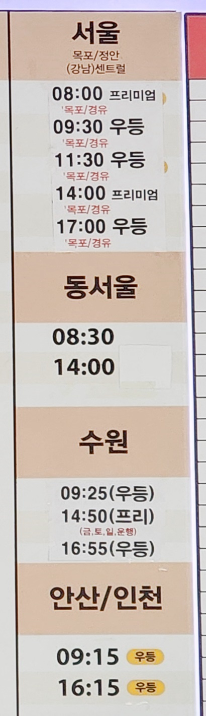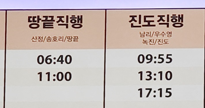 해남 출발 서울,동서울, 수원, 안산, 인천 방면.