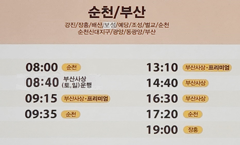 해남 출발 강진, 장흥, 배산, 보성, 예당, 조성, 벌교, 순천, 순천신대지구, 광양, 동광양, 부산 방면.