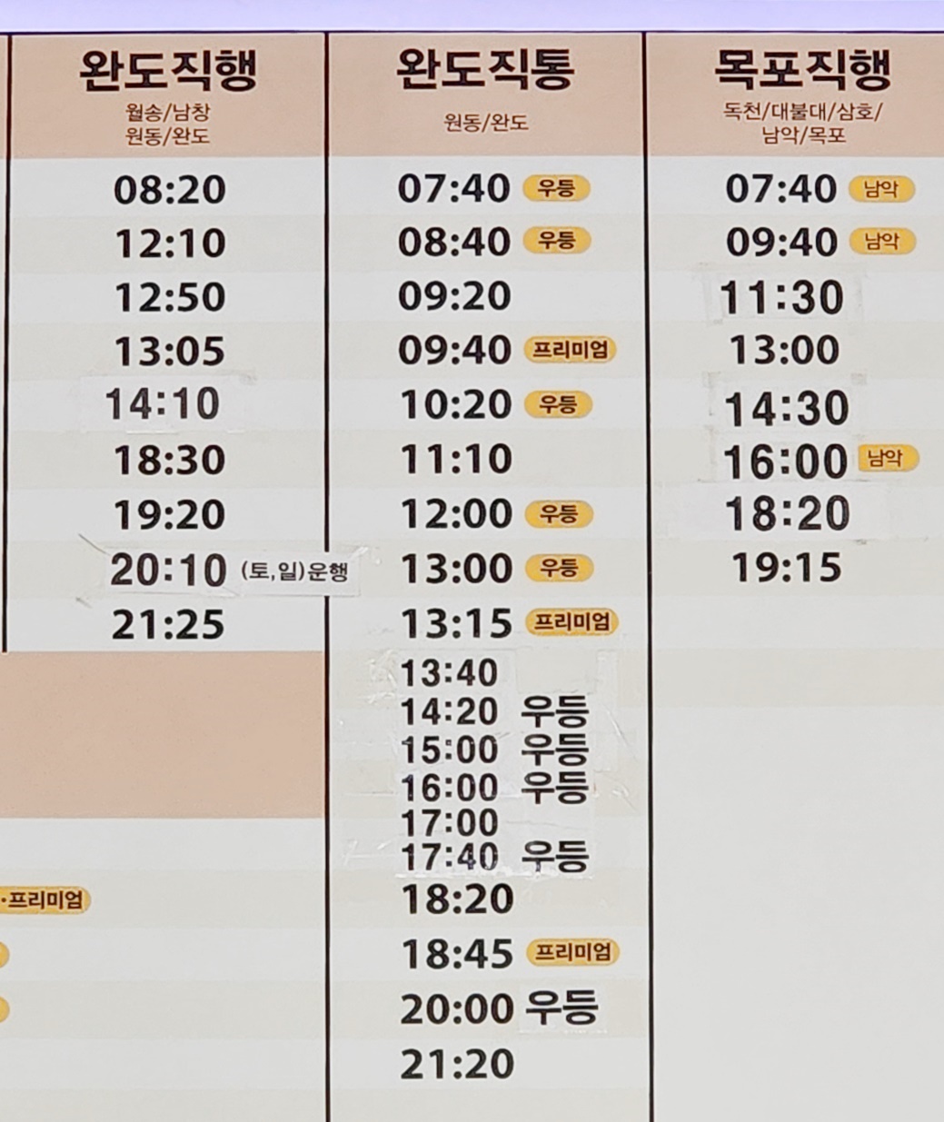 해남 출발 완도, 목포 방면.