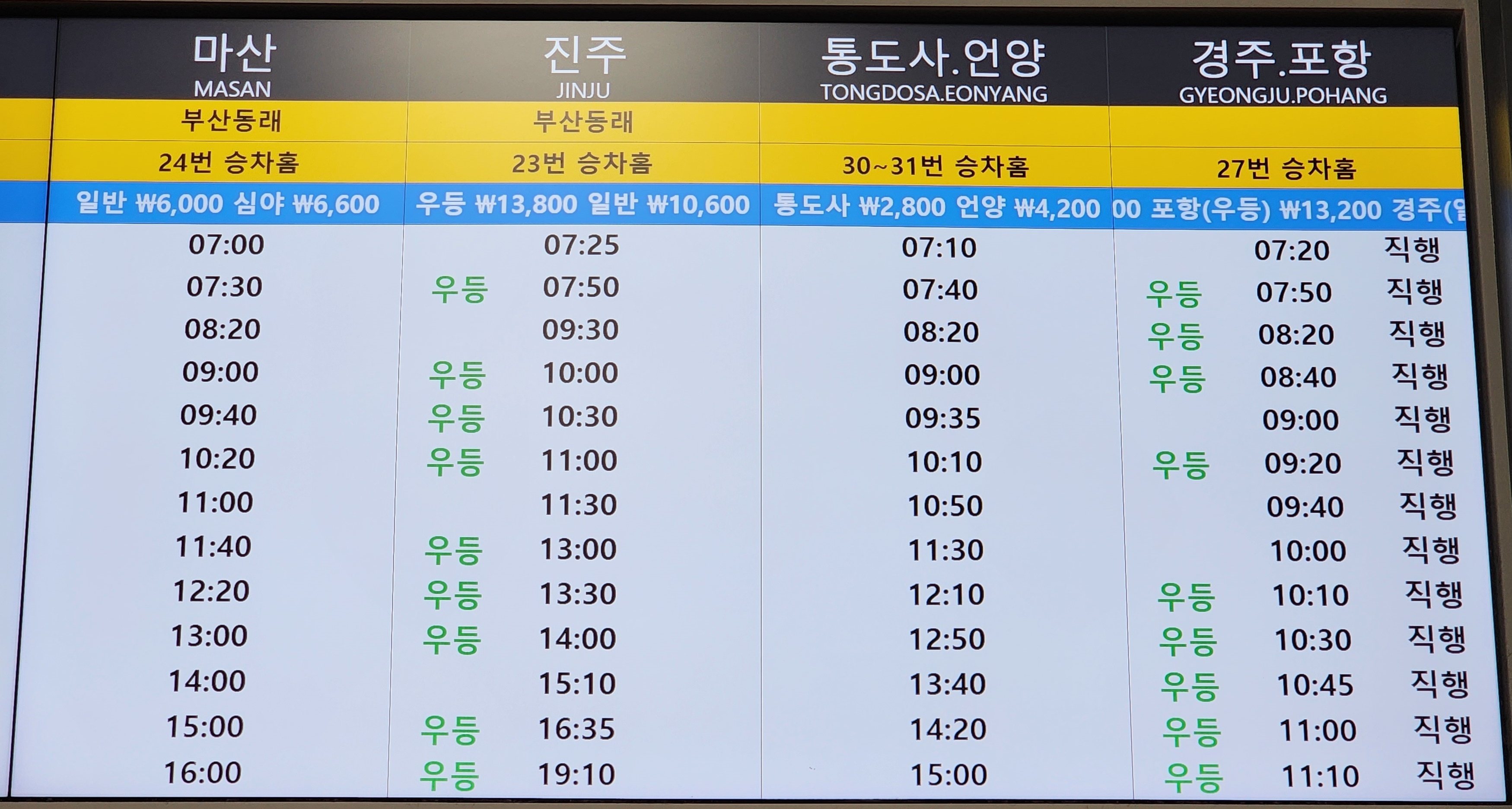 부산 출발 마산, 진주, 통도사, 언양, 경주, 포항 방면.