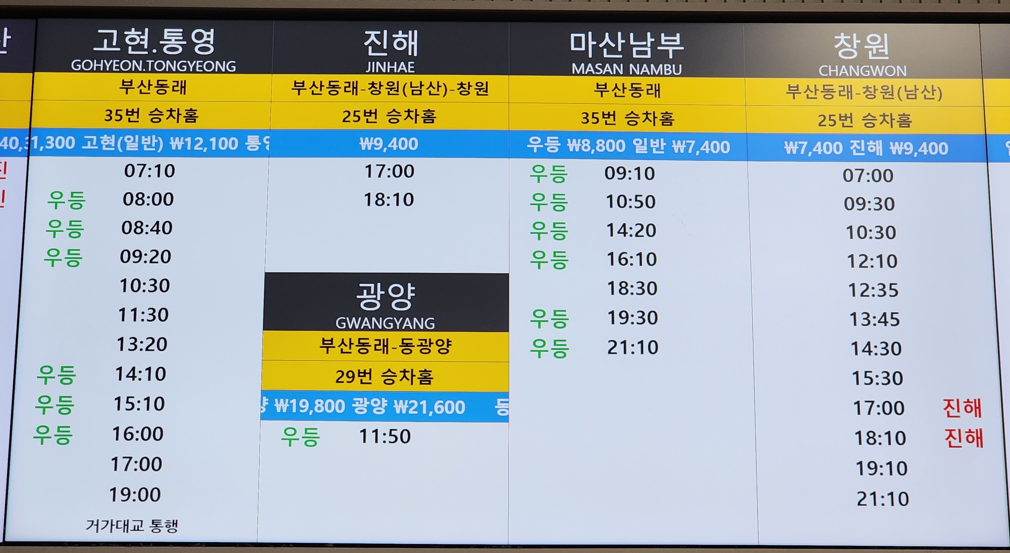 부산 출발 고현, 통영, 진해, 마산남부, 창원, 광양 방면.